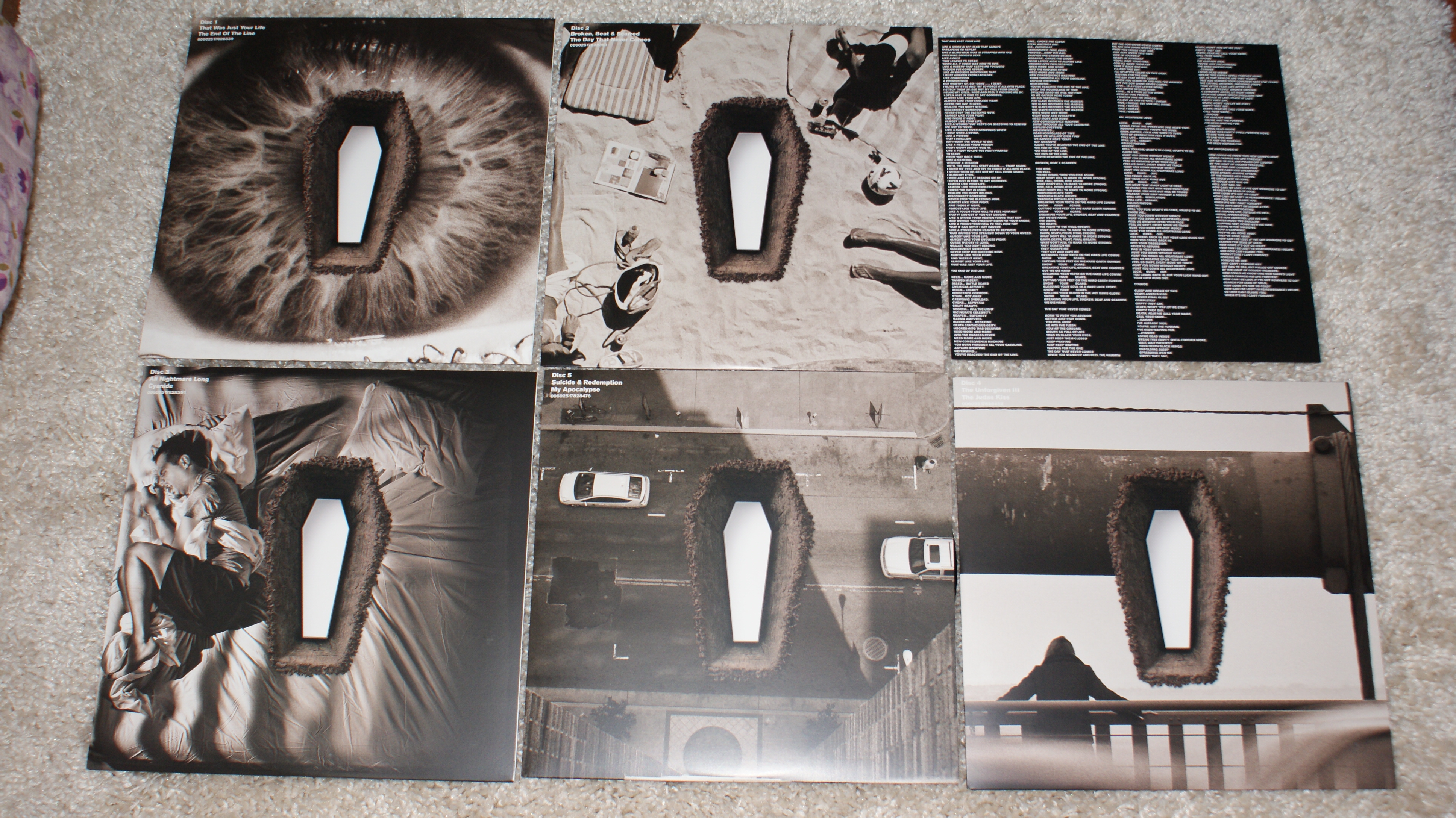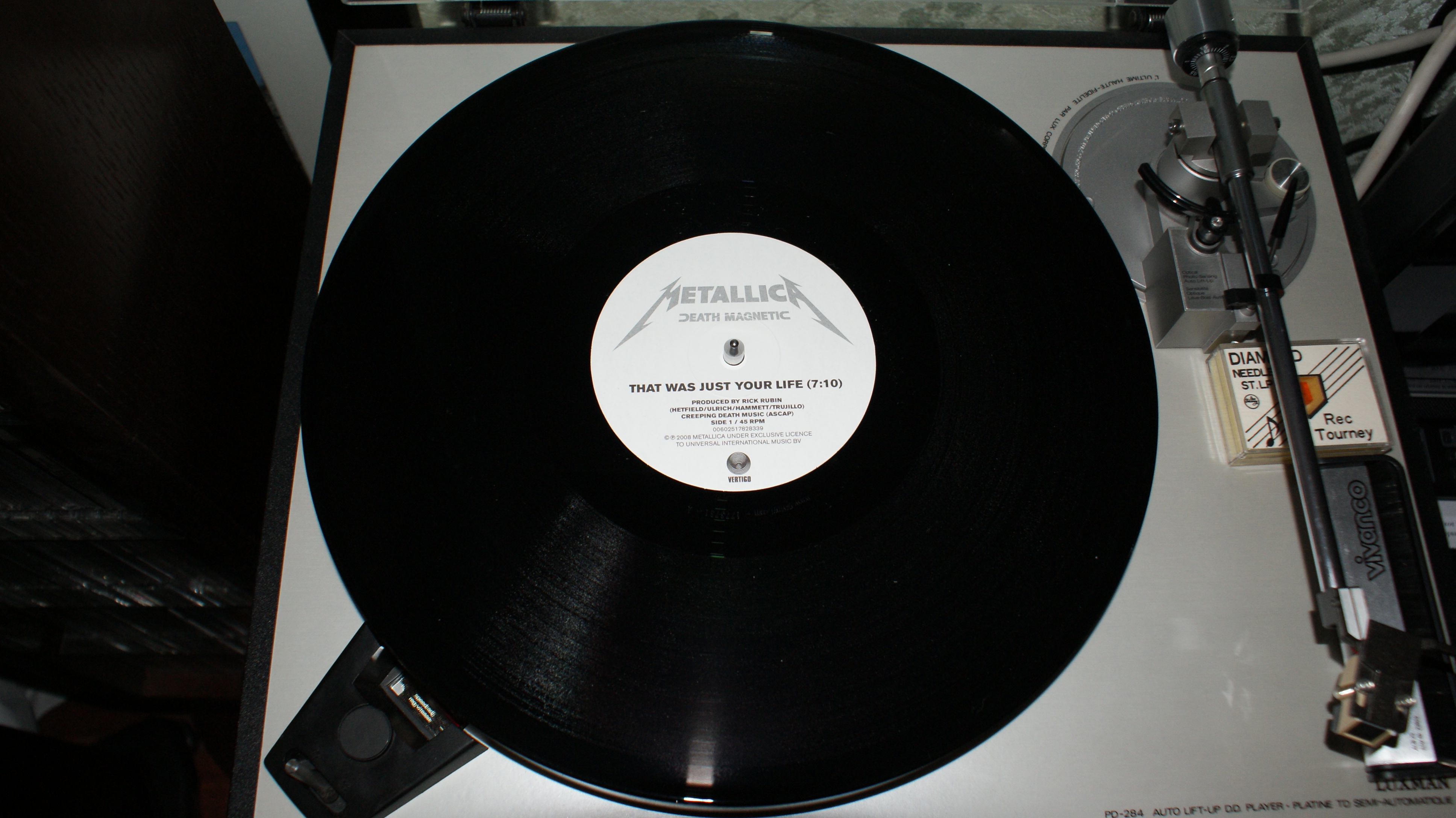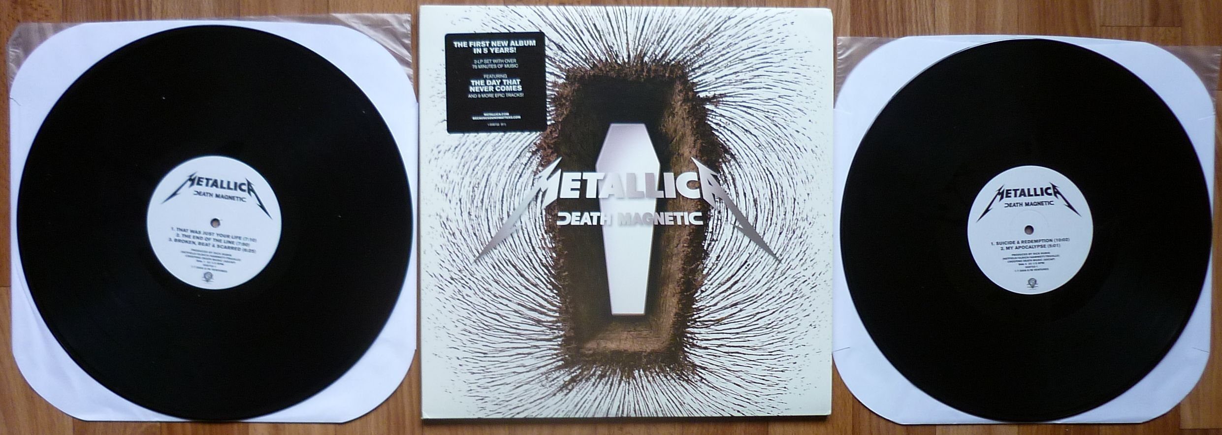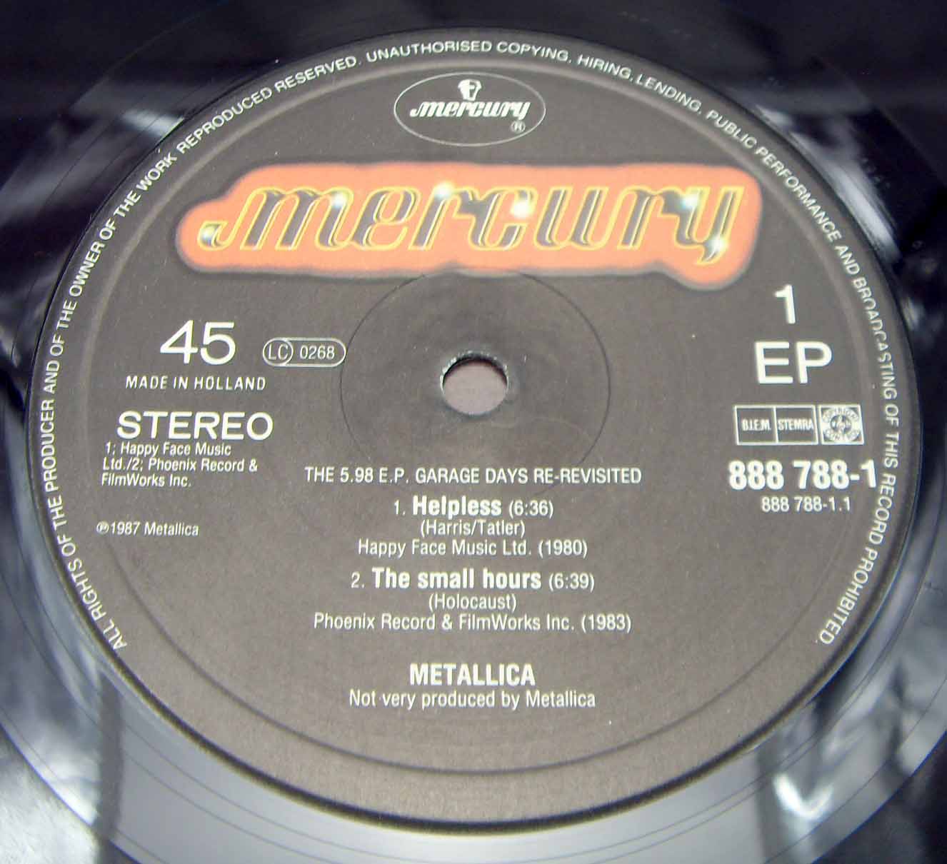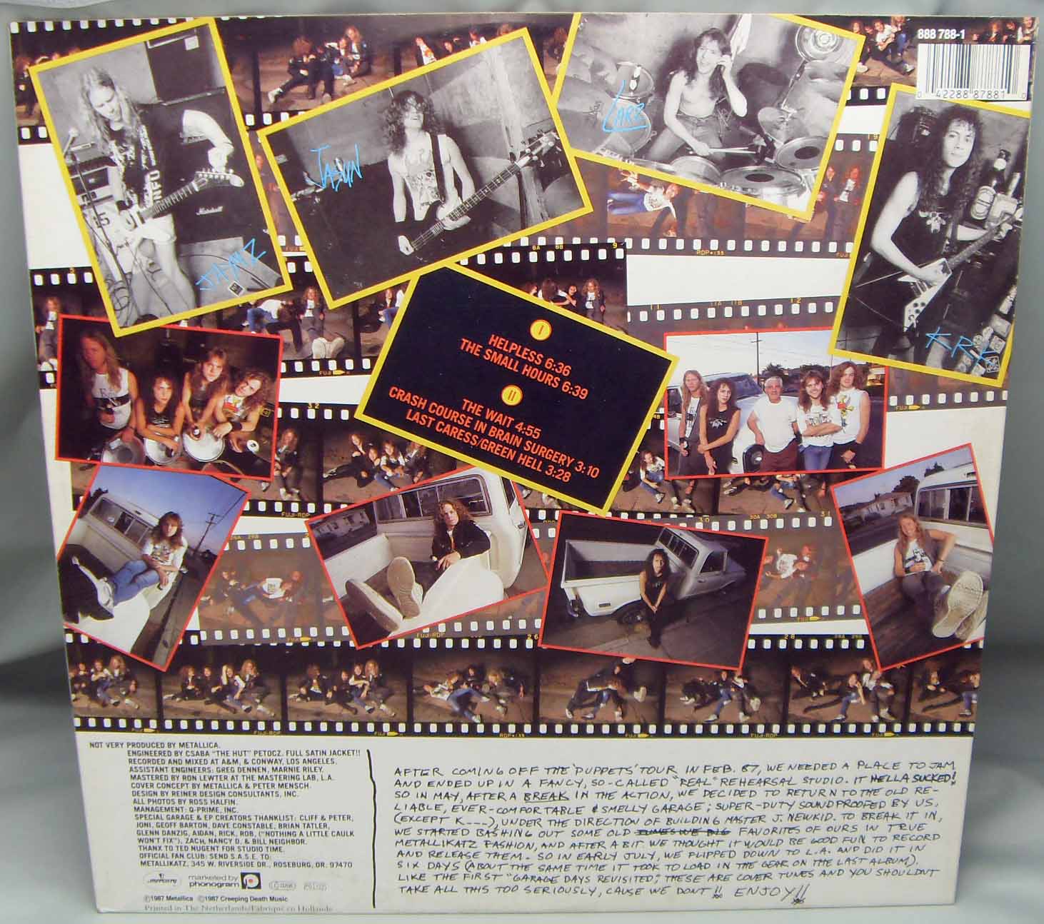 Металлику я тоже показываю как только появляется в моей коллекции.... Metallica – The $5.98 E.P. - Garage Days Re-Revisited Label: Vertigo – 888 788-1 Format: Vinyl, 12", EP, 45 RPM Country: Europe Released: 1987 Genre: Rock Style: Thrash Speed Metal Tracklist A1 Helpless 6:36 A2 The Small Hours 6:39 B1 The Wait 4:55 B2 Crash Course In Brain Surgery 3:10 B3 Last Caress/Green Hell 3:28