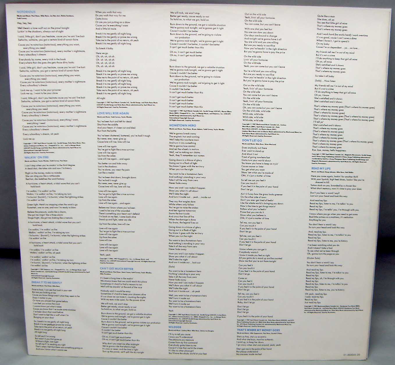 Жестянка легковесная ) Loverboy – Wildside Label: CBS – 460045 1 Format: Vinyl, LP Country: Netherland Released: 1987 Genre: Rock Style: Heavy Metal Tracklist A1 Notorious 4:38 A2 Walkin' On Fire 4:16 A3 Break It To Me Gently 4:36 A4 Love Will Rise Again 4:27 A5 Can't Get Much Better 4:02 B1 Hometown Hero 4:12 B2 Wildside 3:28 B3 Don't Let Go 3:35 B4 That's Where My Money Goes 4:13 B5 Read My Lips 5:01