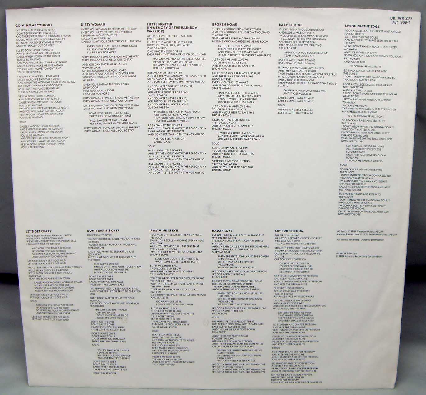 жестянка хардроко глэмовая ) White Lion – Big Game Label: Atlantic – 78 19691 Format: Vinyl, LP, Album Country: Germany Released: 1989 Genre: Rock Style: Hard Rock Tracklist A1 Goin' Home Tonight 4:59 A2 Dirty Woman 3:27 A3 Little Fighter 4:17 A4 Broken Home 4:45 A5 Baby Be Mine 4:10 A6 Living On The Edge 4:48 B1 Let's Get Crazy 4:50 B2 Don't Say It's Over 4:11 B3 If My Mind Is Evil 4:52 B4 Radar Love 6:02 B5 Cry For Freedom 6:08 Рецензия Darkside.ru Наряду с альбомом "Pride", "Big Game" вполне можно рассматривать как эталон чистоты жанра. Ничего подобного в мелодичном хард-роке не удавалось создать никому, кроме группы Europe на "Final Countdown". В то время, когда большинство групп выдавало набор проходных рок-н-роллов, сдобрив их парой-тройкой хитов в основном балладного типа, White Lion вновь удалось соединить в своей музыке умеренную тяжесть и прекрасные мелодии. А в целом - замечательный альбом.