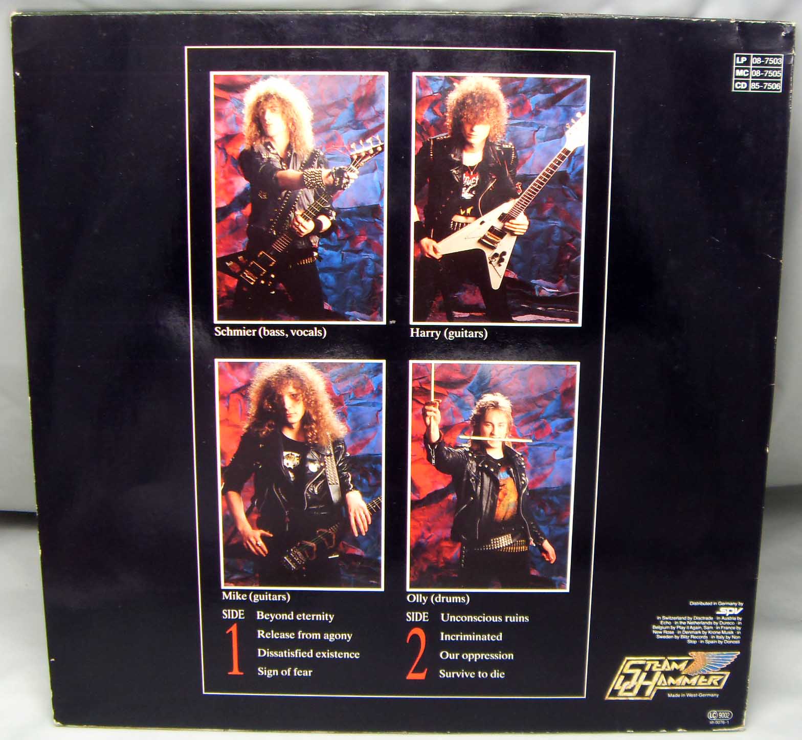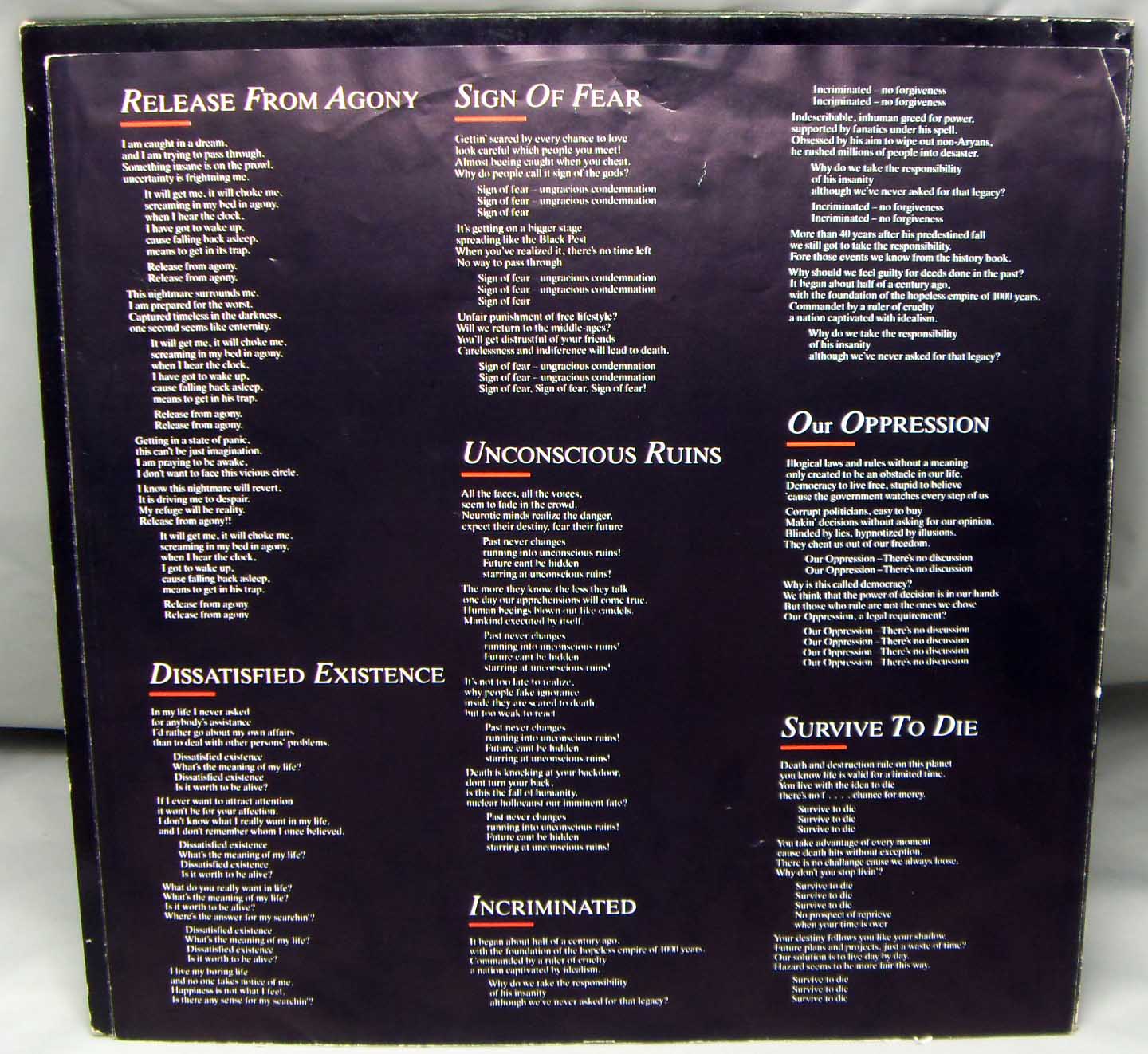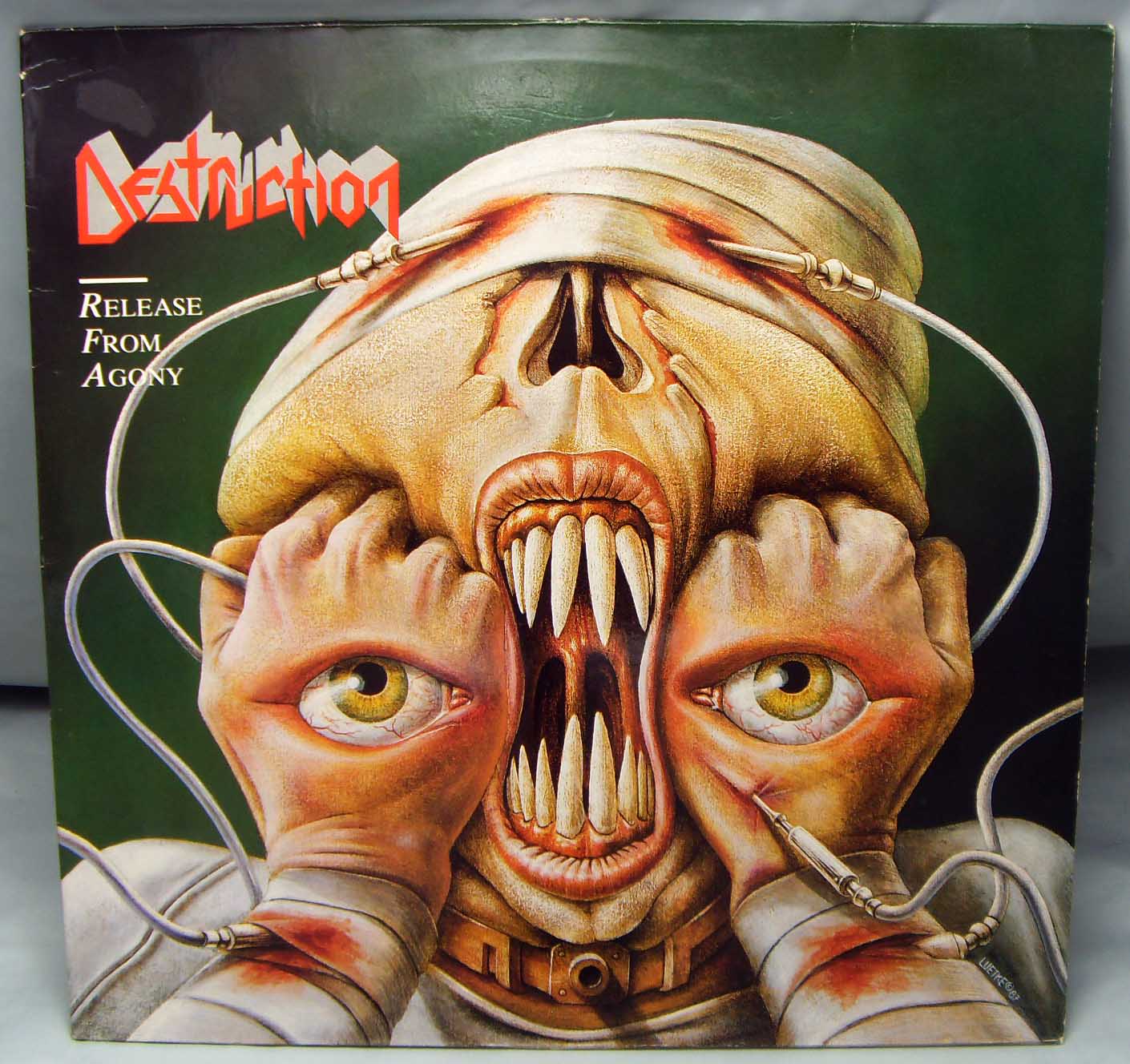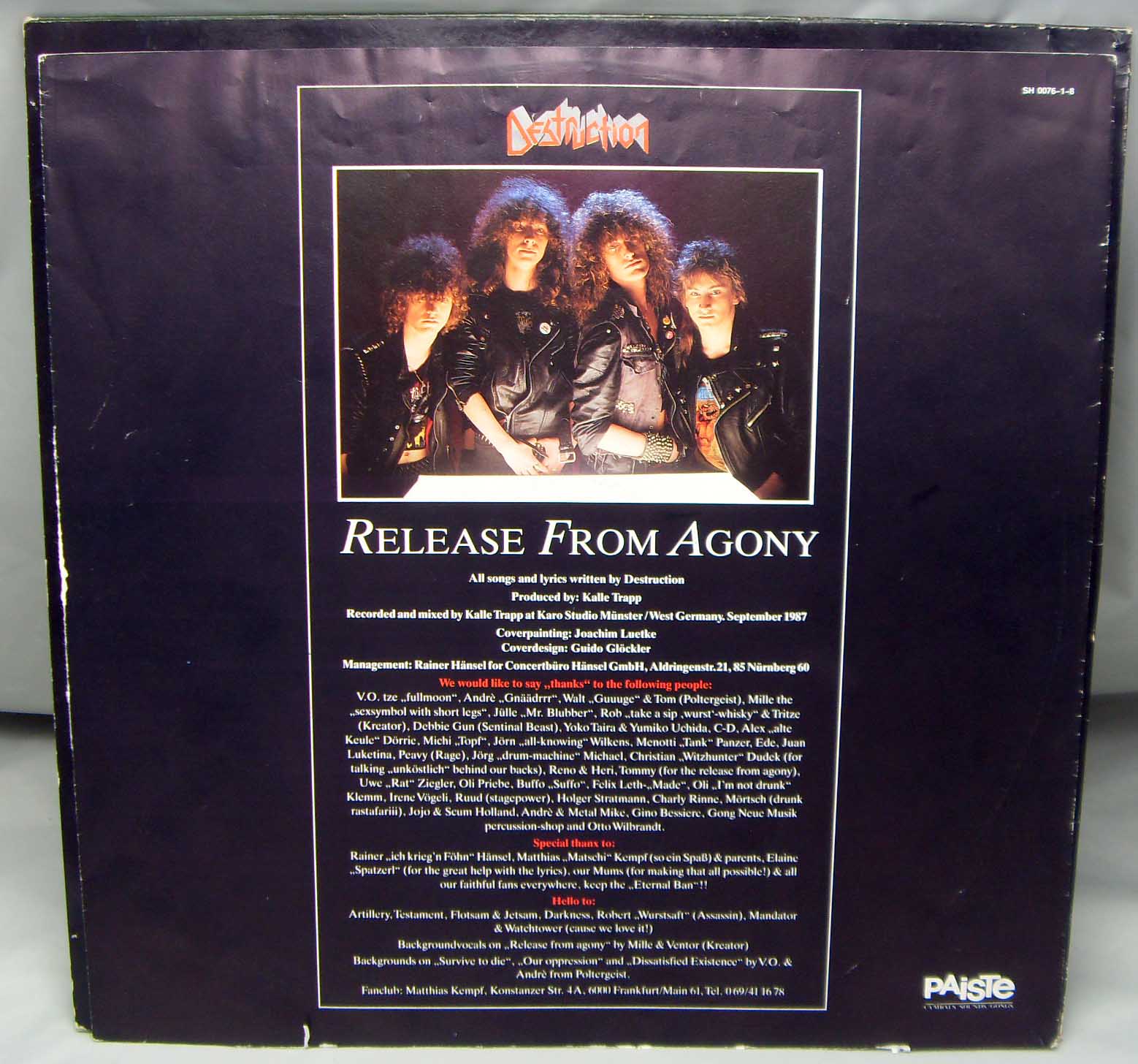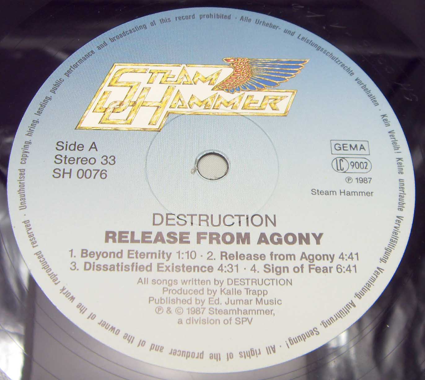 Железяка трэшевая классическая Destruction – Release From Agony Label: Steamhammer – SH 0076 Format: Vinyl, LP, Album Country: Germany Released: 1987 Genre: Rock Style: Thrash Tracklist A1 Beyond Eternity 1:10 A2 Release From Agony 4:41 A3 Dissatisfied Existence 4:31 A4 Sign Of Fear 6:41 B1 Unconscious Ruins 4:23 B2 Incriminated 5:19 B3 Our Oppression 4:47 B4 Survive To Die 5:30 Рецензия Darkside.ru Однозначно, один из крутейших альбомов трэш-спид-метала. А на тот момент, думаю, так вообще лучшее творение в этом стиле. Вот почему-то принято за таковой считать «Reign in Blood». Бесспорно, то был и есть отличный альбом – классика жанра, без каких-либо сомнений. Но все то, чем блещет этот слэйеровский диск, без труда можно найти и на немецком «Release from Agony». При этом тут еще есть и много чего такого, чем «Reign in Blood» явно не блещет. А именно. Альбом потрясающе разнообразен. На общем фоне тотального однообразия и вполне понятного для тех времен примитивизма трэш-спида середины 80-х, «Release from Agony» выделяется самым ярким образом. Здесь настолько все интересно и продумано и отработано, что мне совершенно непонятно, почему ярлык «трэш-альбом №1 в мире» навесили вовсе не на этот альбом? Музыка в целом такая же скоростная, как и типичный трэш того времени, но ребята явно не ставили себе цель (на мой взгляд, весьма сомнительной ценности) достичь рекордной скорости. Здесь до половины материала среднетемпового, местами даже медленного… Но самое главное, на альбоме все вещи – хиты. Нет ни одного трека, который не обладал бы запоминающимся сильным риффингом и мелодикой, интересными вокальными партиями, красивейшими гитарными соло, наконец. Вокал мне лично очень нравится. Будучи довольно брутальным для стиля, он совершенно не скован, не однообразен, разбавлен прикольными повизгиваниями. Но главное, у вокалиста вообще оригинальная манера пения – как будто он не поет, а выдавливает из себя звуки. Игра также без претензий – четко, слаженно, и при этом красиво. Ударник запоминается узнаваемой манерой и оригинальным мягким звучанием. И композиционно все просто здорово: вещи довольно сложны, но без явного перебора. Чисто скоростных композиций нет, все построено на сочетаниях смен ритма (по 3-4 в каждой вещи), но сыграно все это, как единый монолит.