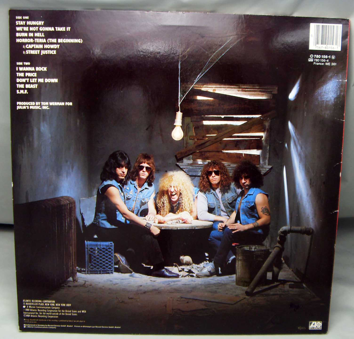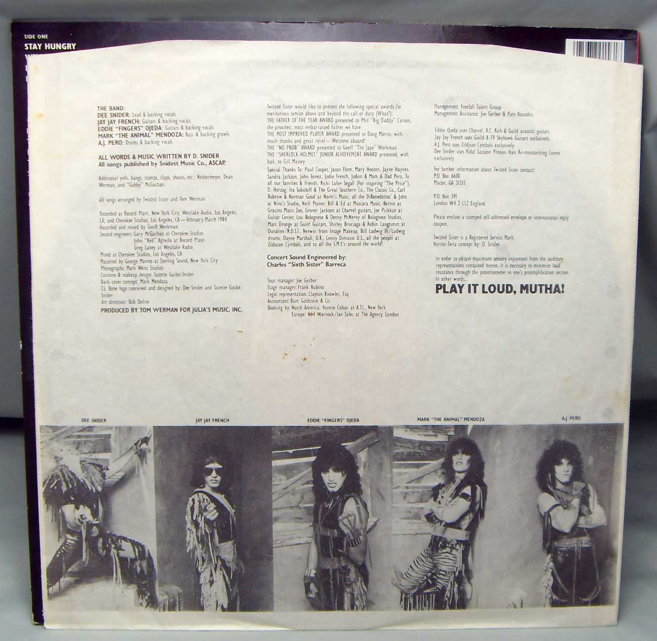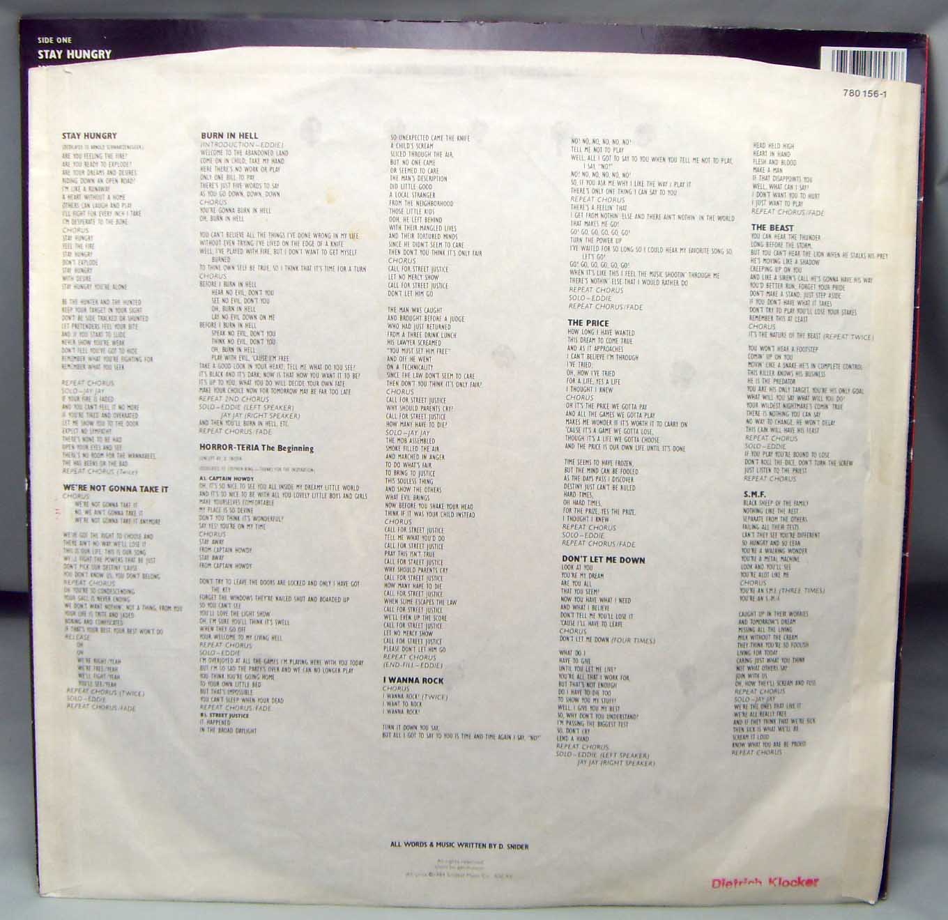 железяка гламурно хэвиметаллическая Twisted Sister – Stay Hungry Label: Atlantic – 780 156-1 Format: Vinyl, LP, Album Country: Germany Released: 1984 Genre: Rock Style: Heavy Metal, Hard Rock, Glam Tracklist A1 Stay Hungry 3:03 A2 We're Not Gonna Take It 3:38 A3 Burn In Hell 4:53 A4 Horror-Teria (The Beginning) 7:45 A4a Captain Howdy A4b Street Justice B1 I Wanna Rock 3:06 B2 The Price 3:48 B3 Don't Let Me Down 4:26 B4 The Beast 3:30 B5 S.M.F. 3:00 Рецензия Darkside.ru Американская группа Twisted Sister образовалась ещё в начале семидесятых годов и занималась тем, что играла каверы в стиле глэм рок, не имея ни альбома, ни контракта. Популярность же к группе пришла только когда она выпустила рассматриваемый альбом, хотя до этого уже имела два студийных диска. Именно с дебютного альбома «Under The Blade» и началось правление в Сестрёнках легендарного человека Ди Снайдера, который своим уникальным талантом сочинять отличные песни, а также созданием книги для молодёжи, прославился на всю свою жизнь. Вокал Ди Снайдера тоже является одним из обязательных элементов музыки коллектива – он несколько грубоват и подвержен хрипотце, но кроме того обладает красивым глубоким тембром, таким, каким принято называть хард роковый вокал. Итак, «Stay Hungry» стал самым лучшим альбомом, вершиной творчества и успеха банды, носящей довольно-таки претензионное название. Качество записи, конечно же, не уверенное, сыроватое и из-за этих огрехов кажущееся легковесным, хотя это только наполовину правда. Исполняет группа породистый и классический хард-н-хэви наподобие Оззи Осборна, Элиса Купера, Скорпионс и др. Именно на этот период припало время её самых тяжёлых альбомов, поскольку первые два были до ломоты в зубах пресным хард роком. Лирика на альбоме носит и представляет собой классический хэви характер и рассказывает о разных вещах, будь то право на свободу, любовь, бунт или даже адские муки, а также типичные представители в виде тем о рок-н-ролле, хотя именно эти темы у Сестричек выходят лучше всего. Обложка альбома сделана весьма забавно, как бы подтверждая название диска, Ди Снайдер озверело сжимает в руках огромную кость. Несмотря на слабое и плохое качество записи, мелодическая составляющая диска является неоспоримой классикой тяжёлого рока и шедевром музыкального мастерства. Такие композиции как открывающая ураганная «Stay Hungry», следующая за ней революционно-повстанческая «We’re Not Gonna Take it», мистическая и мрачная «Burn In Hell», драйвовая «I Wanna Rock», и медленная, балладная «The Price» золотыми буквами вписаны в мировую классику металла. В отдельности нужно выделить интересный семиминутный эпик «Horror Teria», где Сёстры решили показать, что могут делать не просто крутые боевички, но и сложные вещи с намёком на концептуальность и прогрессивность. В целом, альбом просто великолепный, абсолютно лишённый минусов и недостатков, а его составляющая сводит на нет все огрехи в качестве записи. Это именно та ситуация когда музыкальное полотно является вечным творением, обёрнутым в повреждённую и старую материю. Только самая высшая оценка…