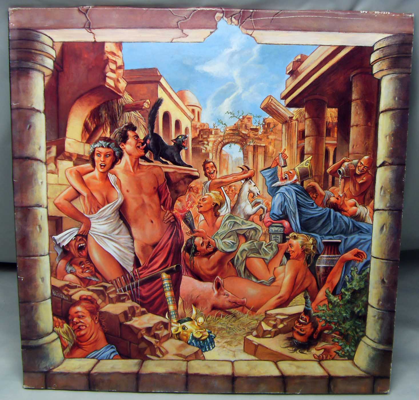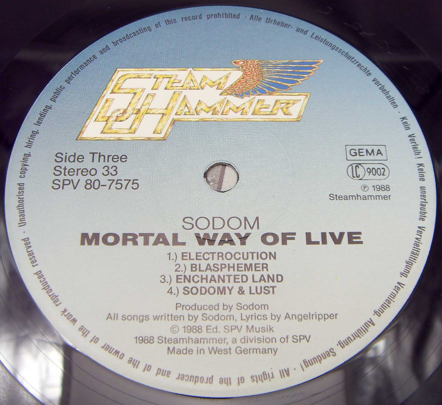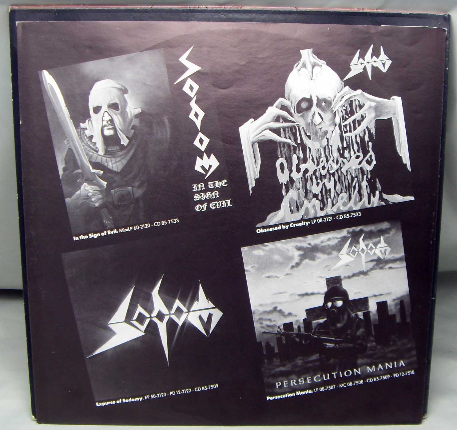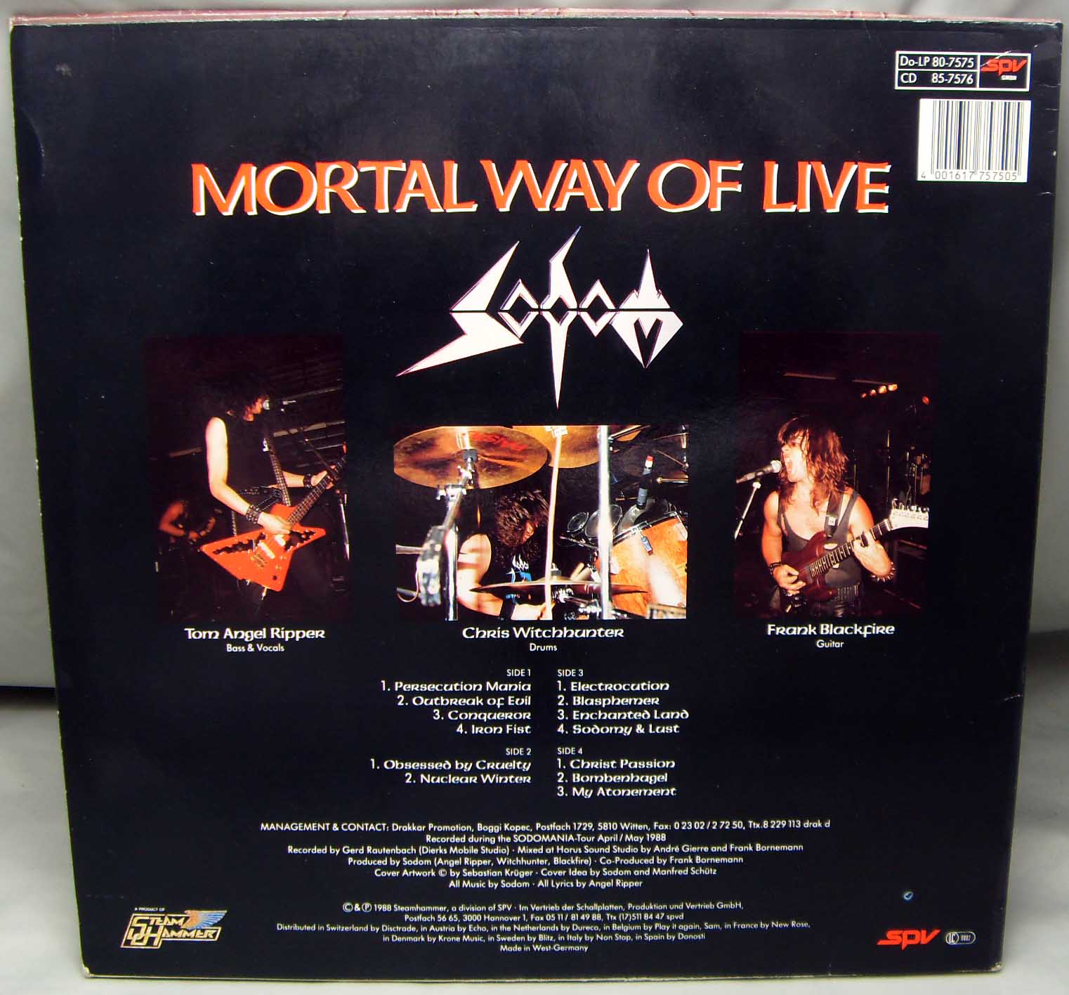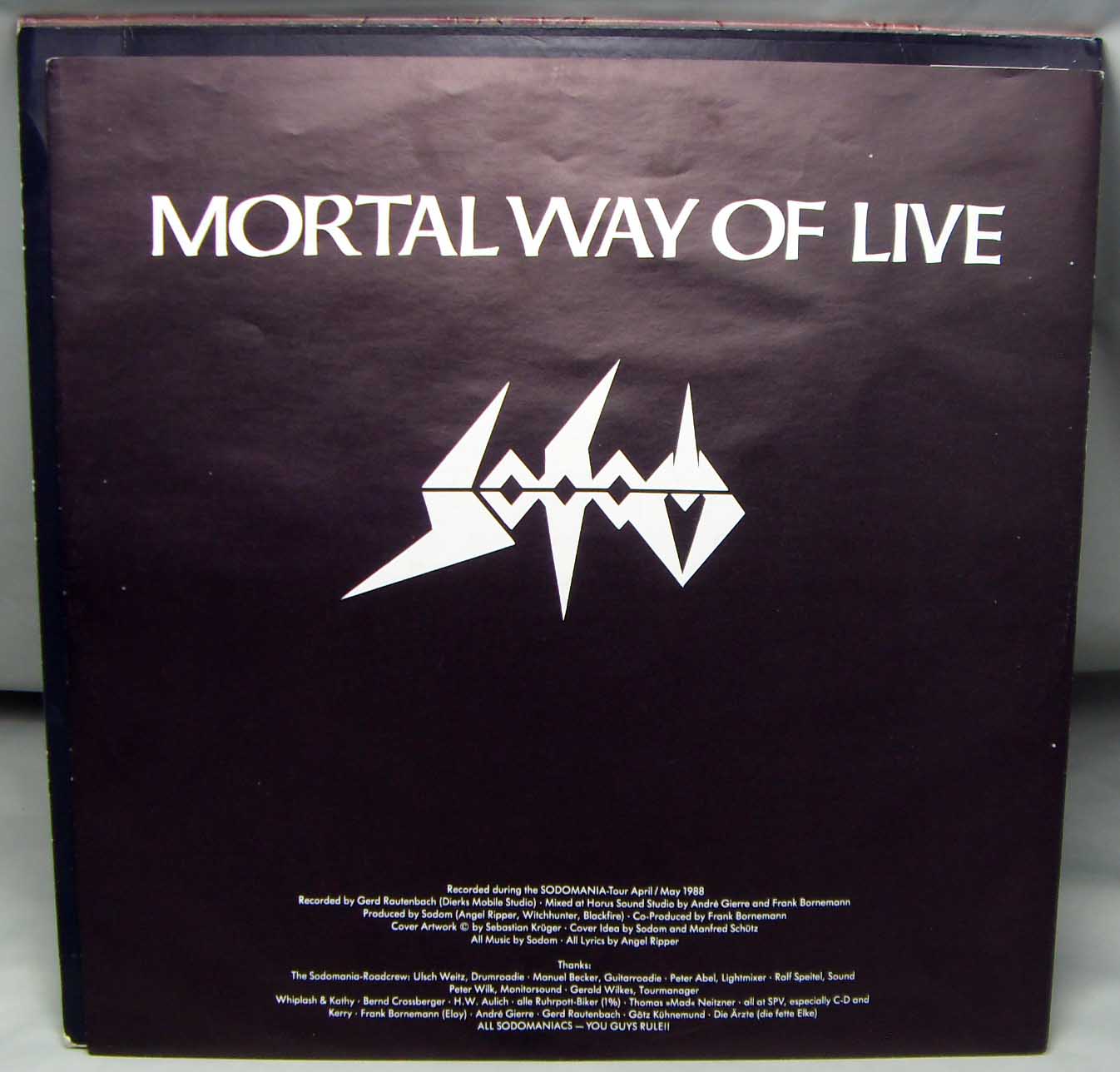 Железяка содомно - гоморная, концертная Sodom – Mortal Way Of Live Label: Steamhammer – SPV 80-7575 Format: 2 × Vinyl, LP, Album Country: Germany Released: 1988 Genre: Rock Style: Thrash Tracklist A1 Persecution Mania 4:44 A2 Outbreak Of Evil 3:46 A3 Conqueror 3:00 A4 Iron Fist 2:56 B1 Obsessed By Cruelty 8:54 B2 Nuclear Winter 5:55 C1 Electrocution 3:06 C2 Blasphemer 6:00 C3 Enchanted Land 4:15 C4 Sodomy & Lust 5:02 D1 Christ Passion 6:24 D2 Bombenhagel 6:40 D3 My Atonement 5:57 Рецензия Darkside.ru В одном журнале, при рецензии на альбом группы Regurgitate – «Sickening Bliss» говорилось: «Достаточно одно взгляда на обложку, чтобы рука сама потянулась к кошельку». Когда глядишь на обложку данного концертника, рука тянется вообще все деньги отдать, ибо такую «красоту» мало у кого встретишь. Первый официальный концертный релиз “содомитов” получился на загляденье. Под красочной облогой слушателя ожидает прилично записанное (не без огрехов, конечно) выступление группы, проходившее в поддержку альбома «Persecution Mania», и не удивительно, что он был сыгран почти весь, ибо играть песни с предыдущих двух релизов как-то не солидно (исключение составляют «Blasphemer» и «Obsessed by Cruelty»). Сыграно всё очень прилично, с редкими, но меткими интересными находками Тома и компании (2-минутное виртуозное гитарное вступление к песне «Blasphemer» чего стоит). Минусов практически нет, за исключением некоторых огрехов со звучанием (иногда неприятно уши резало). Очень радует тот факт, что вышел релиз очень вовремя, ибо дальше пошли довольно унылые работы, наличие песен с которых могло основательно подпортить впечатление.