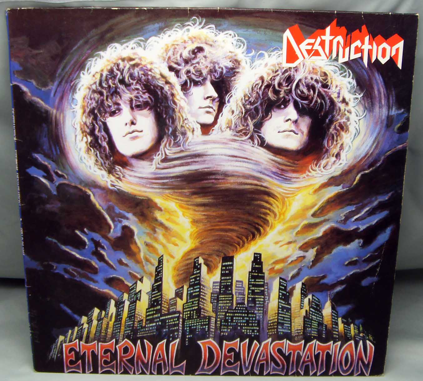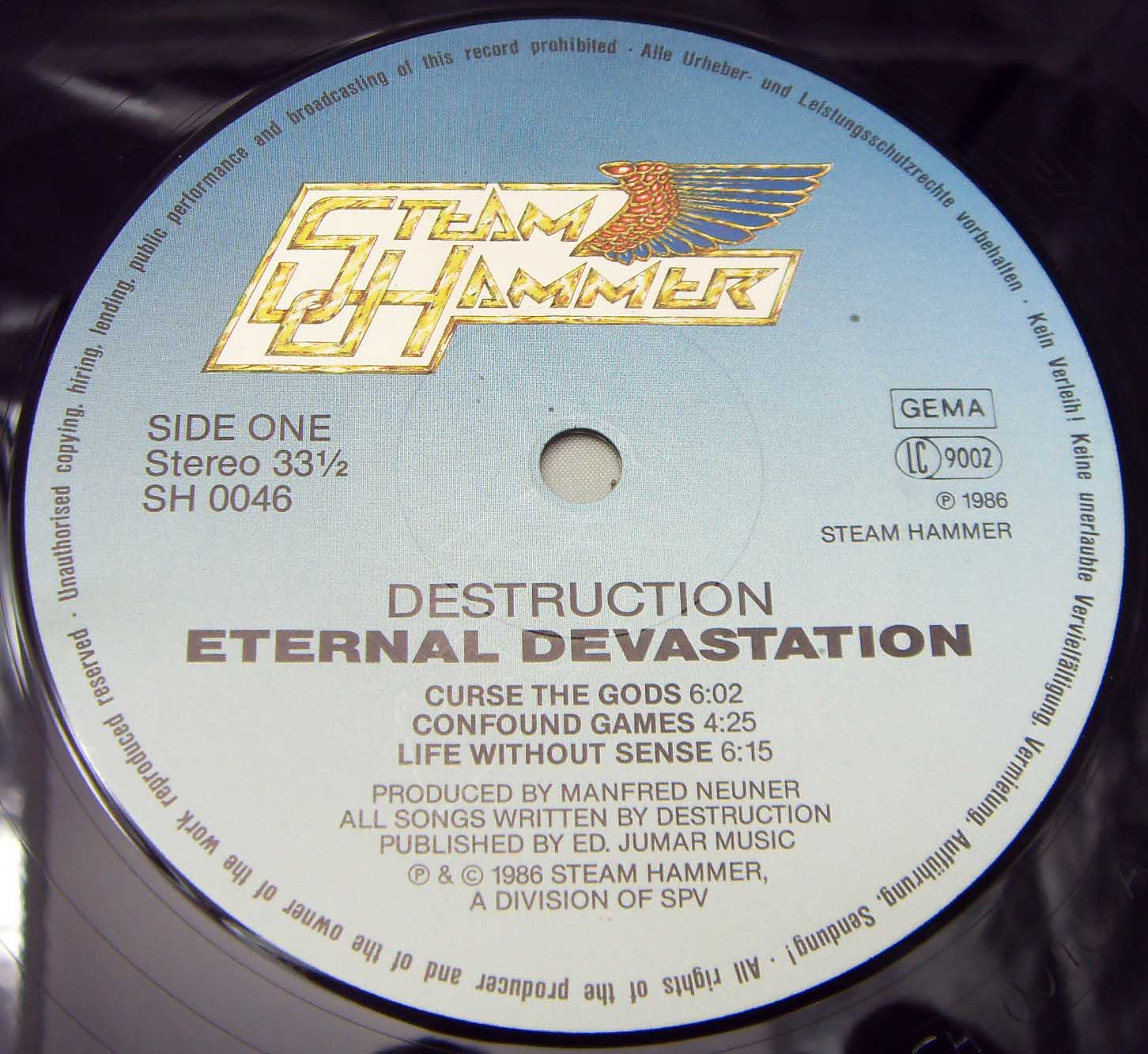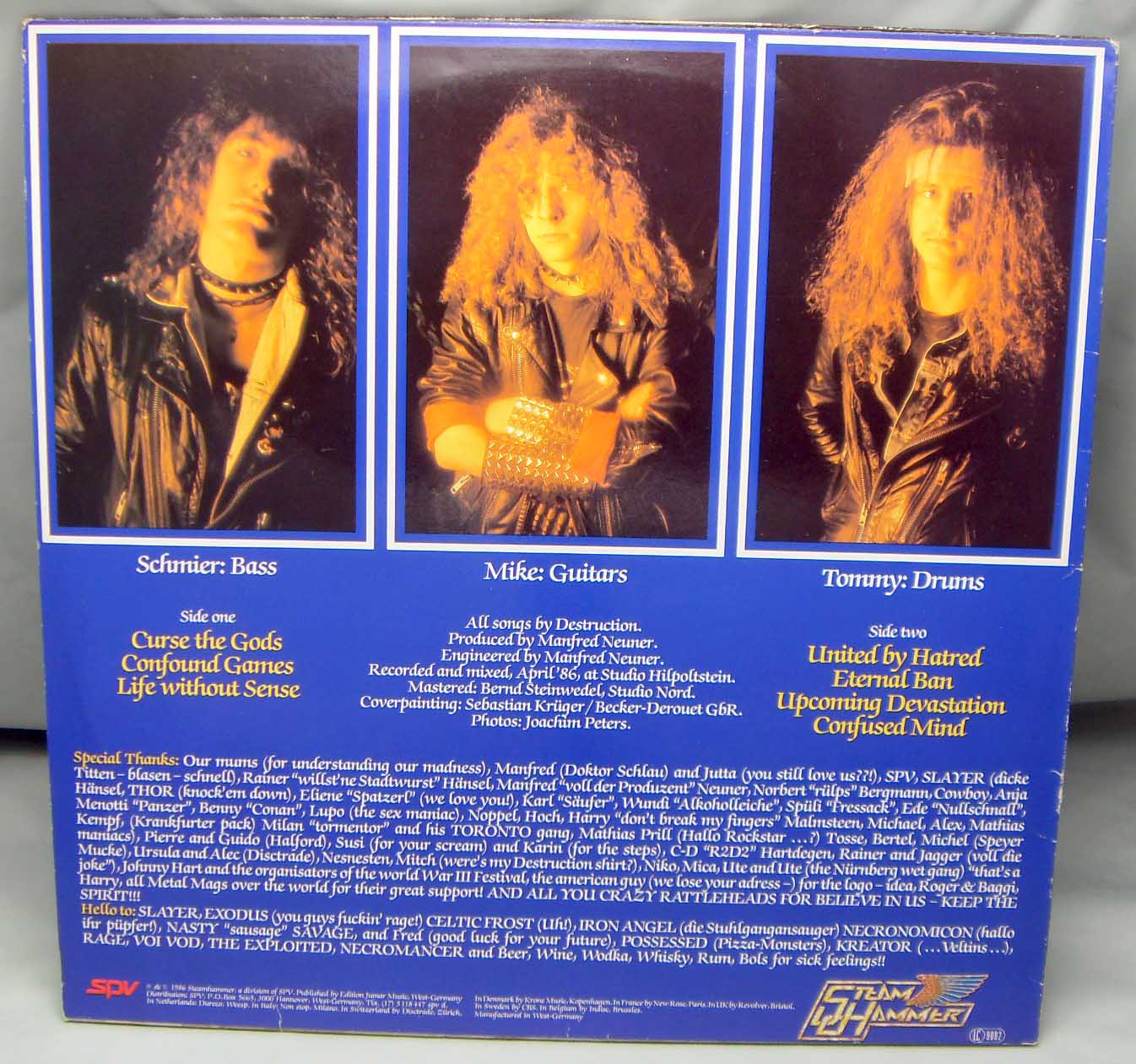 Железяка спид - трэшевая классическая Destruction – Eternal Devastation Label: Steamhammer – SH 0046 Format: Vinyl, LP, Album Country: Germany Released: 1986 Genre: Rock Style: Thrash, Speed Metal Tracklist A1 Curse The Gods 6:02 A2 Confound Games 4:25 A3 Life Without Sense 6:15 B1 United By Hatred 4:58 B2 Eternal Ban 3:33 B3 Upcoming Devastation 4:00 B4 Confused Mind 5:30 Рецензия Darkside.ru Пожалуй, не самая признанная команда тевтонского трэш-метал, значительно уступающая в популярности таким именитым коллективам как Sodom и Kreator, дающая, однако, самое наглядное представление о музыкальных традициях европейской металлической сцены. Творчество Destruction в 80-х годах отличалось несколько иным, более прогрессивным подходом, несмотря на то, что и их не минуло увлечение первой волной блэк-метал, связанное, прежде всего, с недостаточно высокими на том этапе техническими скиллами Шмира и Ко. Немаловажный момент — совершенно отсутствует влияние хардкор-панка, в отличие от американских команд, так что любители традиционной долбёжки, скорее всего, будут несколько разочарованы. Колючий, очень сухой, резкий, "бензопильный" звук, изрядное влияние speed metal (характерная черта европейской трэш-метал-традиции), Шмир демонстрирует не только диапазон своего голоса, но и немалый алкогольный стаж, немилосердно хрипя и местами заливаясь аки соловей (разбойник). По мнению многих поклонников, "Eternal Devastation" является лучшей пластинкой группы, а некоторые даже возводят её в статус культовой. Конечно, не стоит делать скоропалительных выводов, но, тем не менее, альбом заслуживает внимания по причине его знаковости, являясь своеобразной компиляцией наработок тевтонского thrash metal, внушая уважение и доверие к группе, обретшей свой узнаваемый стиль вкупе со всё больше проглядывающей прогрессивностью в творчестве.
