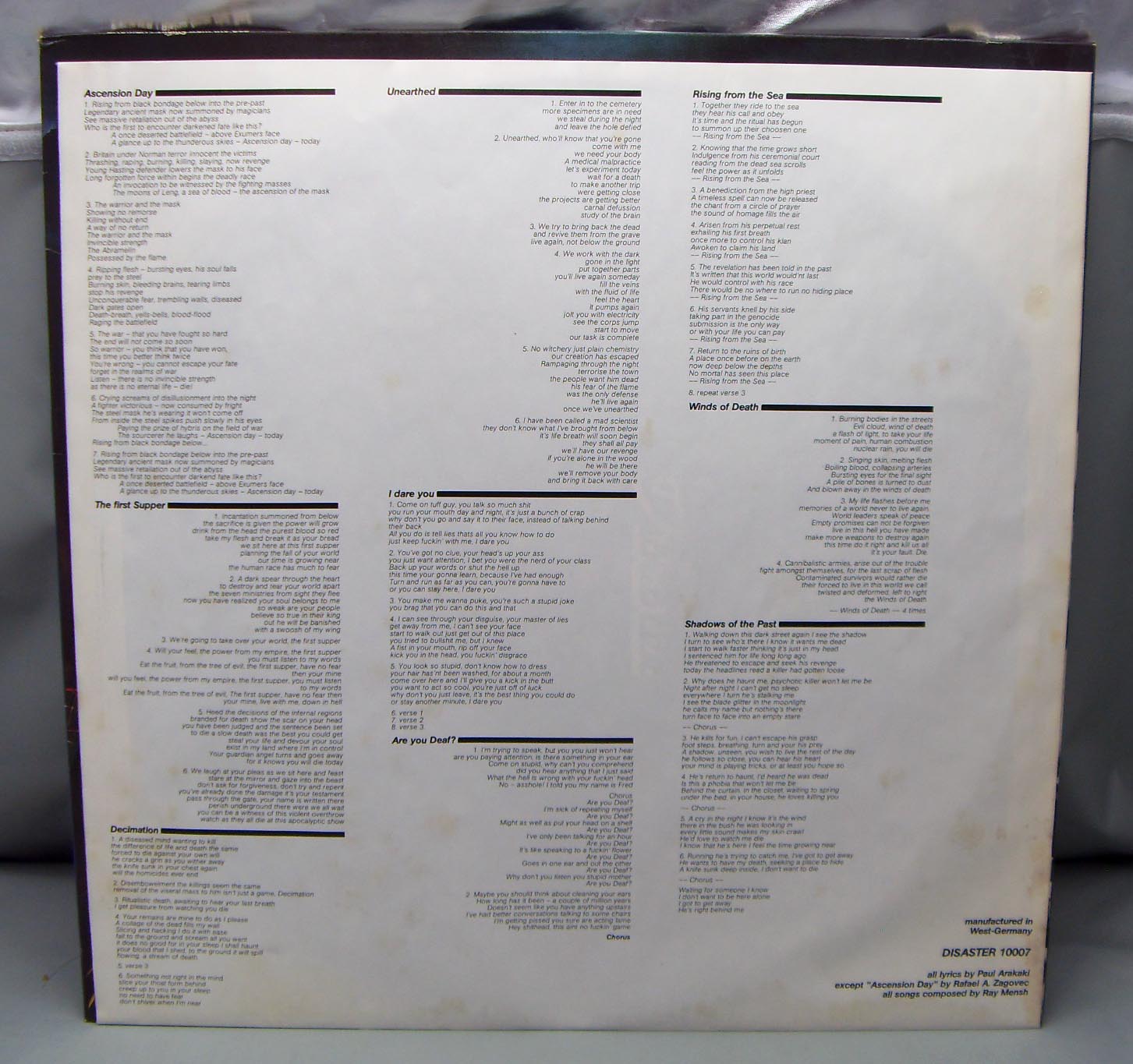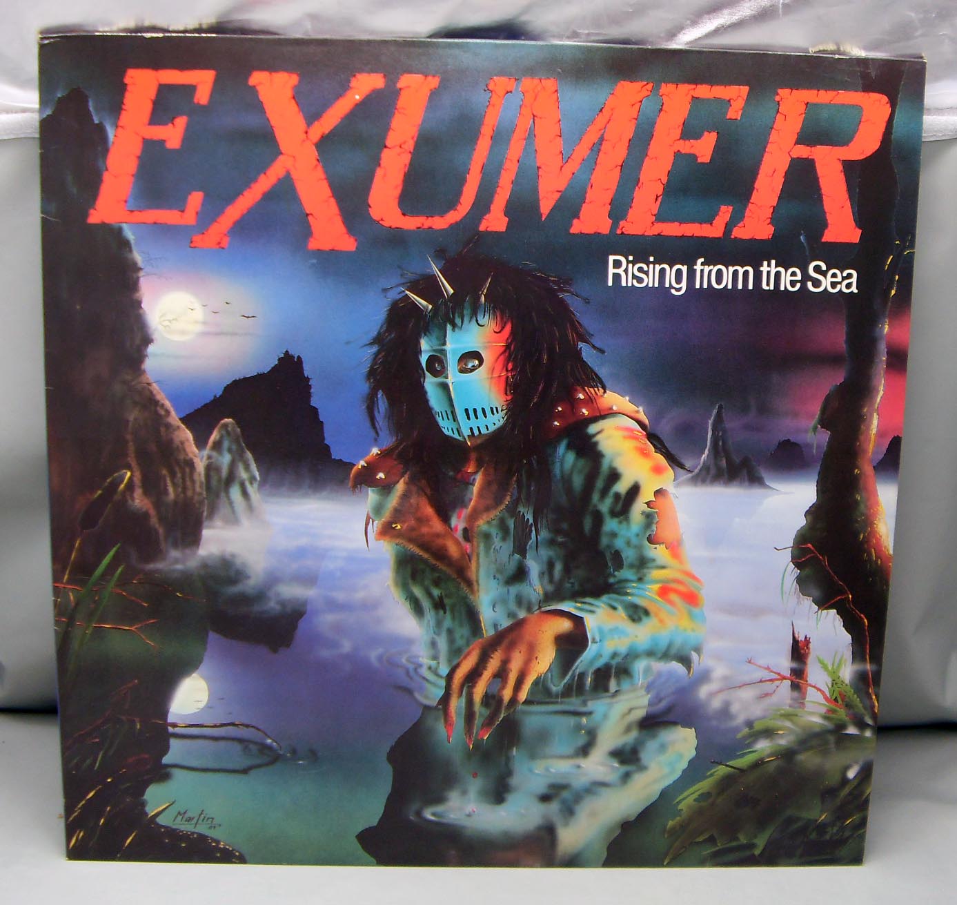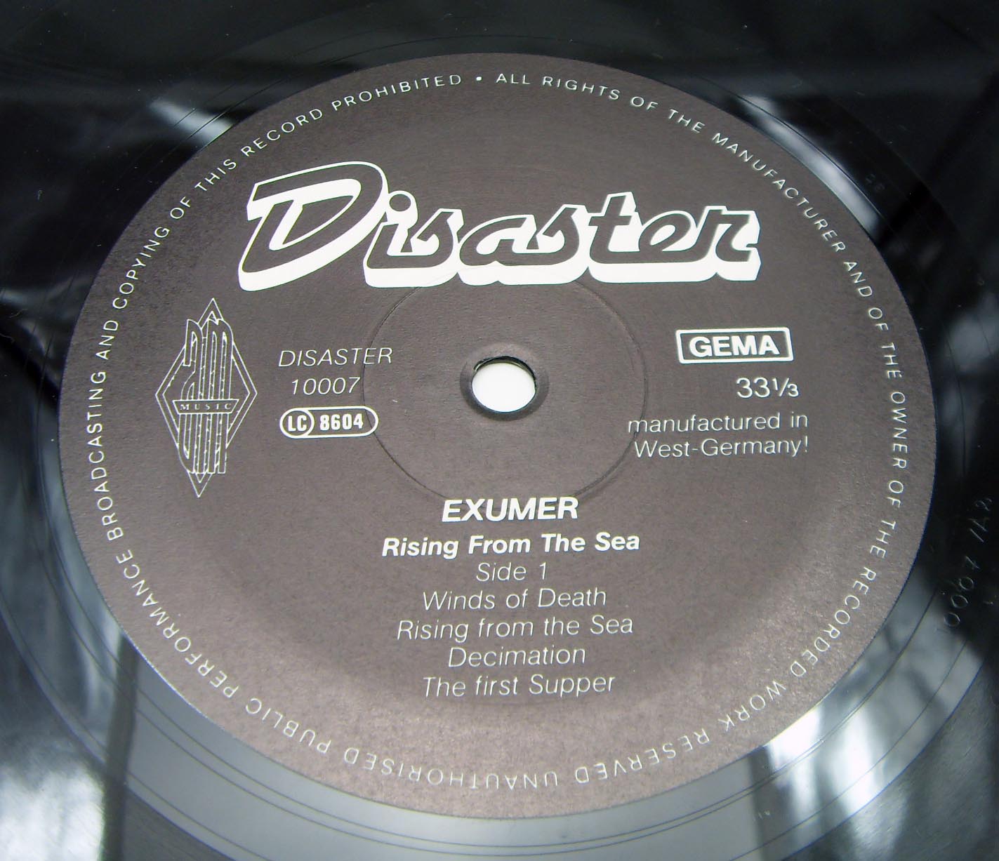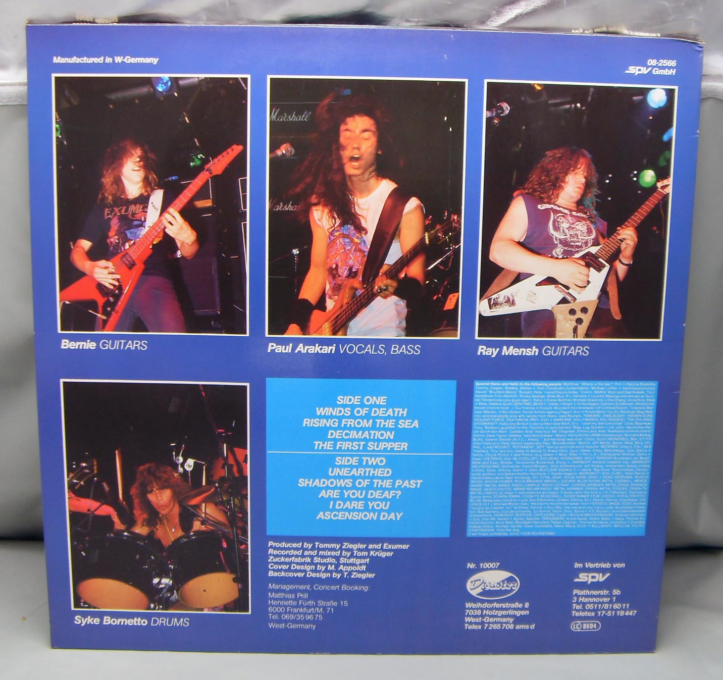 Exumer – Rising From The Sea Label: Disaster – Nr. 10007, Disaster – 10007 Format: Vinyl, LP, Album Country: Germany Released: 1987 Genre: Rock Style: Thrash, Speed Metal Tracklist A1 Winds Of Death A2 Rising From The Sea A3 Decimation A4 The First Supper B1 Unearthed B2 Shadows Of The Past B3 Are You Deaf? B4 I Dare You B5 Ascension Day не мое: Клоны Slayer из Германии, причем настолько буквальные, что даже есть конкретные песни (“Decemation”, “Unearthed”, “I Dare You”) - песни-клоны известных вещей с “Reign In Blood”. Я уж не говорю о старом-новом вокалисте, который просто чрезвычайно копирует Арайю (вплоть до фирменного вступительного крика-вопля). Поначалу я отнесся к альбому достаточно скептически и даже несколько с негодованием, но потом, немного поразмыслив и еще пару раз заслушав альбом, все же решил, что он не так уж и плох, так как мы-то с вами знаем, что Slayer– это круто! К тому же, что-то здесь осталось и от “старого” Exumer’а (например, вещи “Rising From The Sea”, “The First Supper”), плюс одна вещь “Are You Deaf?” вообще слизана с S.O.D. Хех, вот такой плагиаторский альбомчик. Что еще? Ах, да… если игру гитаристов еще можно с натяжкой поставить рядом с тандемом Hanneman/King, то барабанщик их с Ломбардо и рядом не валялся…