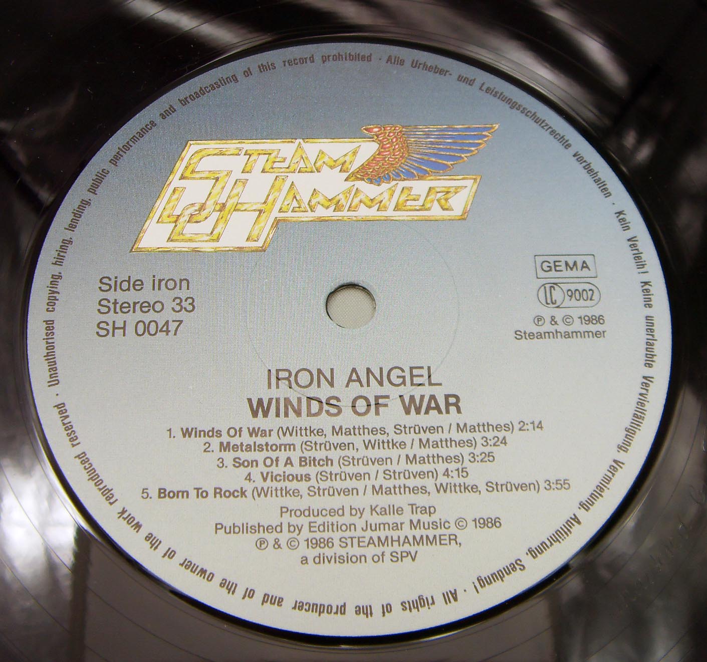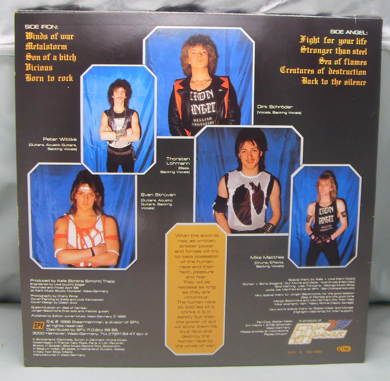 Iron Angel – Winds Of War Label: Steamhammer – SH 0047 Format: Vinyl, LP, Album Country: Germany Released: 1986 Genre: Rock Style: Thrash, Speed Metal Tracklist Side Iron A1 Winds Of War 2:14 A2 Metalstorm 3:23 A3 Son Of A Bitch 3:25 A4 Vicious 4:15 A5 Born To Rock 3:55 Side Angel B1 Fight For Your Life 4:28 B2 Stronger Than Steel 5:50 B3 Sea Of Flames 5:16 B4 Creatures Of Destruction 4:14 B5 Back To The Silence 1:50