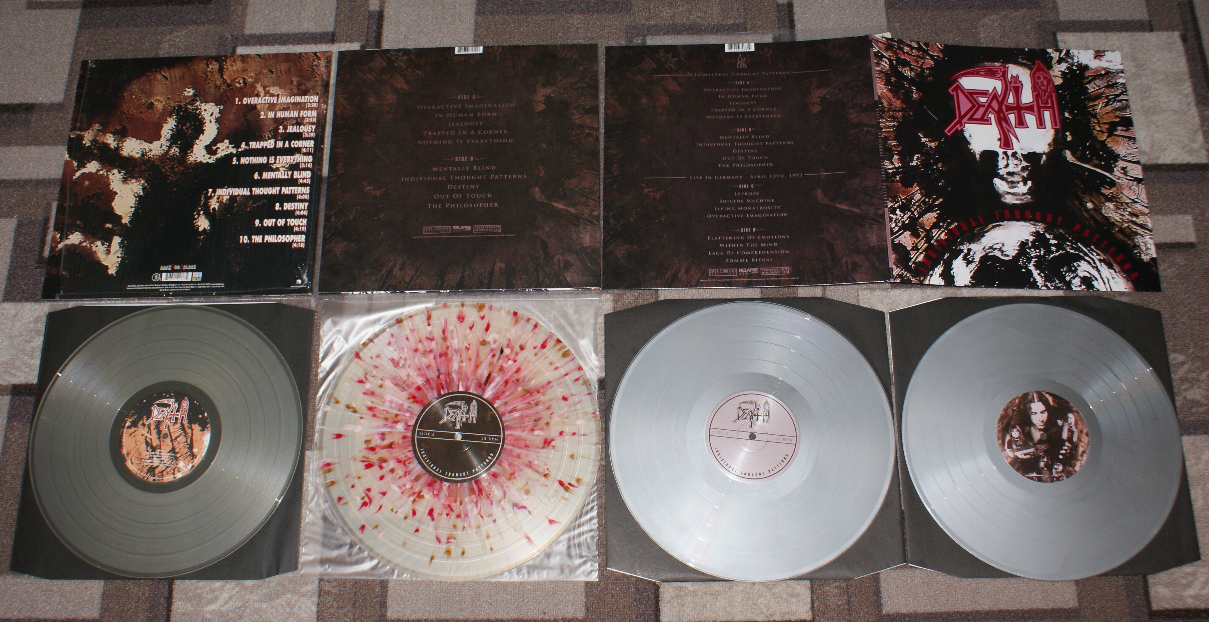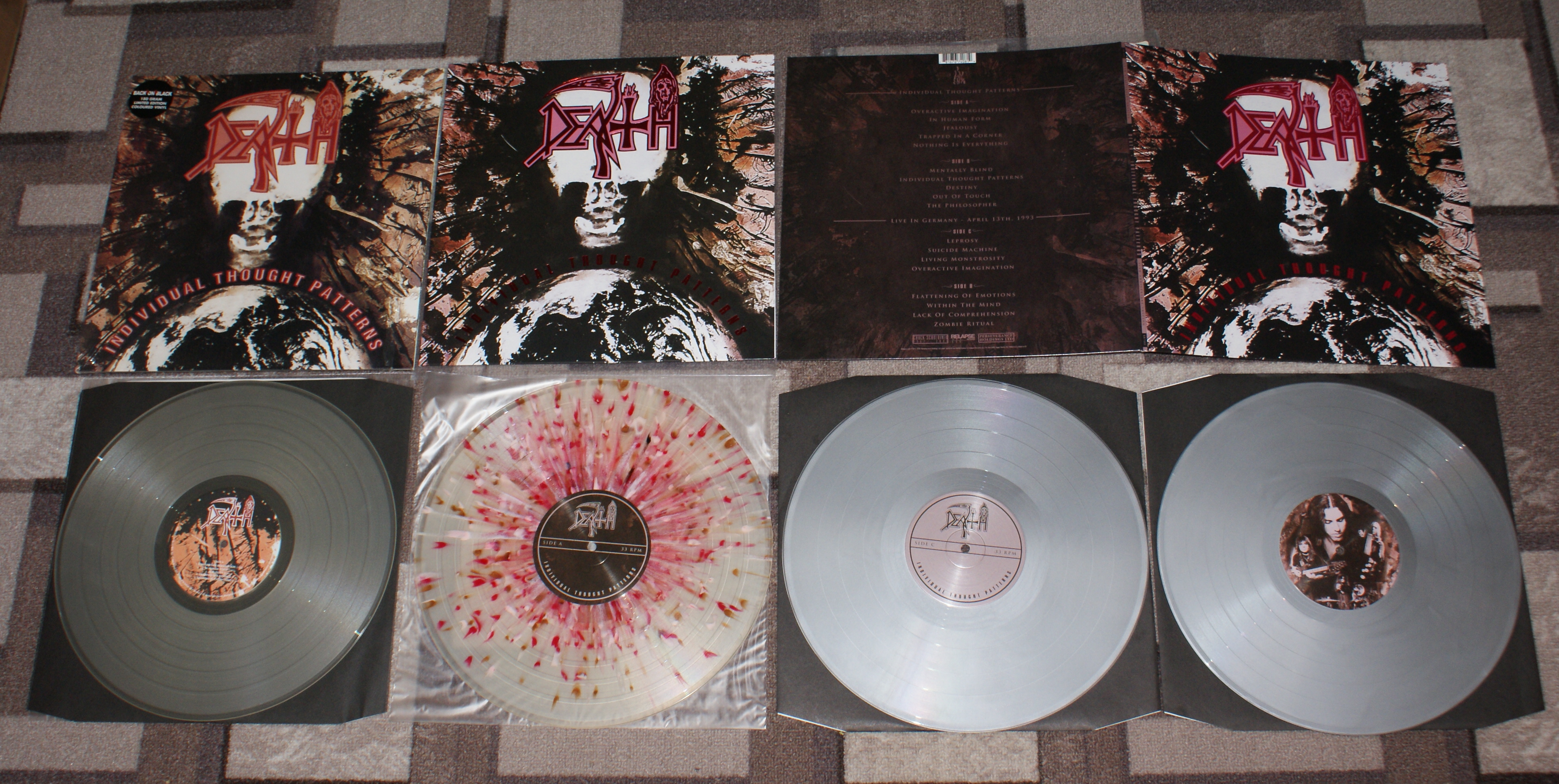 Вот пример Death- Individual Thought Patterns 1993 BACK ON BLACK BOBV059LP Vinyl LP, Album, Reissue 2007, Clear ,Issued in a gatefold sleeve.uk Death- Individual Thought Patterns 1993 Relapse Records RR7171 Vinyl, LP, Album, Limited Edition 2500 x Milky Clear with Baby Pink, Blood Red and Bronze Splatter Standard Gram, European exclusive, includes insert with photos/liner notes/lyrics/etc. and download code.Буклет 4 страницы., Remastered 2017 Europe Death - Individual Thought Patterns 1993 Relapse Records RR7408 2 × Vinyl, LP, Album, Silver ,25th Anniversary 2LP Edition (One Time Pressing).5000 x 25th Anniversary Silver Standard Gram. Gatefold sleeve with lyric insert and plain black inner sleeves. Reissue 2018 side C/D- Live In Germany - April 13th, 1993 USA & Europe