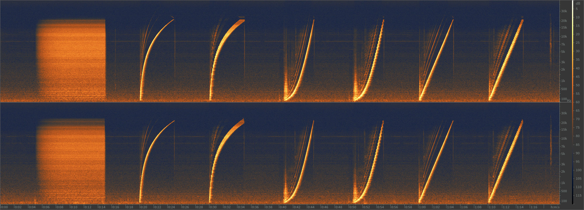 Источники шума компьютер не более 39db, фоновый шум 39db. Измерения проводятся с помощью MASTECH MS8229 (что есть, то есть). Воспроизводим музыку и тестовые сигналы через focusrite 2i2 на самодельную акустику, монитор (lg со встроенными динамиками), блютуз колонка и обычный динамик без оформления- резонансы на спектрограмме тоже видны.