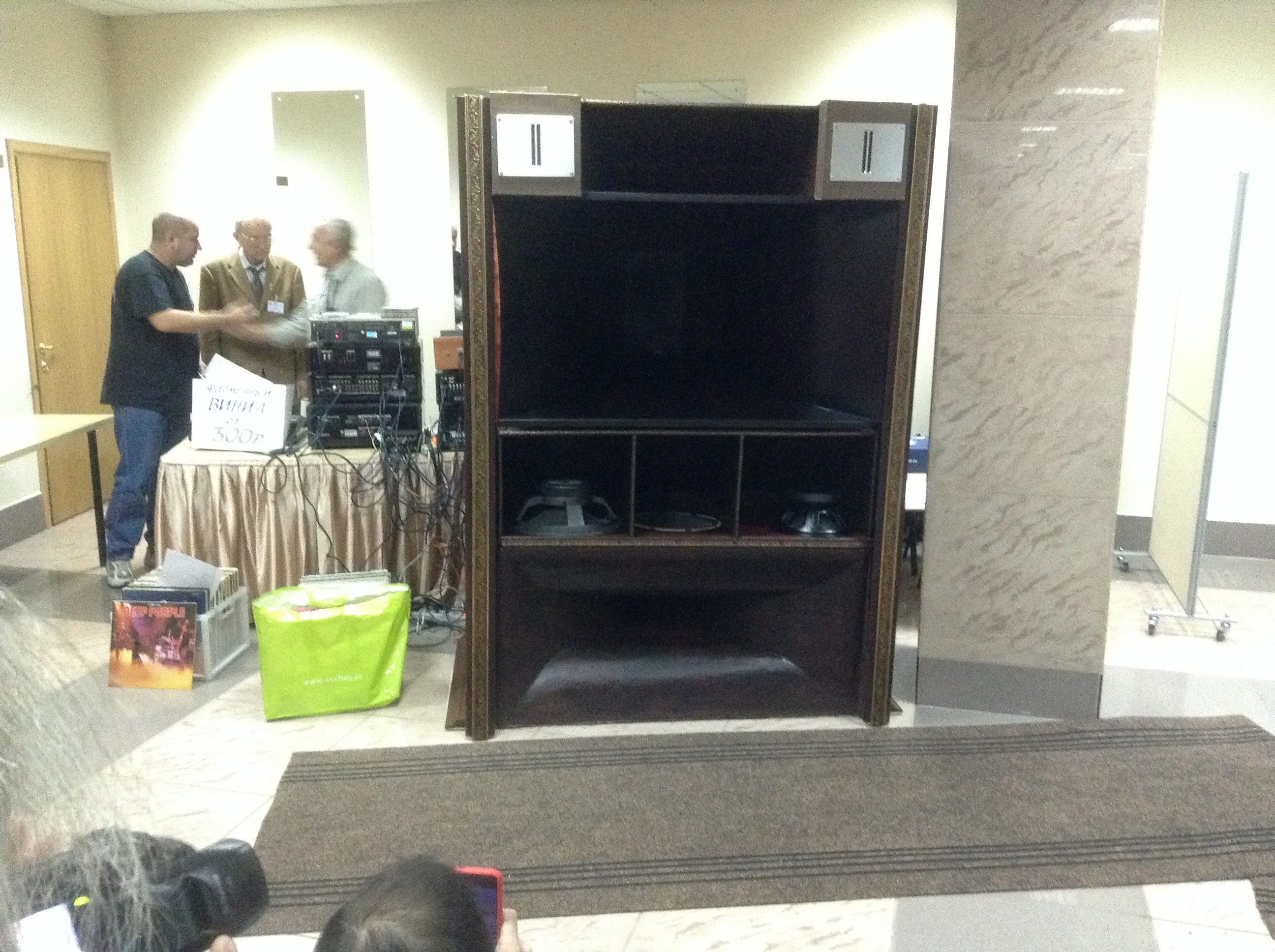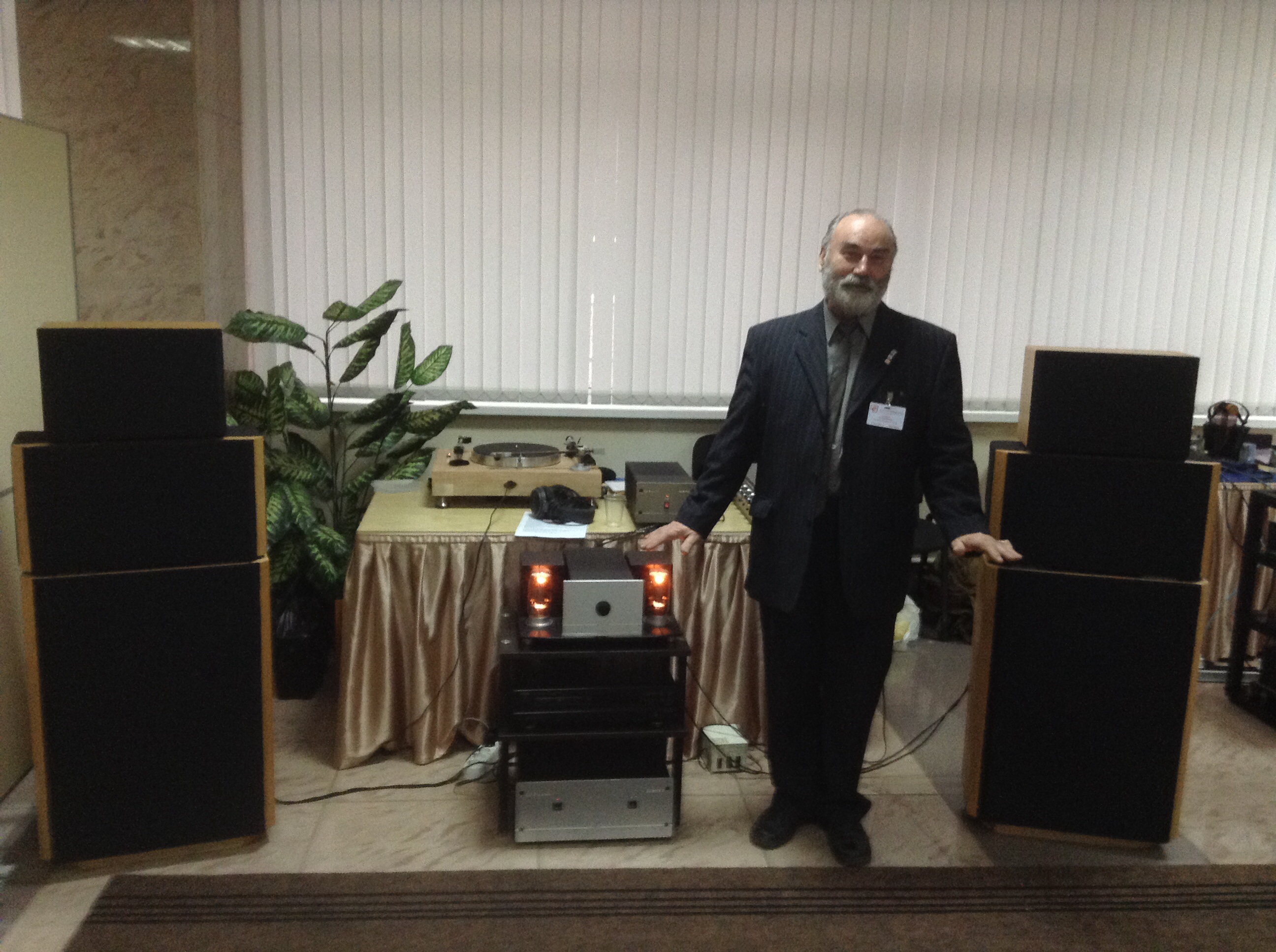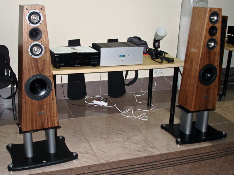 Эти пирамиды (п.25) разработал С.Д. Бать. Звук ОЧЕНЬ неплохой, оформление ЗЯ. Наверное, лучший из всех АС на выставке. Можно в серию запускать,если кто возьмется, - настолько все "вылизано". Сказали, что комплект головок стоит всего 100 баксов. Крылов тоже новые трехполоски выставил, но с двумя НЧ в отдельных объемах и отдельными ФИ. Низ не получился - выпячивается и гудит, середина и верх хороши, с поправкой на мутный "присвист" усилителя непонятной породы. Обе АС - и Батя, и Крылова - сделаны профессионально, что отличает их от остальных, в общем, любительских, лампово-бумажных поделок.