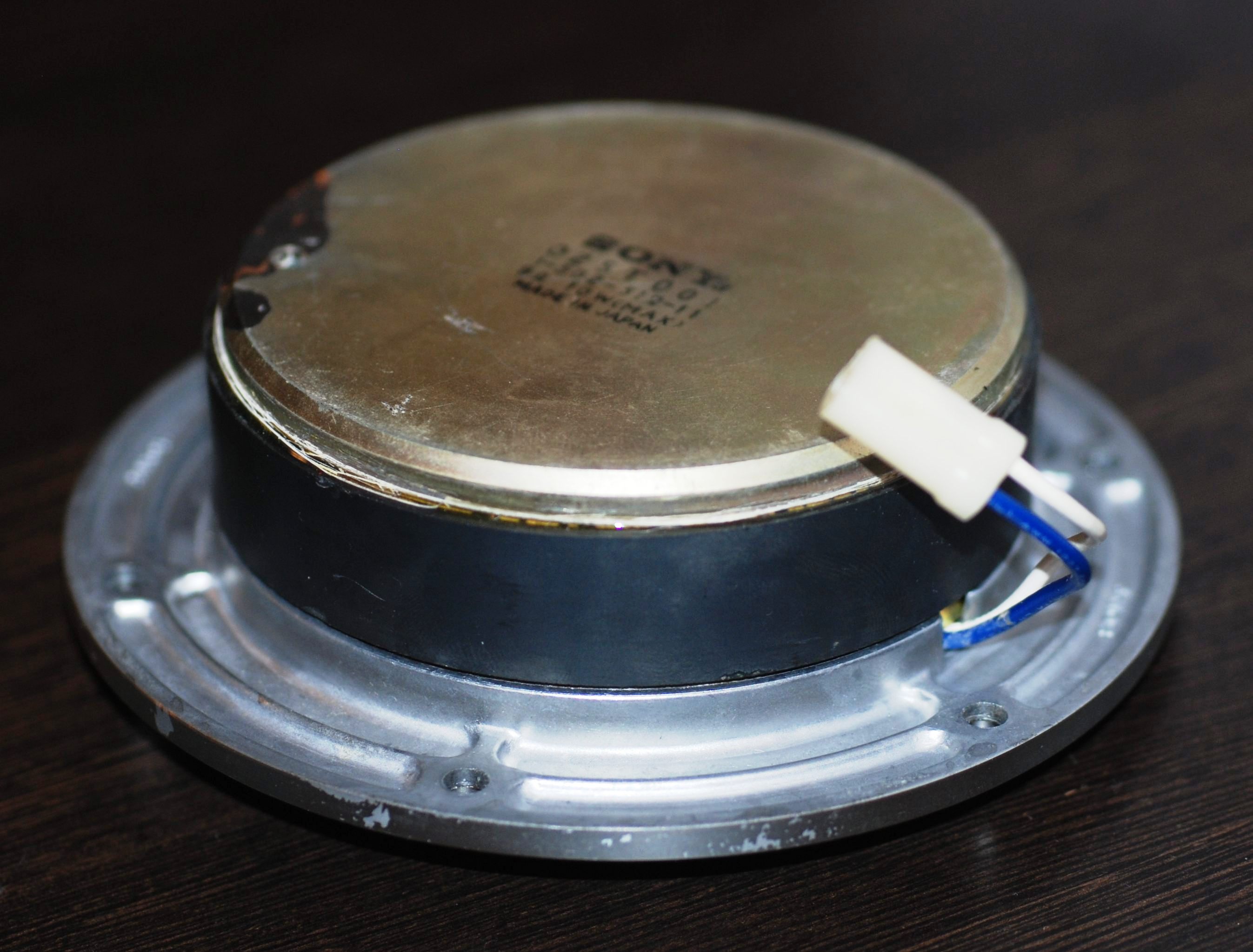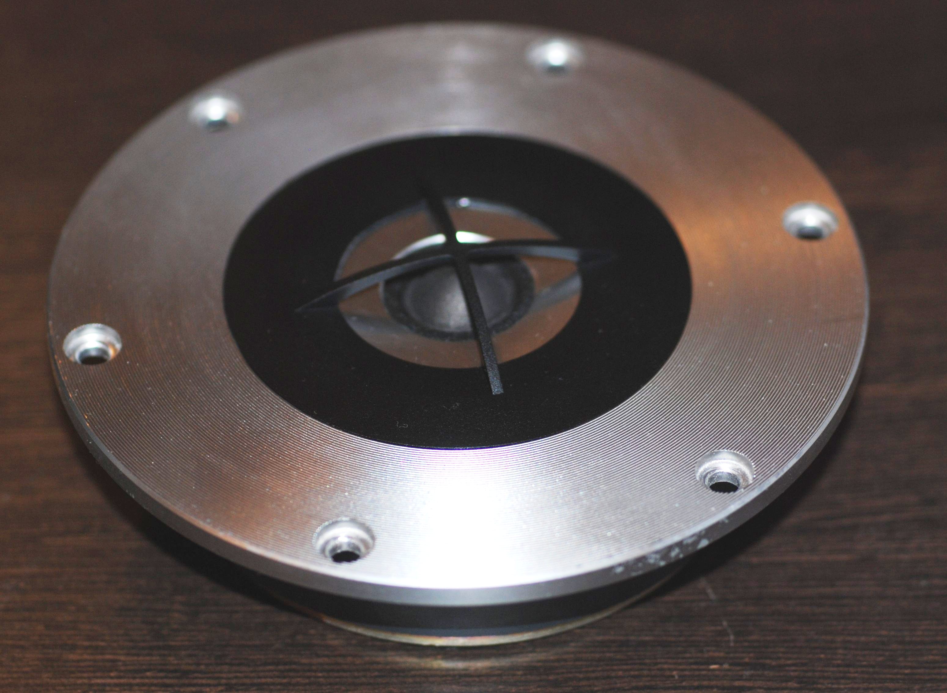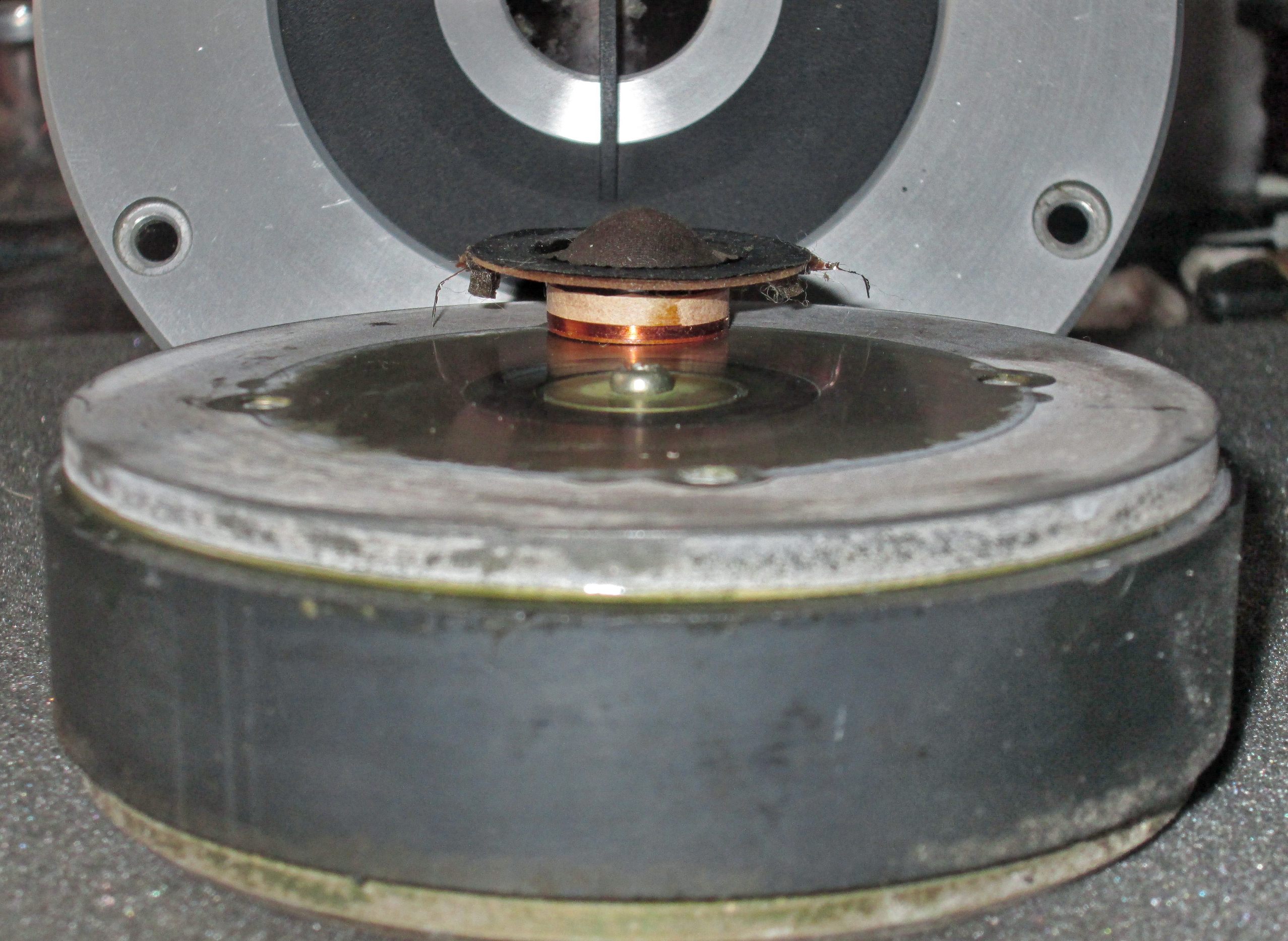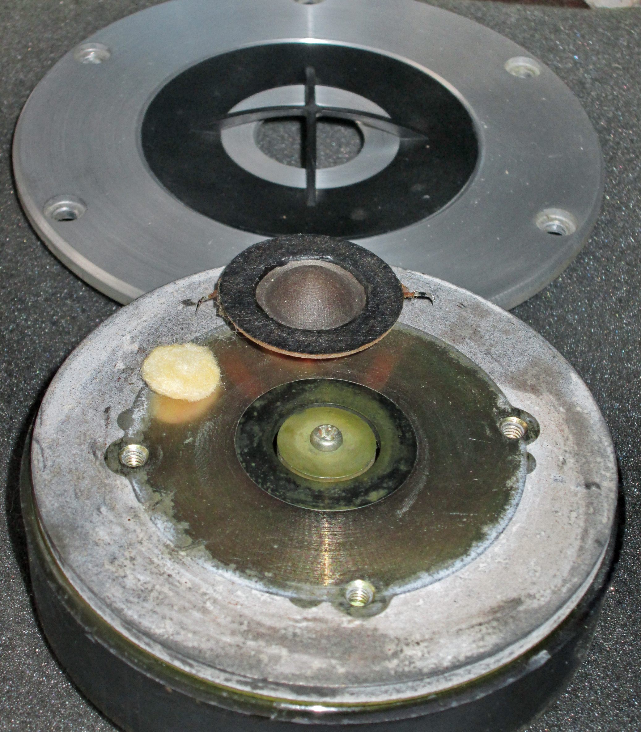Осталась 2-см пищалка. В целом, очень похожа на СЧ-динамик и внешне выглядит, как уменьшенная копия. На фото можно разглядеть, что сохранилась идеология диффузора – комбинация конуса с куполом. Купол приобрел пулевидную форму под которым уютно разместился обычный "памперс". Диаметр катушки стандартный – 16 мм. Вместо технически чистого железа появились вставки из пермендюра (сплав железа и кобальта) - материала с высокой магнитной проницаемостью. Магниты – ферритовые. Но, зато какой размер!!!