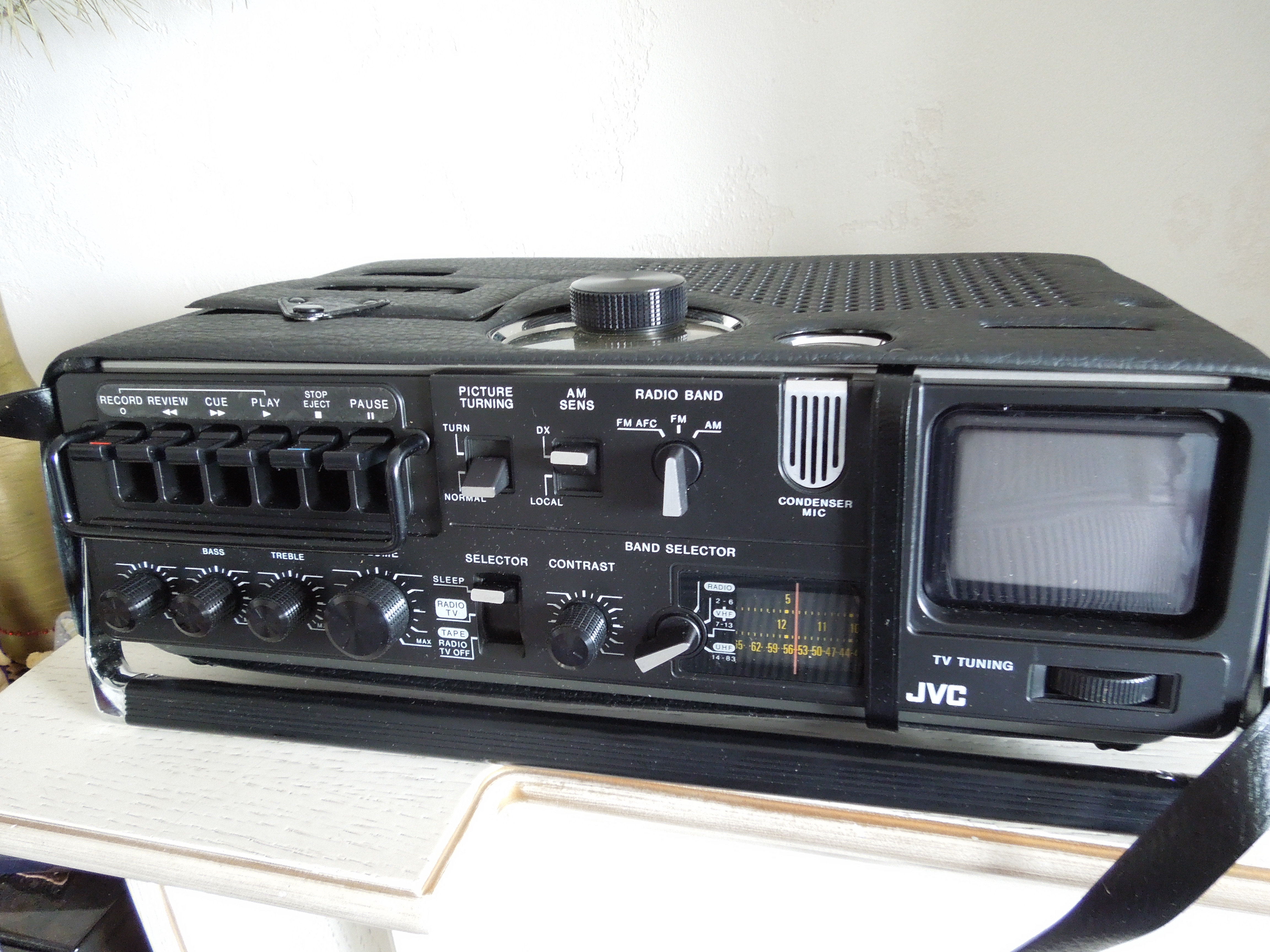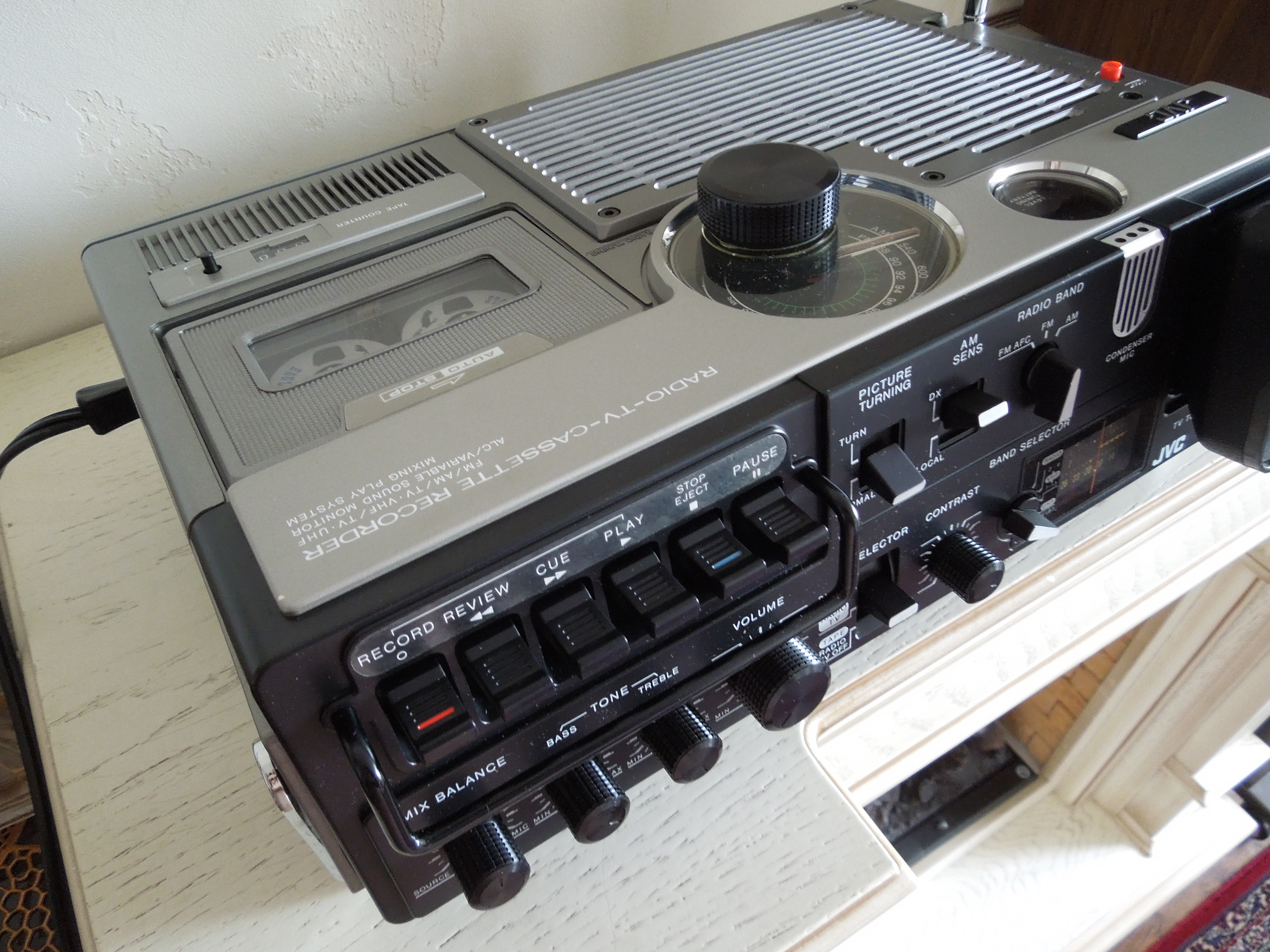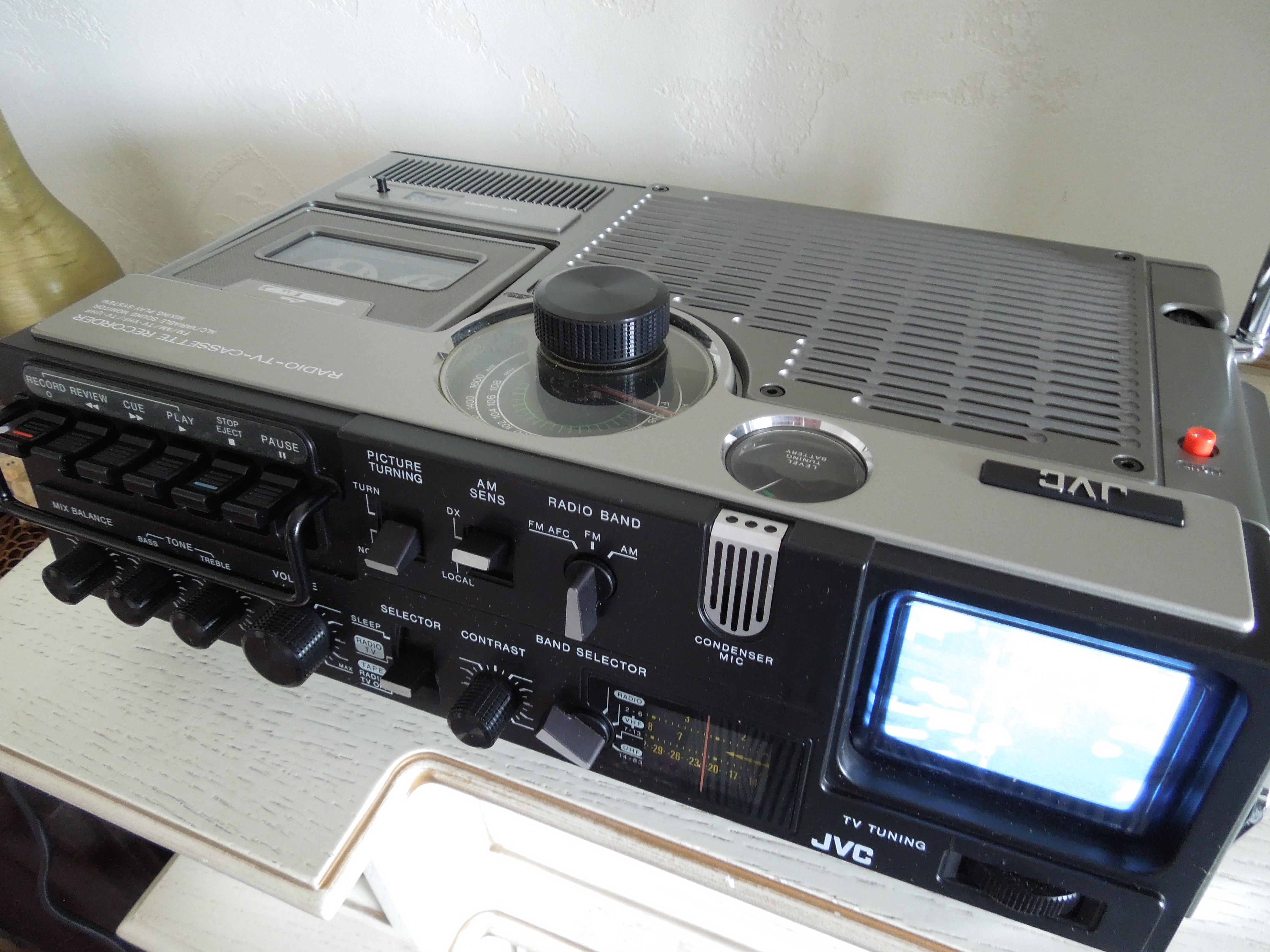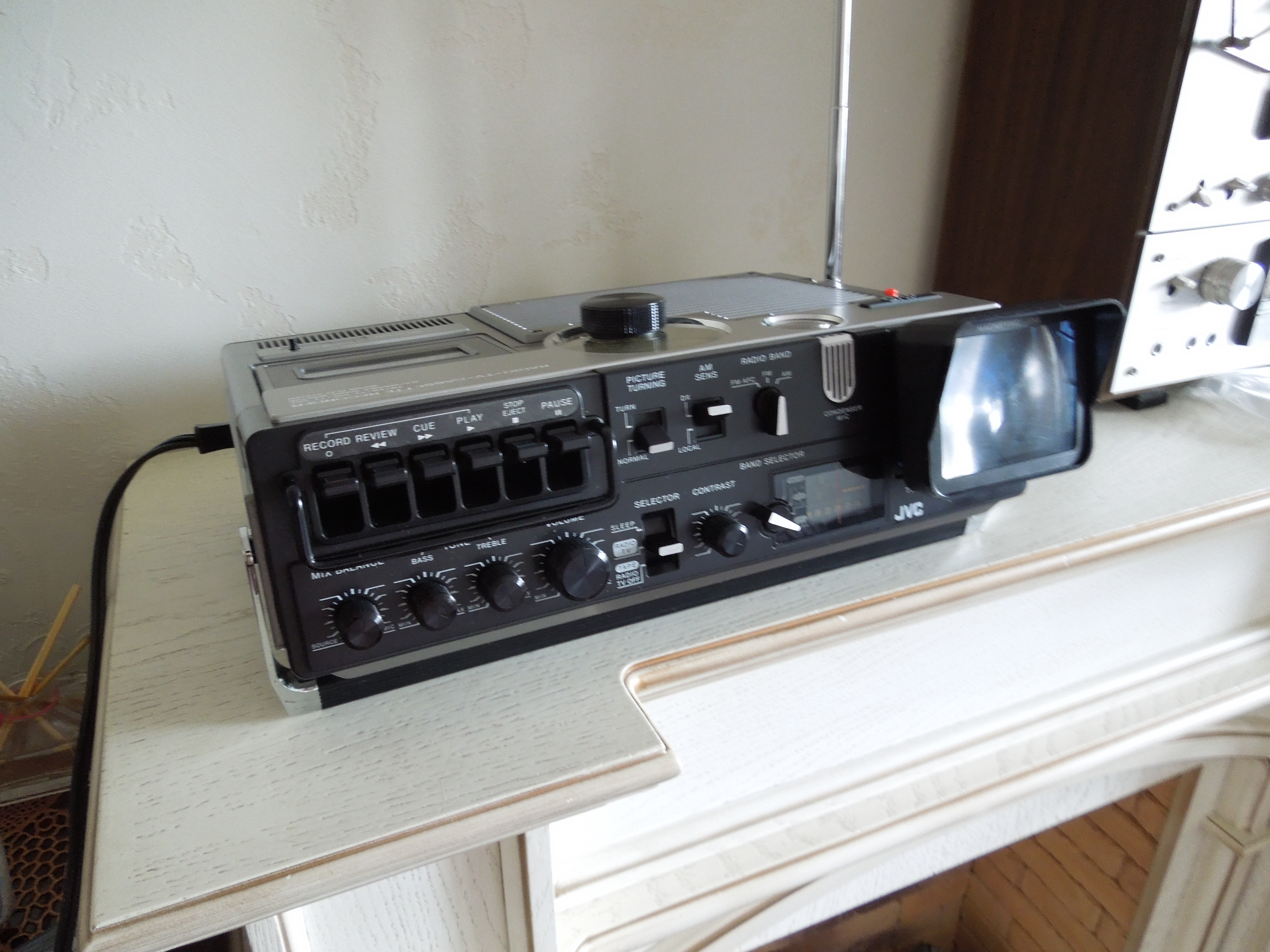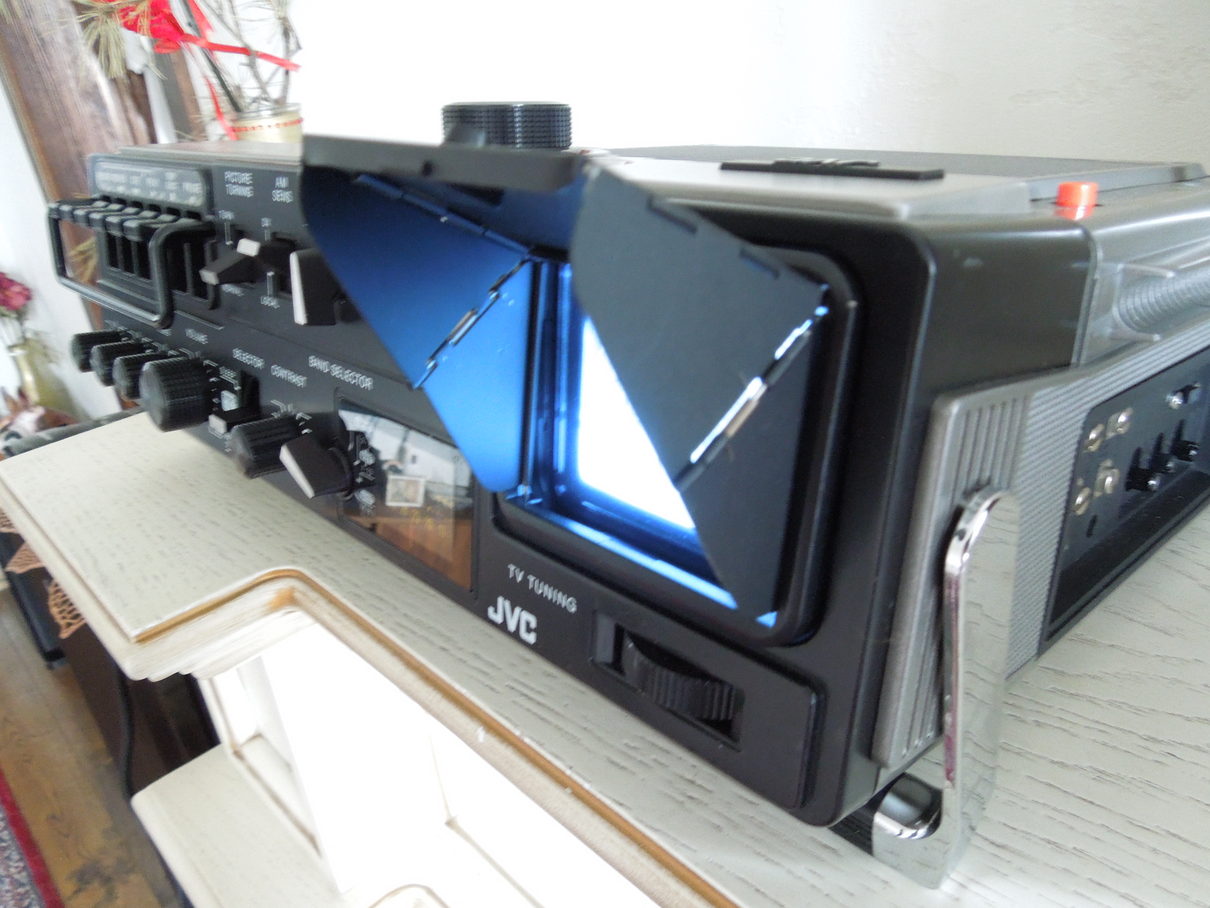 А потом инженеры JVC внимательно посмотрели за привычками и поведением своих целевых потребителей и решили, что они хотят не только слушать радио или кассеты и записывать с микрофонов, но и, например, выезжать с семьей на природу, особенно в период цветения сакуры, и наслаждаться там не только видом замечательных цветов, но и слушать там музыку с тех же радио и кассет, и, возможно, ( о боже! ) , смотреть телевизор, особенно если по нему транслируют бейсбол, который как известно, имеет дикую популярность в Стране Восходящего Солнца! И они немедленно предложили рынку свое решение - переносную ТВ-магнитолу три-в-одном!