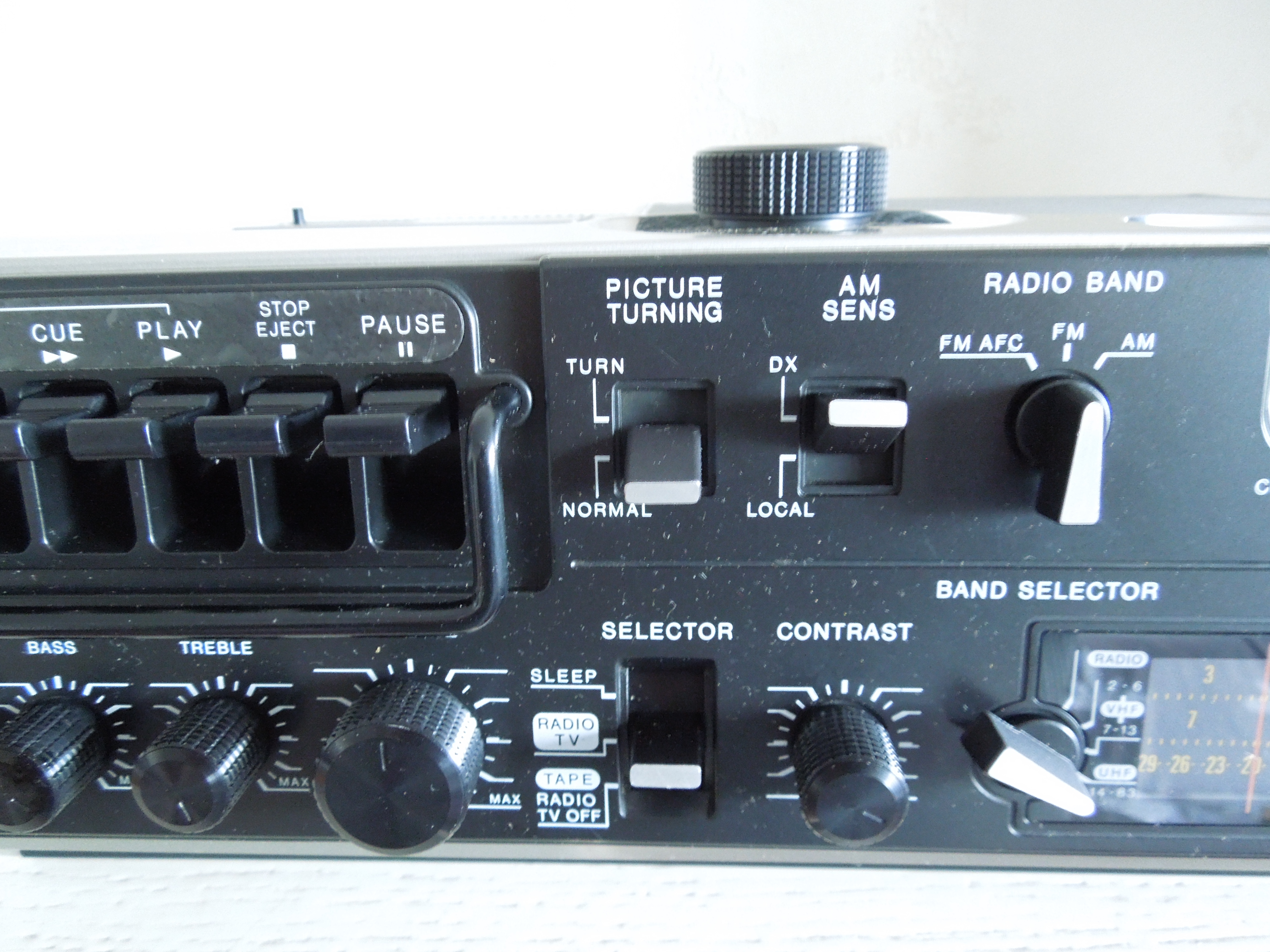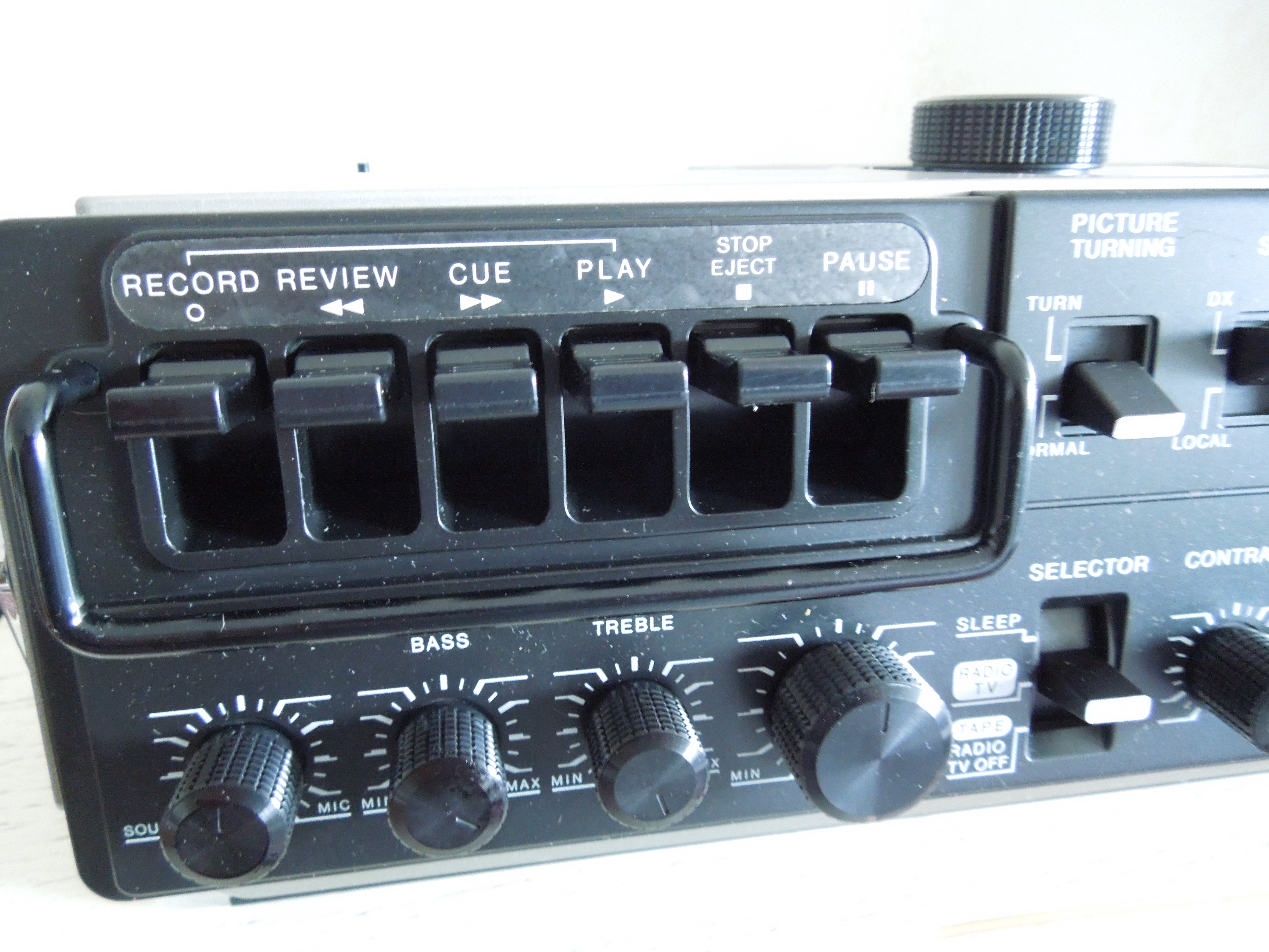 Сам аппарат относительно небольшой, довольно толстый, весит относительно немного, но создает очень приятное тактильное ощущение, благодара очень и очень качественным материалам из которых он сделан. Это прежде всего касается качества пластика корпуса - он очень твердый и плотный, что должно было положительно сказаться на его износостойкости. Аппарат имеет классическую для магнитол данного класса конфигурацию - приемник и кассетная дека располагаются на “лицевой” стороне, а экран телевизора и органы управления располагаются на верхнем торце. При этом и сами органы управления и надписи сориентированы таким образом, чтобы ими было удобно пользоваться когда аппарат лежит лицевой стороной вверх, а экраном обращен к пользователю. Мне кажется что сам факт подобного размещения органов управления и надписей недвузначно указывает на то, что телевизор является основной функцией данной модели, поэтому о нем и поговорим.