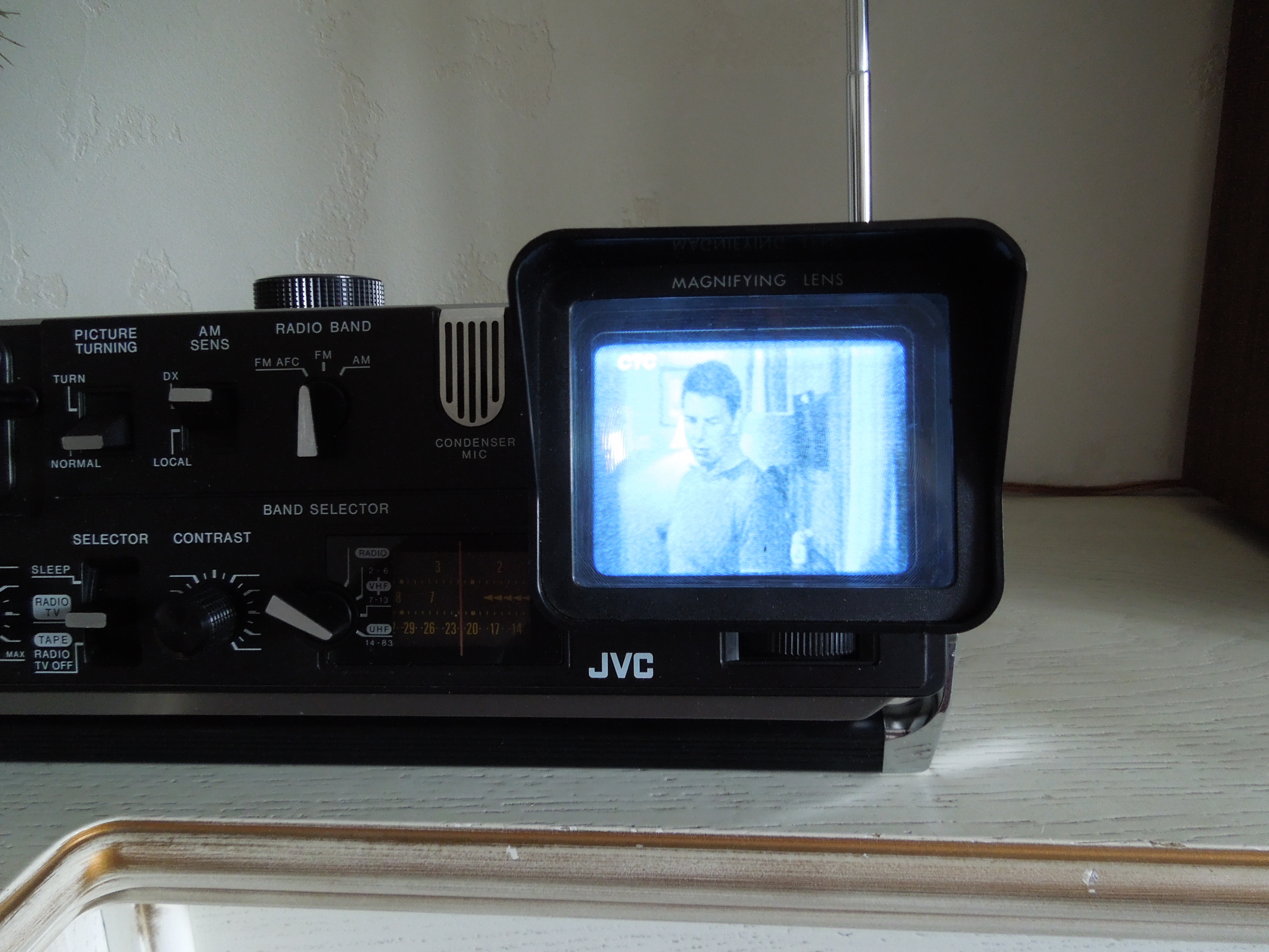 Телевизор черно-белый, принимает трансляцию в двух частотах - VHF и UHF, имеет функцию регулировки контраста, экран размером чуть меньше пачки сигарет, однако, инженеры JVC понимали, что экран такого размера маловат для комфортного просмотра телепередач, поэтому дополнили комплектацию съемной линзой, увеличивающей размер экрана примерно в полтора раза. Нужно сказать, что были они в этом не оригинальными - еще наши инженеры комплектовали телевизор КВН оптической линзой, так что это решение лежало на поверхности. Еще одной замечательной фишечкой был анти-солнечный козырек. Он складной, и складывался в плоскую пластинку. В комплекте также шли две перезаряжаемые батареи, что позволяло использовать аппарат в самом энергоемком режиме довольно продолжительное время. А еще в комплекте был чехол из кожзама с ремнем через плечо для переноски аппарата. Молодцы ребята из JVC, отлично позаботились о потребителе!