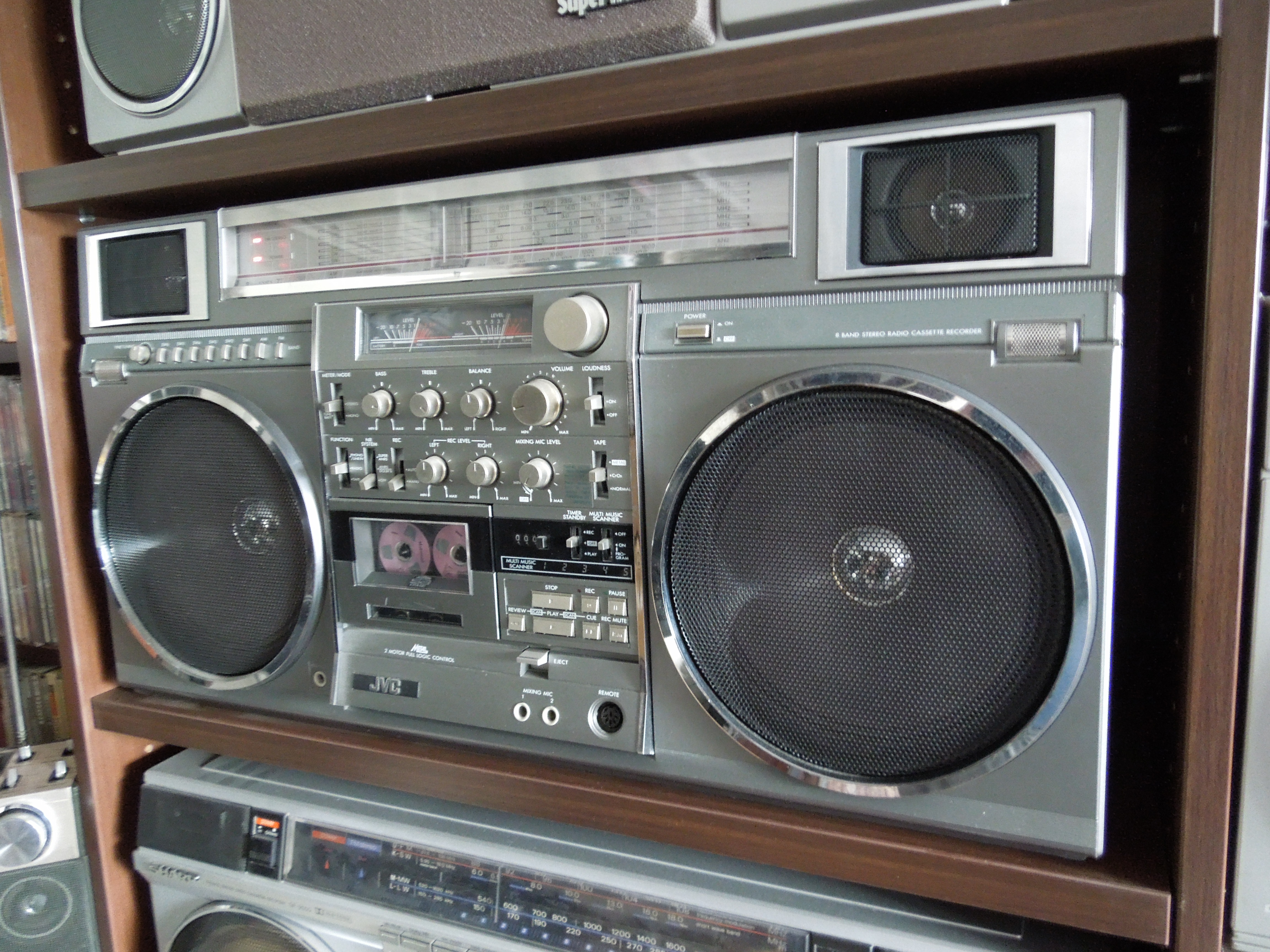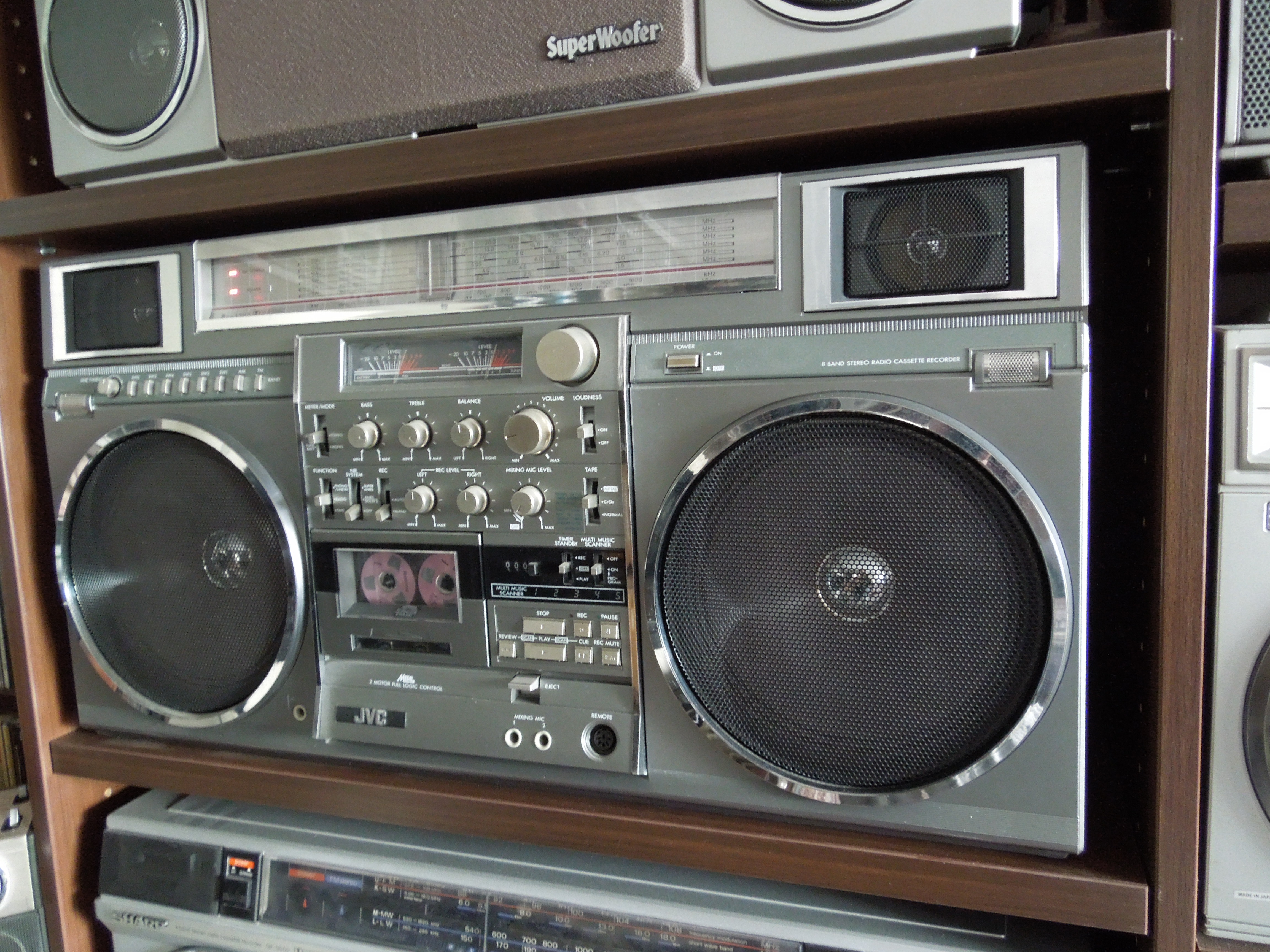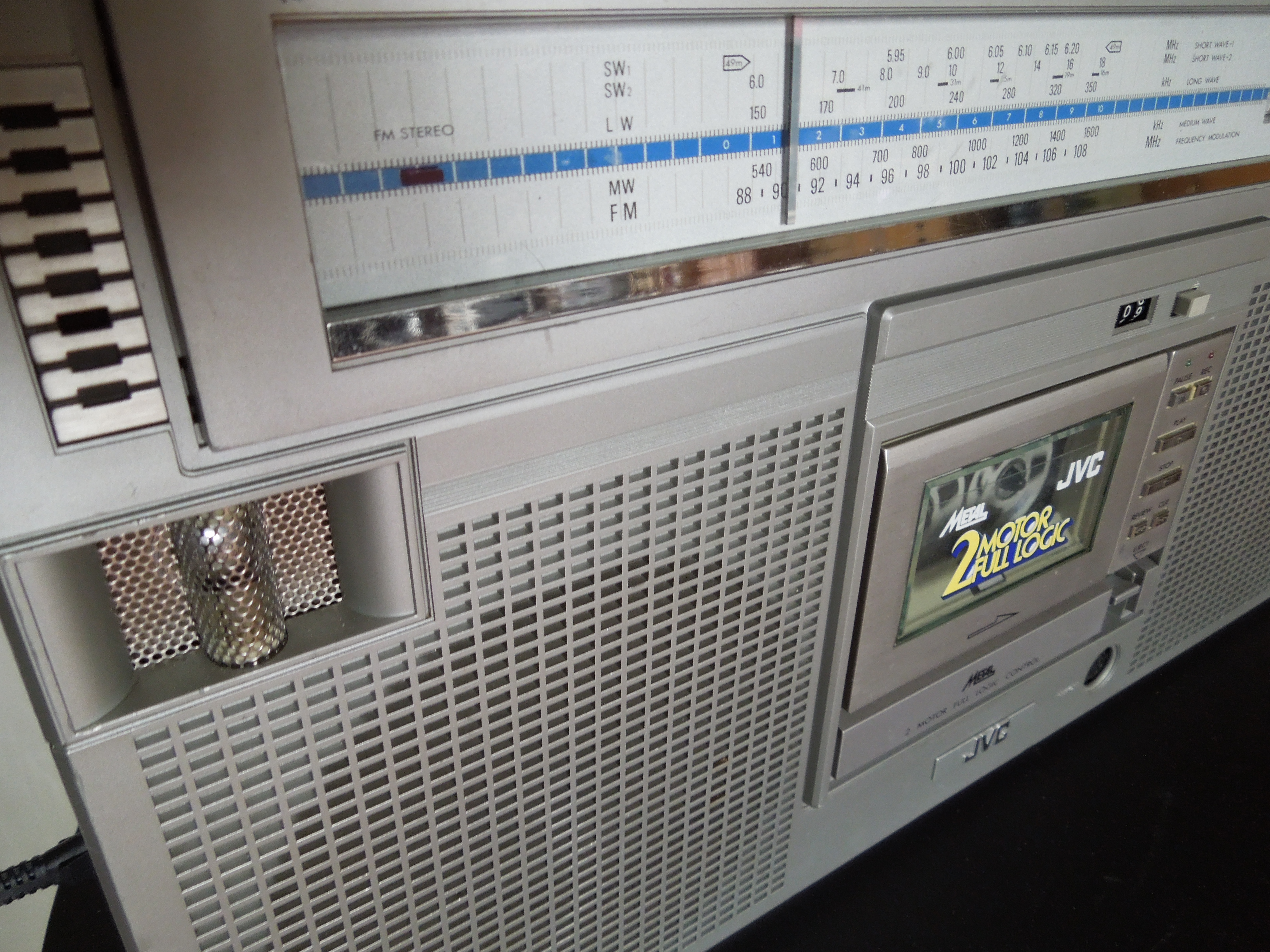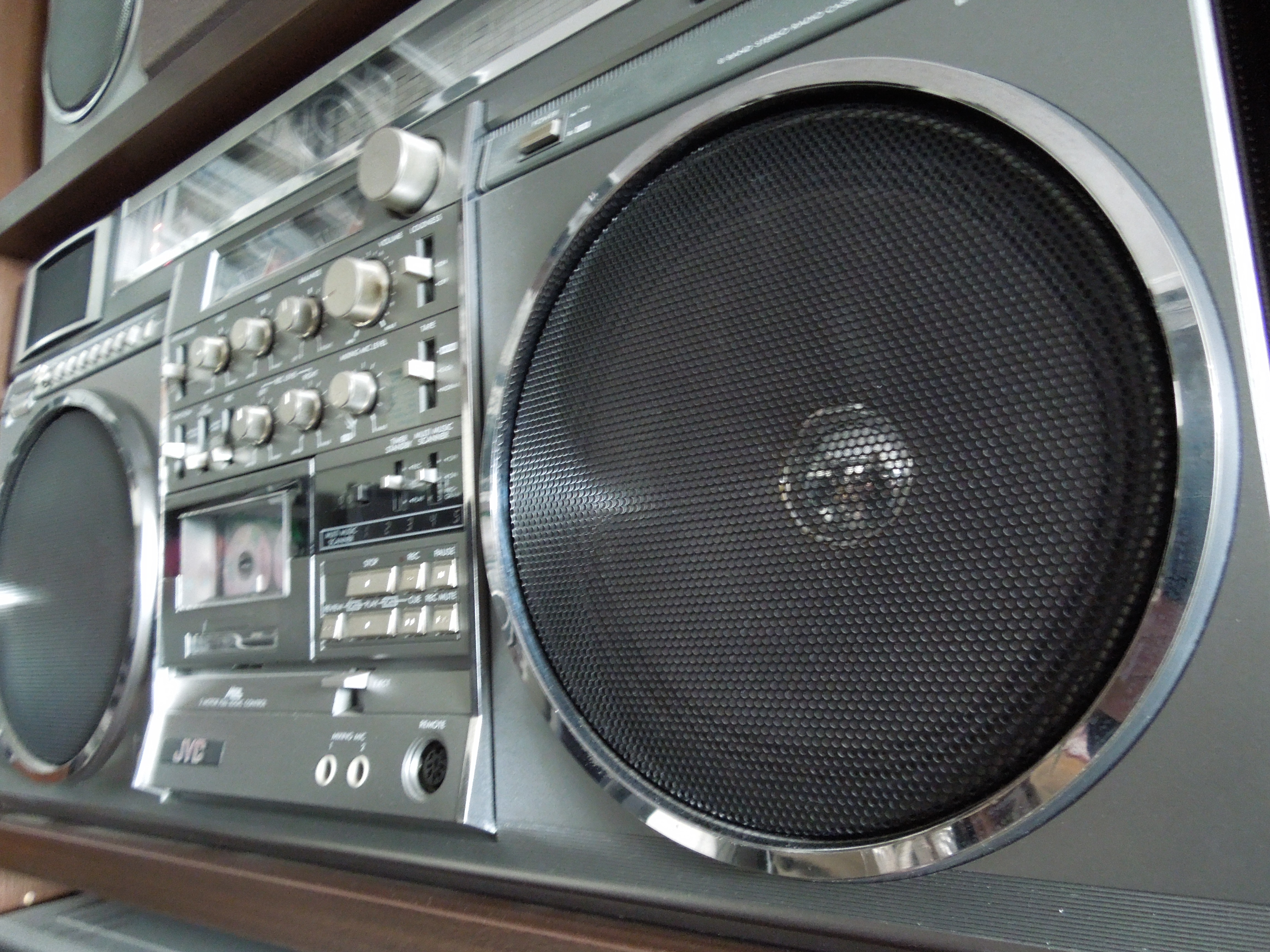 JVC RC-M90 это очень большая магнитола. Даже очень большая! По размерам с ней соперничать могут только Sharp GF-9000 и Panasonic RX-5350. Может еще Sanyo M-X920 / 960, но мне кажется что визуально они немного меньше. Разумеется я говорю только о моноблоках. Да и весит аппарат как чугунный мост - 10 килограмм без батареек!