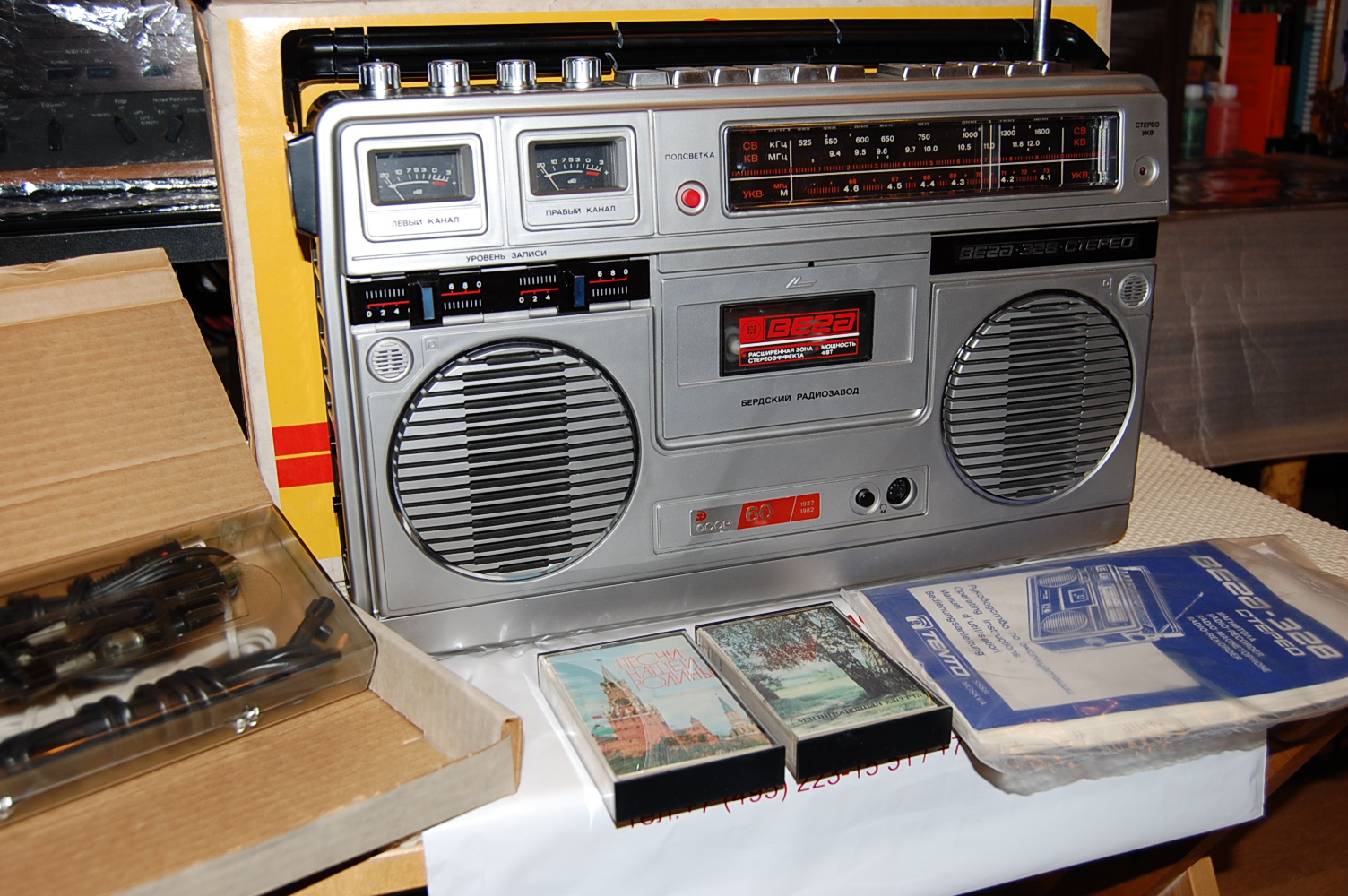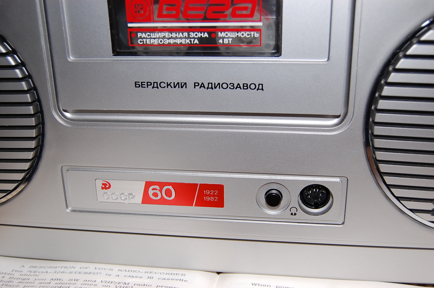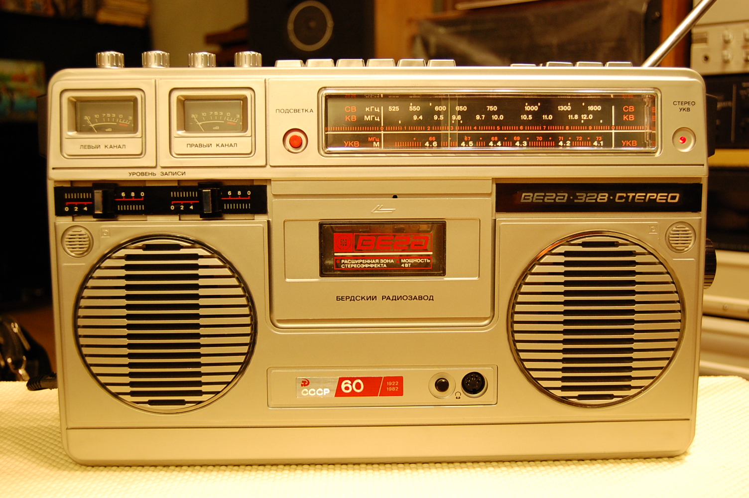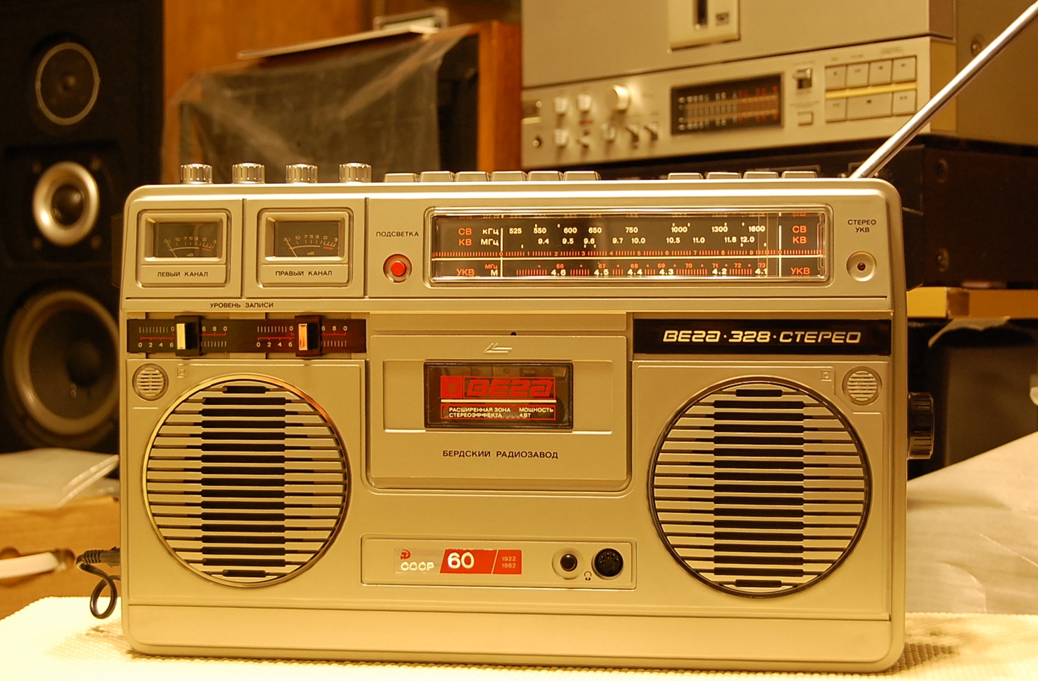Особенно умиляет гордая надпись на магнитоле Вега - 328: "СССР 60 лет." Кнопки поверху из металла, хромированные элементы дизайна, подсветка при работе от сети, 8-ми! коленчатая антенна длиной более метра, раздельный темброблок по ВЧ и НЧ, вход и выход, ручной и автоматический уровень записи, отменное звучание и расширение стереобазы. И даже фирменная наклейка!