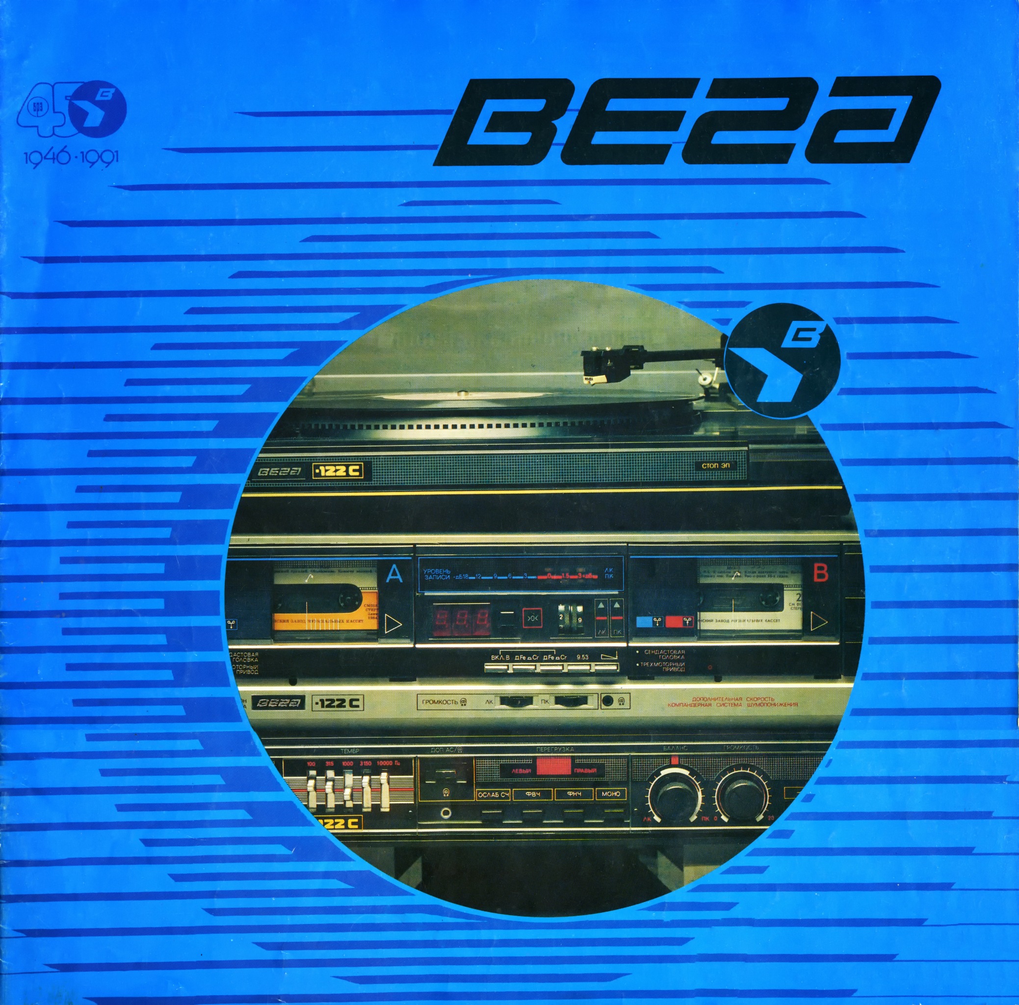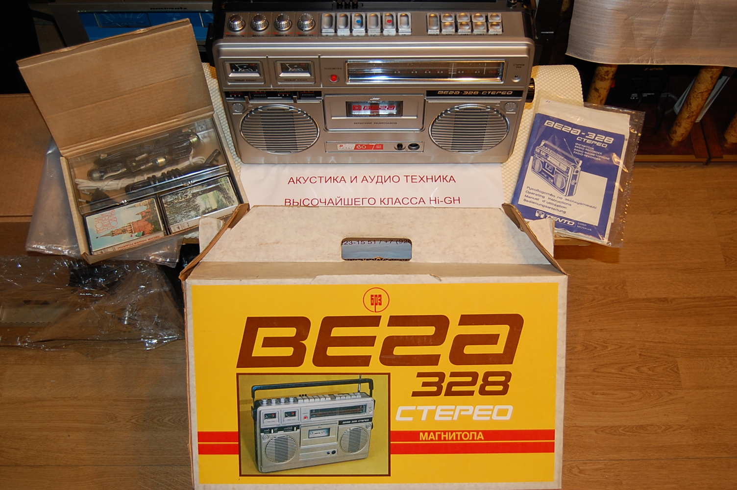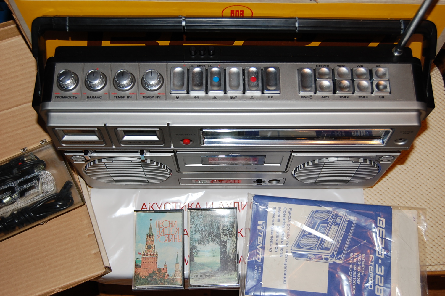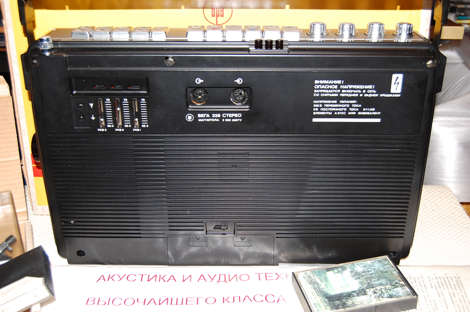 Особенно умиляет гордая надпись на магнитоле Вега - 328: "СССР 60 лет." Кнопки поверху из металла, хромированные элементы дизайна, подсветка при работе от сети, 8-ми! коленчатая антенна длиной более метра, раздельный темброблок по ВЧ и НЧ, вход и выход, ручной и автоматический уровень записи, отменное звучание и расширение стереобазы. И даже фирменная наклейка!