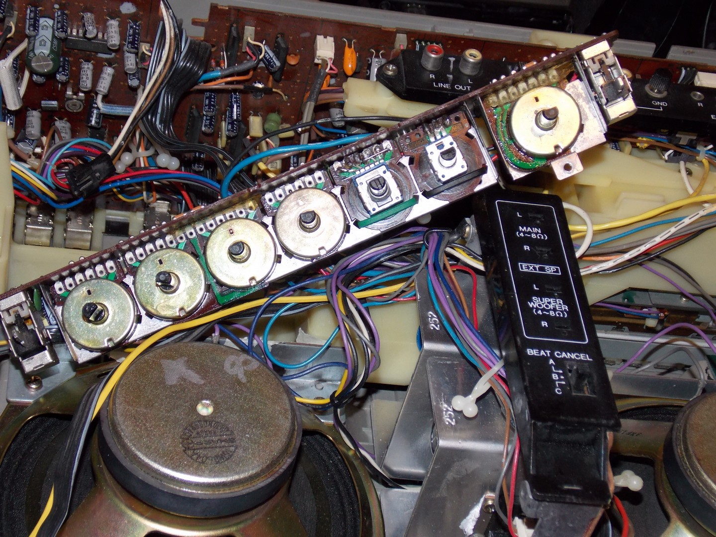 В последнем проведён полный комплекс ремонтно-восстановительных работ, в т.ч. заменены два вышедших из строя регулятора на ALPS - баланс и тембр ВЧ. Так как они закреплены на подложках штатных потенциометров Шарпа, то если их менять на оригиналы, то ничего переделывать не надо - они впаяны в родные подложки, а эти подложки  - впаяны в штатные места на плате.