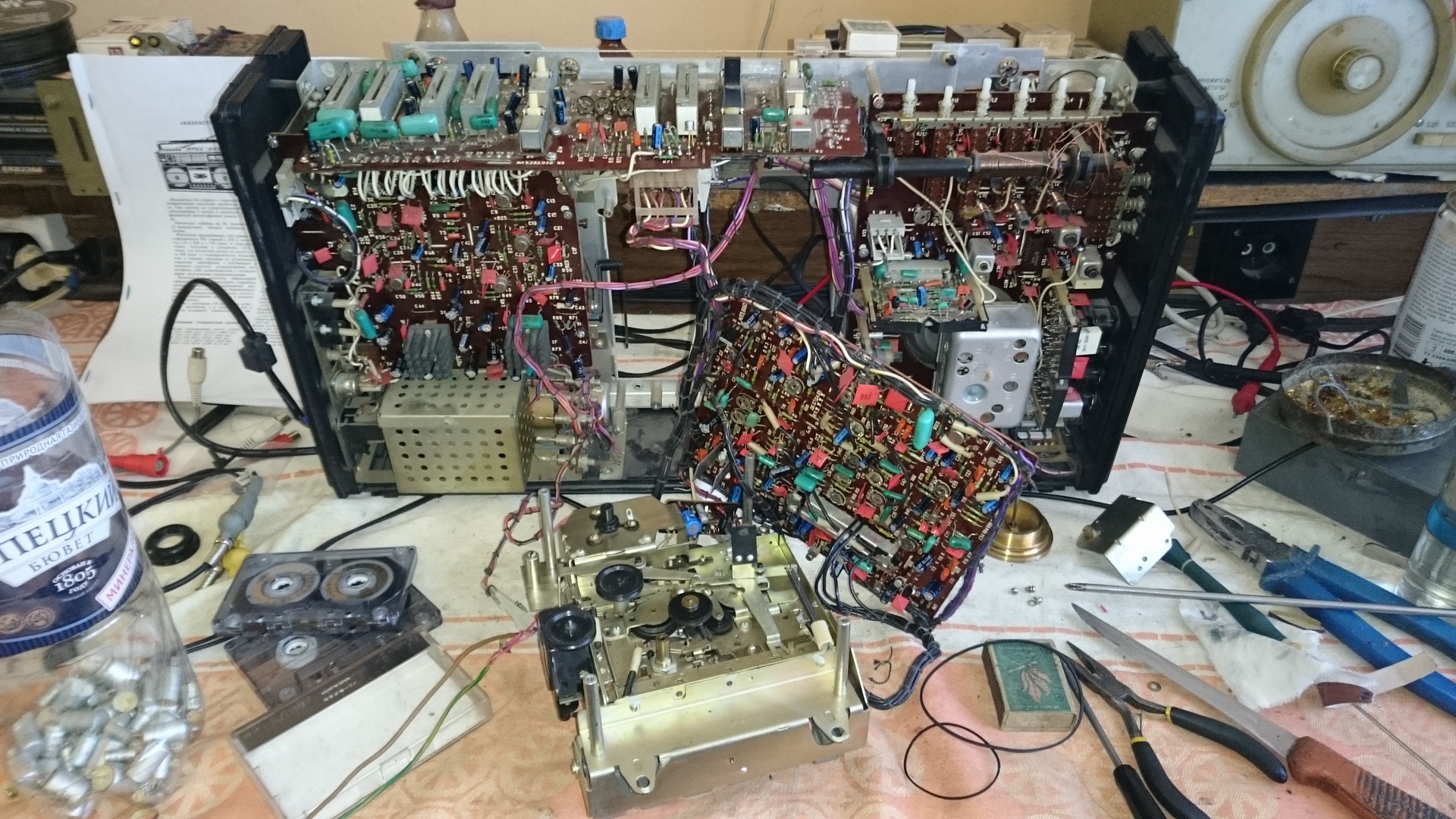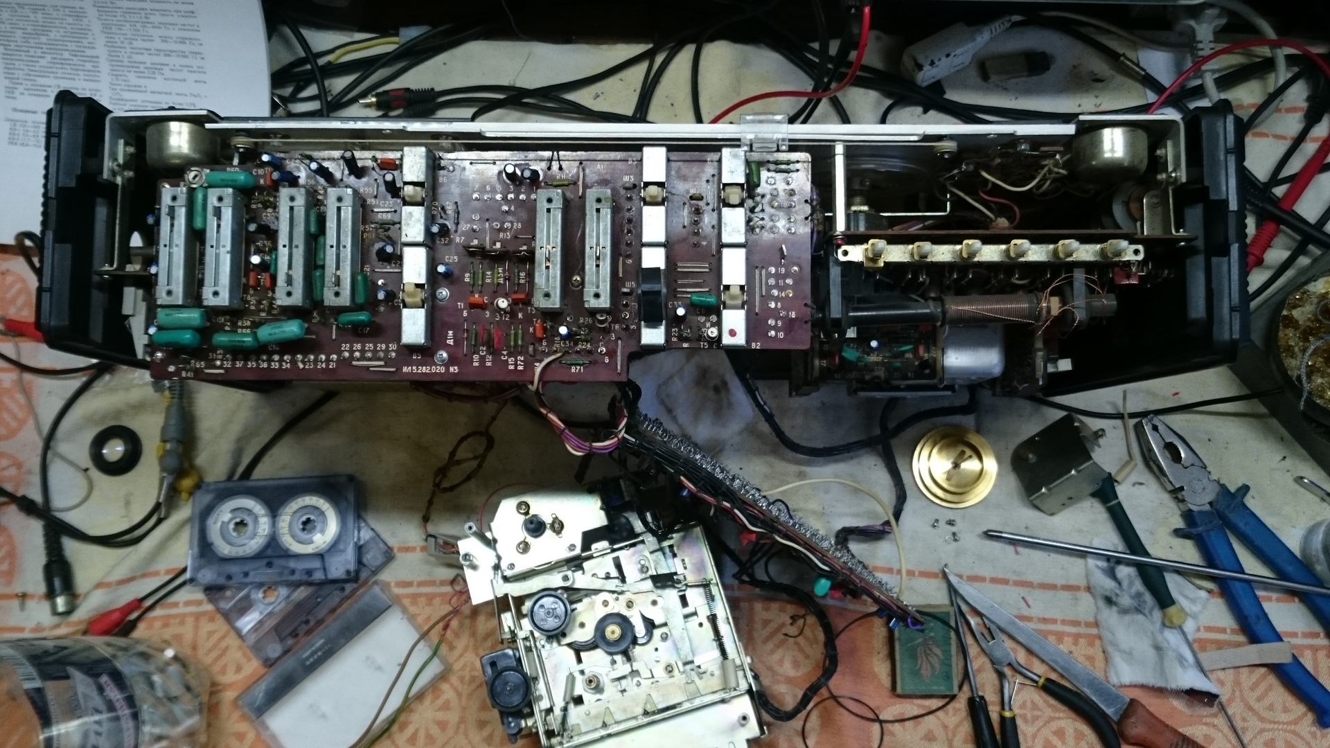 При полном всестороннем восстановлении такой машины, обычно подлежат замене не только банально пассики, ролики и головки (если изношены), но и многие конденсаторы, особенно в звуковых трактах: УП, УМ, УВ, УЗ. Обязательны к замене также конденсаторы в кроссоверах, причём, в них лучше менять с электролитических на плёночные. С запасом по параметрам, установленные новые кондёры (проверенного качества) вдохнут совершенно новую жизнь и былой сочный звук в старые подубитые развалюхи с иностранных аукционов.  :)