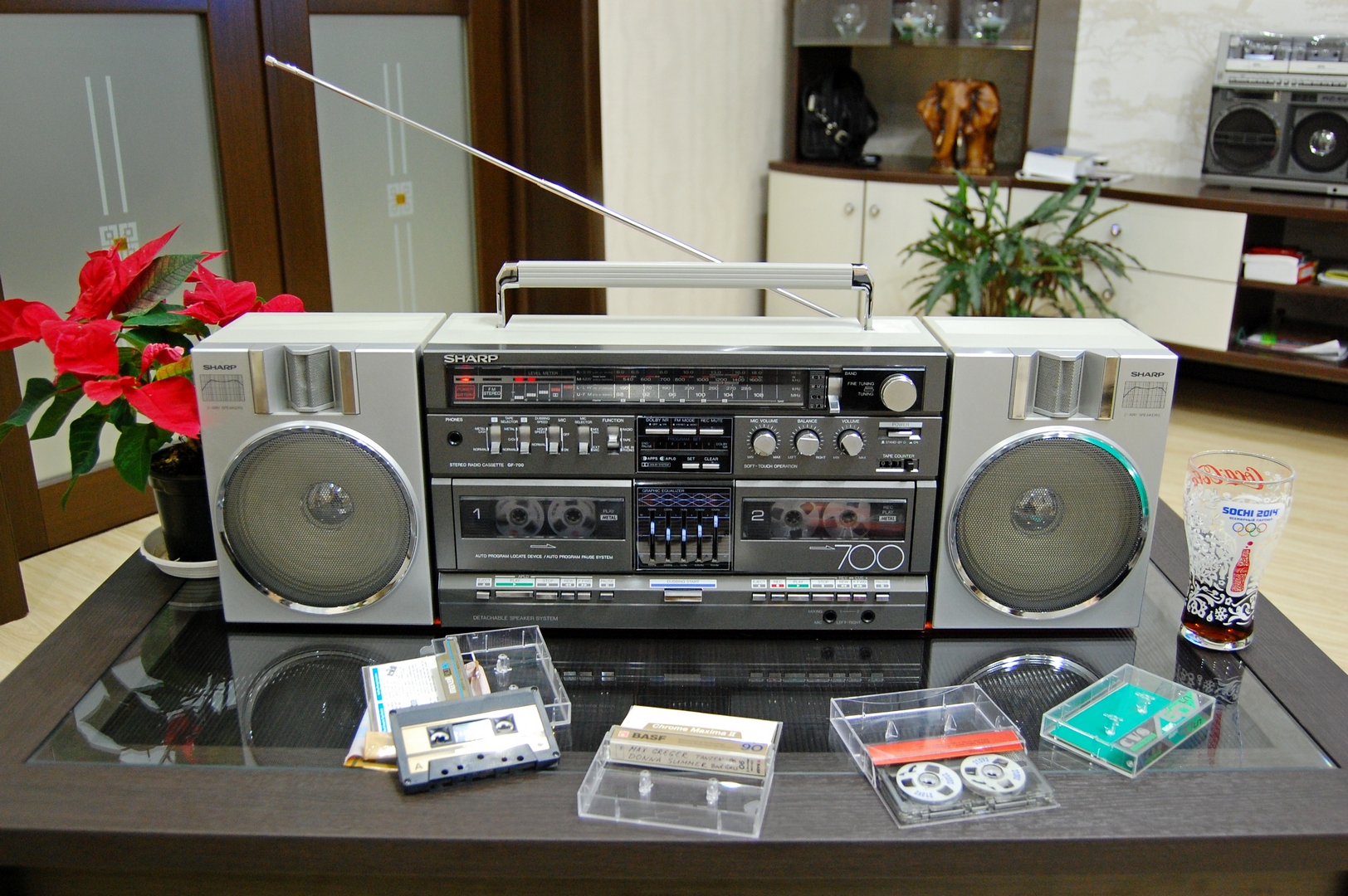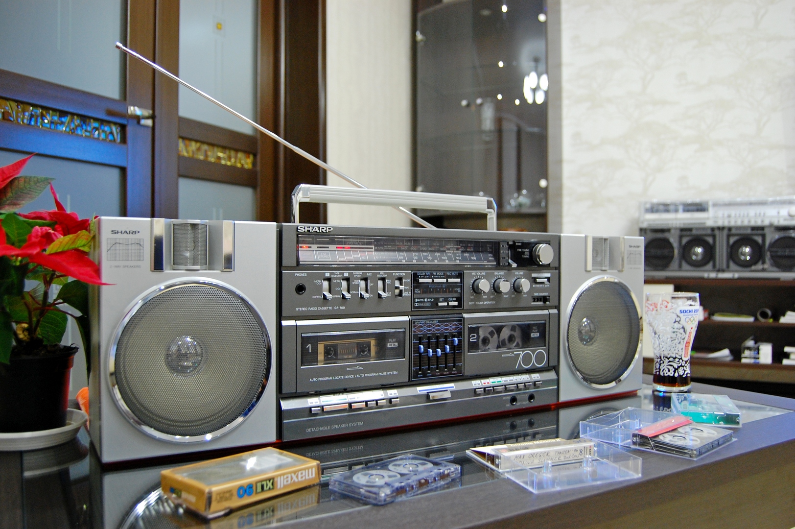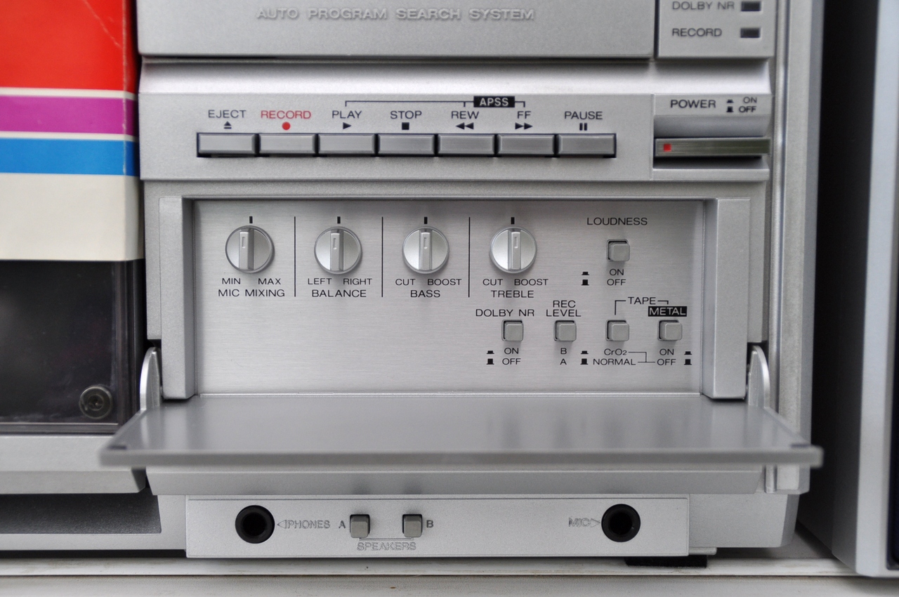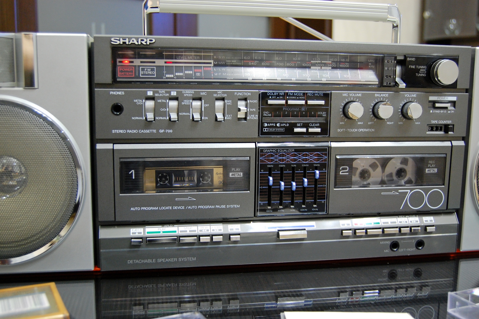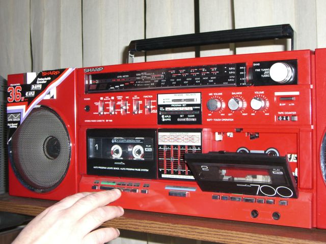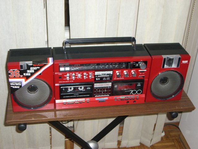 пожалуй, самая продвинутая модель по ЛПМ из аппаратов Шарп с отстёгивающимися колонками в ряду 1982 года. Частотка на металле по паспорту до 17000 Гц, что очень неплохо для портатива. Опыт наших измерений показывает, что по стандарту МЭК реальная частотка АЧХ записи-воспроизведения у шарпов топ класса до 15 кГц, дальше сильный спад. Но для портатива и это - "выше крыши". Логическое управление микропроцессором, подсветка некоторых клавиш протяжки, 5 делений сдвоенных индикаторов на оба канала уровня записи и вых. мощности. Кнопки управления ЛПМ выполнены псевдосенсорными (Feather Touch). Срабатывание чёткое, от легкого прикосновения. Приятно пользоваться. Недостаток у модели тоже есть - пьезо пищалки. Были бы нормальные ГДВ, цены бы ему не было. Но играет вполне приятно.
