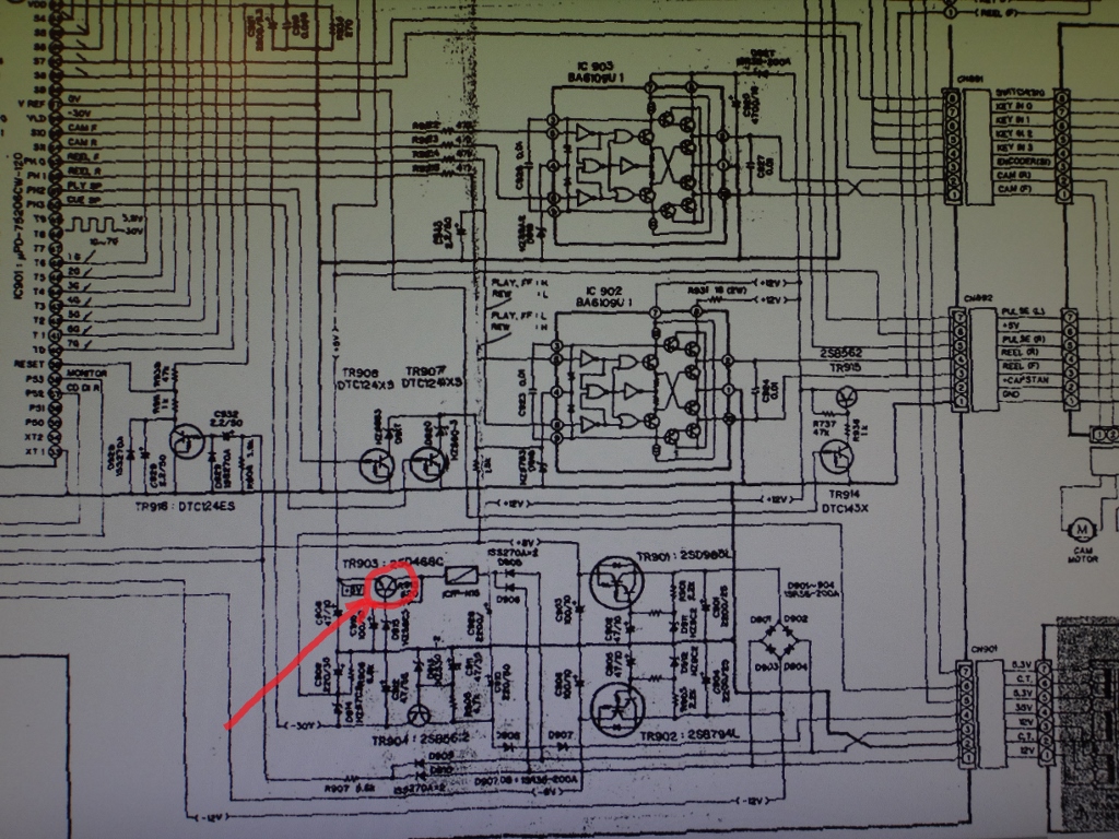 Не надо вылаживать фото по 5-6 мГб! Достаточно до 1. Хрен дождешься открытия.Далее этот кусок схемы ничего не показывает- куда дальше идет +5 вольт и куда нижнее напряжение, что являентся нагрузкой!?Смотрите всю схему, мерить напрягу - сколько , точно ли 5 вольт? Сколько на входе транзюка ну и т д.