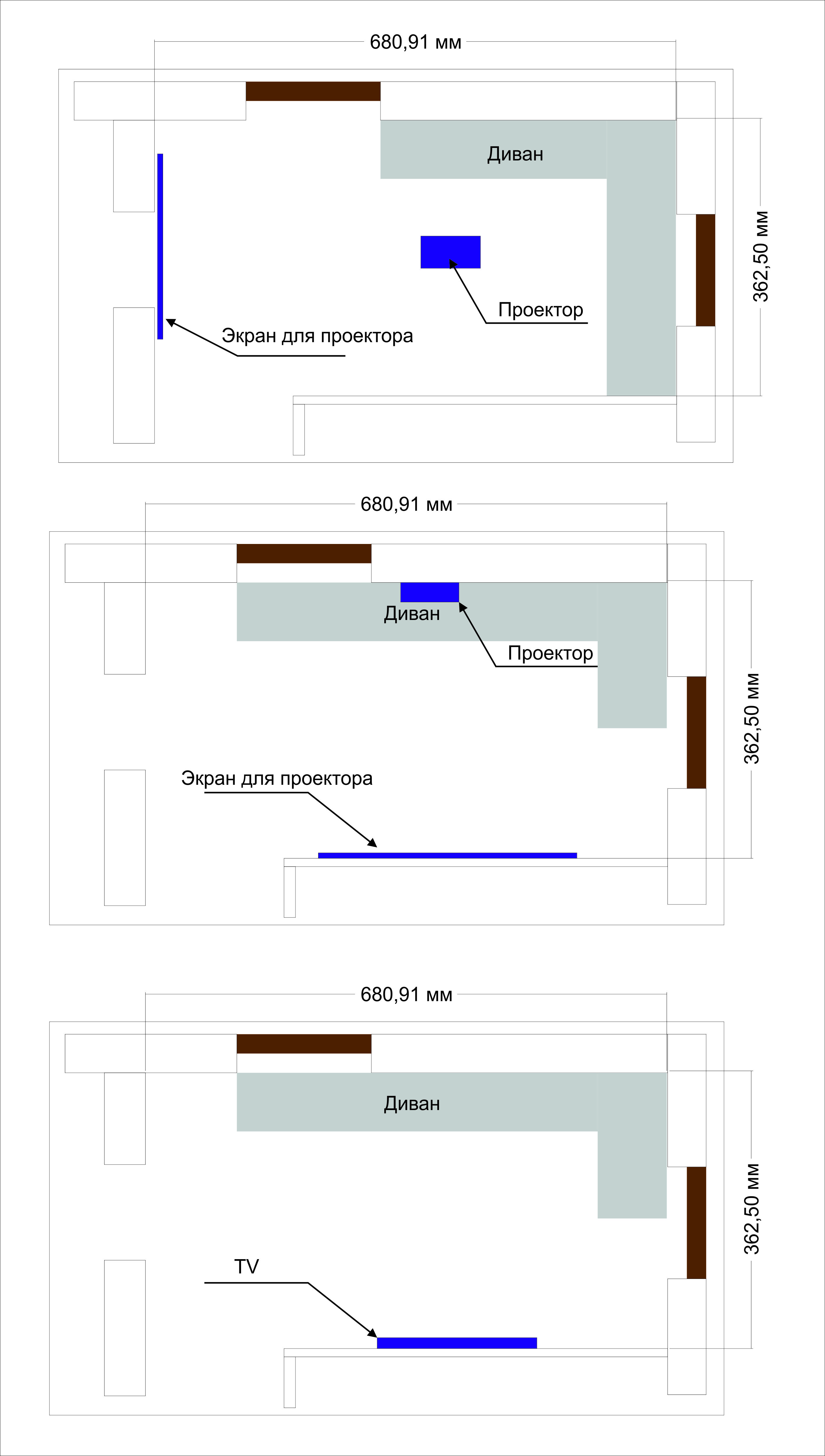 Пока представляю себе 3 варианта размещения. И вообще, может стоит отказаться от телека или проектора и объединить?