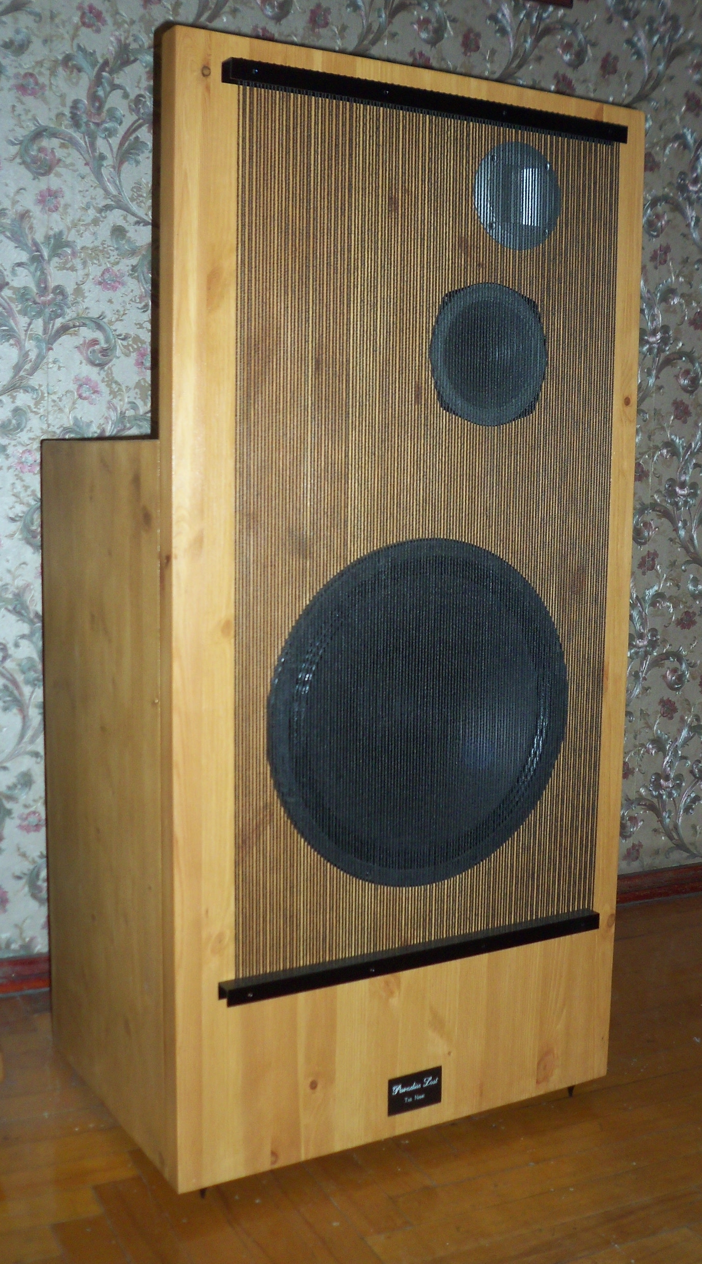 Я переписываюсь с автором похожих работ из Таганрога. Он делает аналогичные "грили" из веревочных тросов, на что я предложил попробовать заменить их на басовые струны, что может придать эффект пространственной объемности звучания по типу реверберации. Когда не было электронных ревербераторов дающих эффект большого помещения, часто использовались струны внутри  корпуса как музыкальных инструментов (гитара Fender Telecaster, к примеру, кроме струн на грифе, имеет струны внутри массива корпуса), так и акустических систем. На фото одна из его работ.
