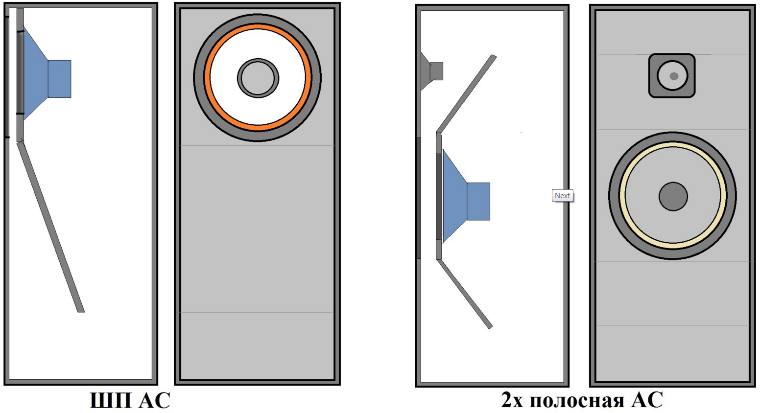 Как вам такая идея: Относительно щита В, поворачиваются два крыла С что в  влияет на совокупную ширину самого щита, а т.ж. ширину просвета А.  Изменение ширины щита дает возможность  подстройки под РЧ динамика, а просвет А, в свою очередь, регулирует плотность воздуха в ограниченном крыльями пространстве, при условии, что закрыть конструкцию сверху, и т.о. работает  как ФИ.