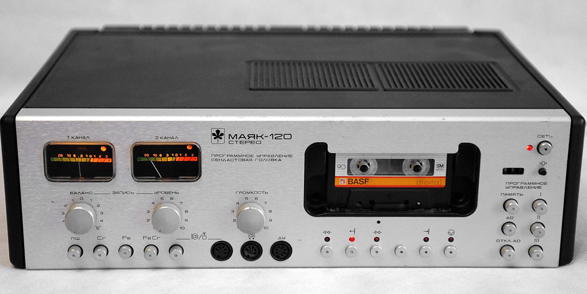 Любимец советских аудиофилов и меломанов – «Маяк-120-стерео», релиз одноименного Киевского завода. Аппарат поддерживал ленты Fe, Cr и FeCr, комплектовался системой шумоподавления, имел электронно-логическое управление, индикацию пиковых уровней сигнала, стрелочные индикаторы уровня и модуль автостопа. Сендастовая головка и качественный ЛМП гарантировали АЧХ 31,5 – 18 000 Гц при коэффициенте детонации в 0,15%. Весил аппарат 8,9 кг.