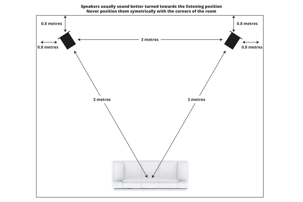 Колонки должны быть расставлены с треугольной ориентировкой так, чтобы из зоны прослушивания владельцу были не видны их боковые грани. Другие варианты установки могут расширить стереобазу, но неизбежно приведут к снижению точности локализации инструментов.