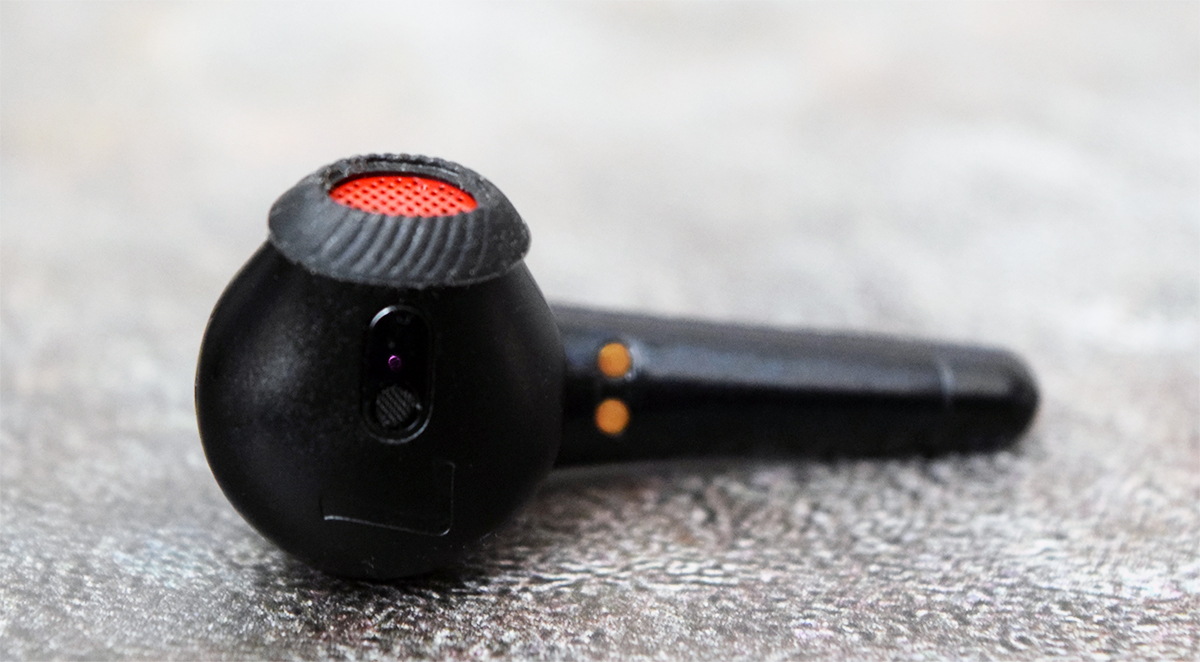 1MORE ComfoBuds True Wireless поставляются с единственной парой несъемных амбушюров, что с учетом их конструкции вполне естественно. Выход из сопла закрыт перфорированной пластинкой красного цвета, служащей не только для защиты динамика от попадания внутрь влаги и пыли, но и выполняющей, вероятно, роль фазовой решетки. Кстати, защита корпусов у модели соответствует стандарту IPX5, что позволяет не бояться попадания на них воды.