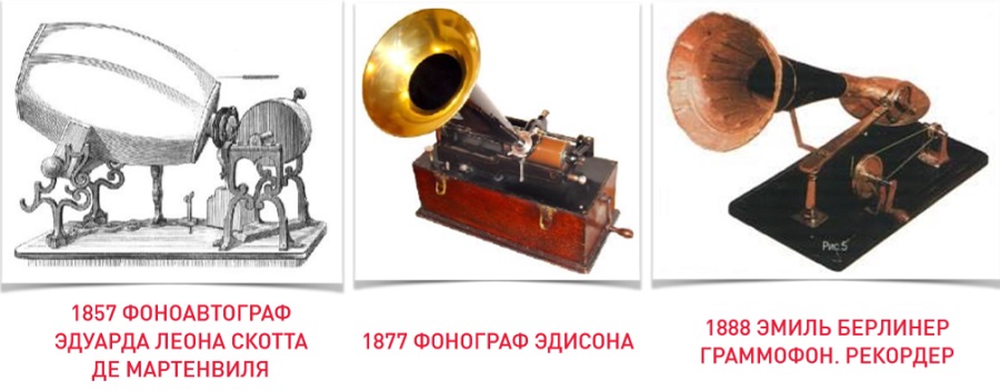 Первый прибор для записи и воспроизведения звука фиксировал звуковые колебания на носителе в форме дорожки, глубина которой была пропорциональна громкости. Звуковая дорожка здесь наносилась на сменный вращающийся барабан по цилиндрической спирали. При воспроизведении фонограммы стальная игла, двигающаяся по канавке, передавала колебания на упругую мембрану, которая и излучала звуковые волны. Чудо тогдашней техники произвело фурор, но слава новинки оказалась недолгой. Валики для фонографа получались слишком хрупкими и не поддавались промышленному тиражированию. А лавры создателя уже полноценного прототипа винилового проигрывателя досталась Эмилю Берлинеру, решившему для записи и воспроизведения звука вместо цилиндров использовать размещаемые горизонтально плоские диски и запатентовавшему 26 сентября 1887 года граммофон. Первая в мире грампластинка была цинковой, носители также пробовали делать из олова, эбонита, а в итоге остановились на шеллаке. Символом звукозаписи тех времен является известная картинка, на которой фокстерьер Ниппер внимательно слушает звучащий из рупора голос хозяина. На ранней версии изображения это рупор фонографа, а позднее композицию переделали, поместив «в кадр» уже граммофон. Впоследствии миниатюра стала логотипом знаменитой звукозаписывающей компании Deutsche Grammophon.