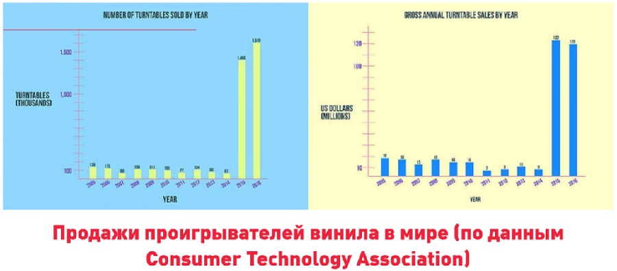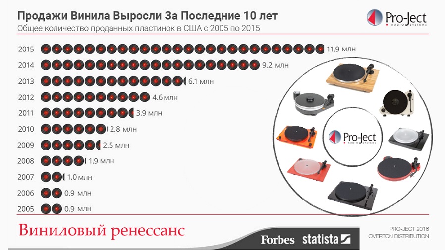Это истории, лежащие на поверхности, внутри же звукозаписывающей индустрии тоже происходит немало интересного. Огромными плюсами цифровых фонограмм являются скорость распространения и глобальная доступность. Готовый файл можно выбросить на рынок практически в течение дня. Но если мы говорим о мире крупнейших рекорд-лейблов, указанное преимущество в скорости для их работы не является решающим. Оформление документов, подписание контрактов, организация рекламных акций в больших проектах занимают от полугода до нескольких лет. Звучащие сейчас на радио «новинки» могли ждать своей очереди в ротацию год-полтора. В этом сложном многоступенчатом процессе запуска хитов вообще не представляет проблемы отпечатать и разослать по планете тираж винила для синхронного старта продаж. И, наконец, отметим технологический фактор. В мире существует огромное количество великолепных проигрывателей грампластинок разных лет выпуска, занимающих у любителей музыки почетное место в стойках с аппаратурой. Но сегодня, задействовав ранее недоступные ноу-хау из, например, военной промышленности или медицинского приборостроения, можно изготовить отличную вертушку без удручающего ценника. Модели категории Hi-Fi сделались бюджетными, а значит и общедоступными. На графике продаж грампластинок мы наблюдаем спокойный плавный рост, но сами аппараты последние пару лет демонстрируют просто взрыв популярности — речь идет об увеличении спроса на тысячи процентов. Если считать в штуках, то в 2015 году было реализовано около 1,4 млн. новых проигрывателей грампластинок, на текущий год прогноз составляет порядка 1,8 млн. устройств.