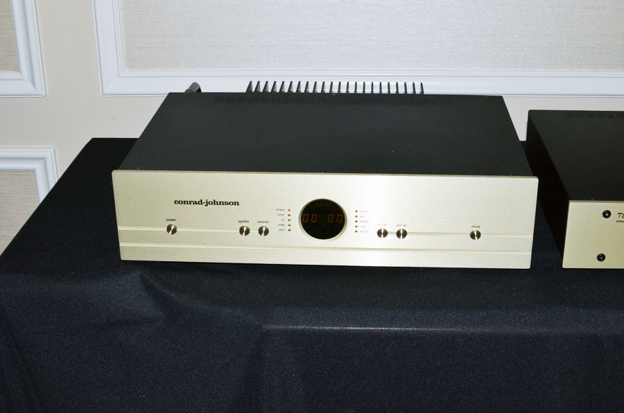 Компания демонстрировала свой control amplifier (фирменное название интегрированного усилителя) Conrad-Johnson CA150, выдающего 135 Вт на канал и имеющего 7 входов. Кроме того, у этой модели есть еще «версия на стероидах» с приставкой SE (+ $2000), в которой использованы комплектующие еще более высокого уровня – тефлоновые конденсаторы CJD, а также пленочные резисторы Vishay и Caddock.