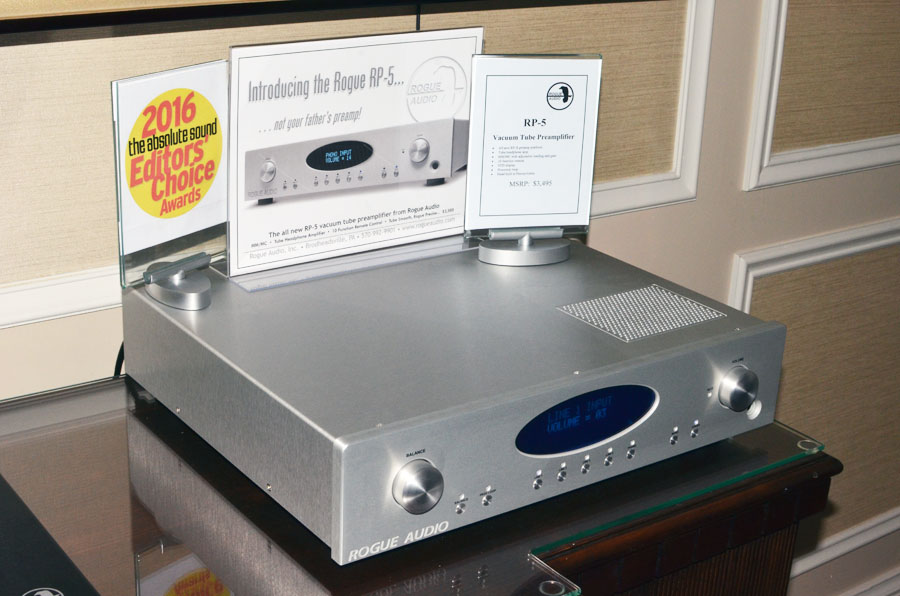 На выставке компания Rogue Audio демонстрировала свои самые свежие компоненты – предварительные усилители RP-5 (на фото) и RP-1, построенные на базе новой платформы RP-X. Первый (RP-5) базируется на лампах 12AU7/ECC82, имеет MM/MC-фонокорректор, а также усилитель для наушников с ламповым каскадом и вход для домашнего кинотеатра. Rogue Audio RP-1 похож по конфигурации, использует те же лампы, но выходной каскад для наушников у него транзисторный, зато на передней панели красуется шикарный OLED-дисплей.
