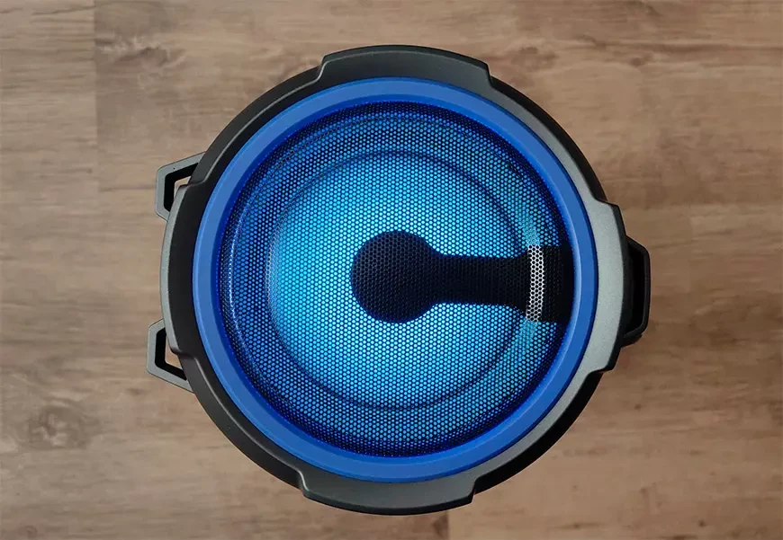 Мощности усилителя для низкочастотной секции вполне хватило бы для установки двух полноценных динамиков, кстати, многие «дуйеры» (от DIY или Do It Yourself) именно так и поступают. В базовой же комплектации один басовик работает за себя и за того парня (а именно за пассивный излучатель), выдавая вполне приличный мидбас. Подсветка направлена в сторону от слушателя и создает атмосферу дискотеки без дискомфорта для глаз, те же, кто не любит цветомузыку, могут её вообще отключить. Да, высокочастотные динамики немного не добивают до 20 кГц, но это не самое главное. Гораздо важнее правильная настройка звучания без перекоса в сторону той или иной части частотного диапазона, а с этим у бумбокса всё в порядке. При этом колонка умеет создавать достаточный объём, хорошие стереофонические записи воспринимаются именно таковыми – мальчики налево, девочки направо, и ещё что-то по центру.