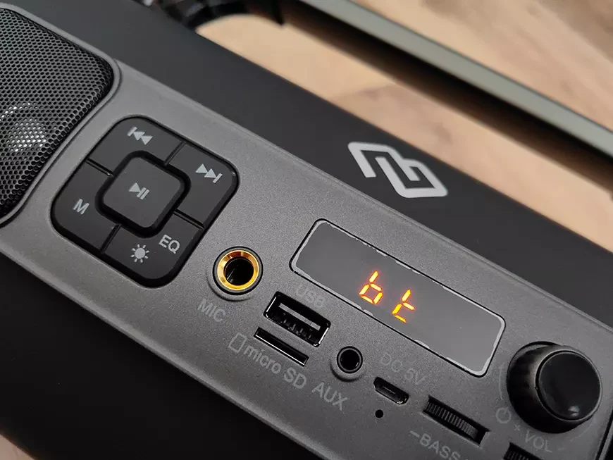 Расположенная между ВЧ-динамики панель несёт на себе все органы управления и разъёмы, а также небольшой ЖК-дисплей. В левой части находятся сгруппированные клавиши запуска и остановки воспроизведения, клавиши переключения треков и радиостанций, клавиша управления эквалайзером и подсветкой, а также переключатель источников сигнала. Физические разъёмы включают порт USB-A для подключения флешек, слот для карт памяти формата microSD, разъём microUSB для подключения сетевого адаптера, вход на разъёме джек 6,35 мм для подключения микрофона и вход на разъёме миниджек 3,5 мм для проводного подключения портативных гаджетов. Ближе к правому твитеру расположились регулятор тембра по НЧ, общий регулятор громкости и колесико настройки эффекта эхо для микрофона.