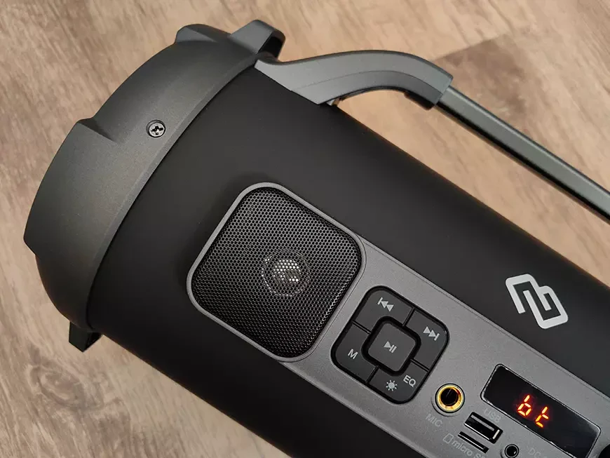 Начнем с тактильных ощущений. При габаритах 390 х 180 х 210 мм весит колонка 2,6 кг, что не так и мало для бюджетного бумбокса. Вкупе с цилиндрической формой корпуса это даёт надежду на то, что динамики получили надежную механическую платформу и могут дышать полной грудью.