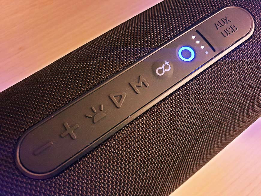 Все органы управления находятся на верхней панели корпуса и закрыты резиновой накладкой с рельефными клавишами, перепутать которые сложно даже в темноте при их нажатии наощупь. Клавиша питания утоплена внутрь и подсвечивается синим цветом при включении. Рядом с ней расположен вертикальный ряд белых светодиодных индикаторов, показывающих уровень заряда встроенной литий-ионной батареи. Она имеет ёмкость 3 000 мАч и обеспечивает до 6 часов работы на средней громкости и с отключенной подсветкой. Полный цикл заряда аккумулятора занимает менее трёх часов, сетевой адаптер в комплект не входит, поэтому рекомендуется использовать сторонний трансформатор на 5В. Ушки для крепления ремня для переноски сделаны из металла и выглядят весьма надежно.