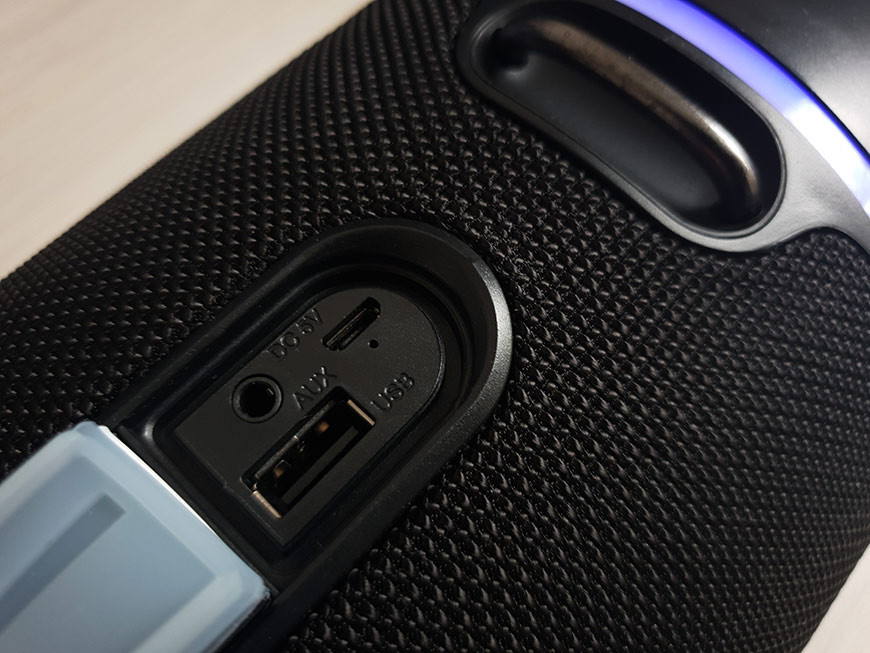 Коммутационный блок с физическими разъемами скрыт под накладкой с надписью AUX USB, отогнув которую вы получаете доступ к портам micro USB и USB-A, а также гнезду миниджек 3,5 мм для подключения внешних проигрывателей. Порт USB-A можно использовать для внешних накопителей, встроенный плеер поддерживает воспроизведение аудиофайлов в форматах mp3, amr, wav, wma, flac, ape. Светодиодная подсветка синего цвета включается и отключается нажатием на клавишу в форме восходящего солнца.