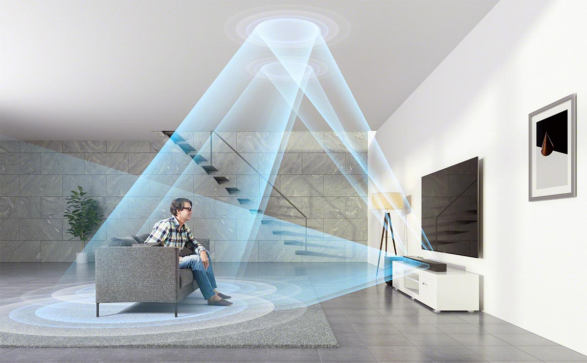 В саундбарах при реализации верхних каналов также используется отражение звуковых волн от потолка. Причем, для саундбара это изначально штатный приём – ещё до появления трехмерных звуковых форматов виртуальное окружающее звучание достигалось за счет отражений звука от стен помещения. В саундбарах, поддерживающих Долби Атмос, часть излучателей направлены вверх, повышая вертикальное разрешение звуковой картины. Наиболее эффективны в создании трехмерного звукового поля так называемые звуковые проекторы – саундбары с несколькими десятками динамиков, каждый из которых управляется отдельным усилителем, а информацию для такого массива излучателей готовит специальный аудиопроцессор. В помещении правильной конфигурации со стенами и потолком, имеющими необходимые отражающие свойства, такому саундбару вполне по силам заменить систему окружающего звучания конфигурации 7.1.2. При этом, саундбар не только намного проще в инсталляции и настройке, а также более органично впишется в жилой интерьер, но и, скорее всего, окажется ощутимо дешевле.