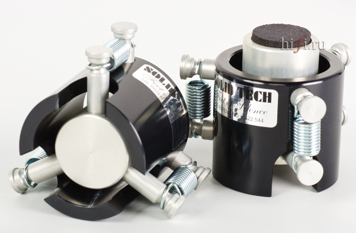Во главе данного направления стоял инженер-конструктор Бьерн Ольсон. Будучи еще и завзятым аудиофилом, он лучше многих других разбирался в проблеме резонансов и вибраций, негативно сказывающихся на звучании хорошей техники. Поэтому он тщательно штудировал теорию, проводил практические исследования и, подведя результаты к общему знаменателю, приступил к созданию всевозможных механических изоляторов и уникальных стоек под любую аудио- и видеоаппаратуру. Сегодня мы познакомимся с малогабаритными приспособлениями, призванными максимально гасить вибрации любых звуковых компонентов, будь то проигрыватель грампластинок, CD-плеер или усилитель. Известно, что для таких целей давно существуют различные монолитные конусы и подкладки для них, но Solid Tech предложила несколько иные, усложненные варианты изоляторов (антирезонаторов), которые дают наилучший эффект в борьбе за чистоту звука, его глубину, разрешение и влияют на массу других объективных и субъективных показателей.