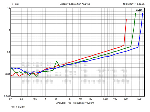 Измерения сделаны как для комплекта Cary Audio SPL 05 + SA-200.2, так и отдельно для усилителя мощности. На графике (рис. 1) виден вклад в результирующую амплитудно-частотную характеристику (красный граф), вносимый предварительным усилителем Cary Auio SPL 05. Оранжевый граф — практически линейная в звуковом спектре частот характеристика усилителя мощности Cary Audio SA-200.2 с незначительным спадом в 0,7 дБ на отметке 80 Гц. Заметны и привносимые нелинейные искажения. Их коэффициент для всех рабочих мощностей и широкого спектра частот у SA-200.2 не превышает 0,005%. Для пары он на порядок больше, и на половине максимальной мощности на 1 кГц дает 0,15% (рис. 2). Выходной каскад характеризуется высоким коэффициентом демпфирования (330) и обеспечивает на 2 Ом до 525 Вт неискаженной мощности. Взаимопроникновение между каналами обнаруживается только у предусилителя, пересекая на высоких частотах планку в 60 дБ (рис. 3).