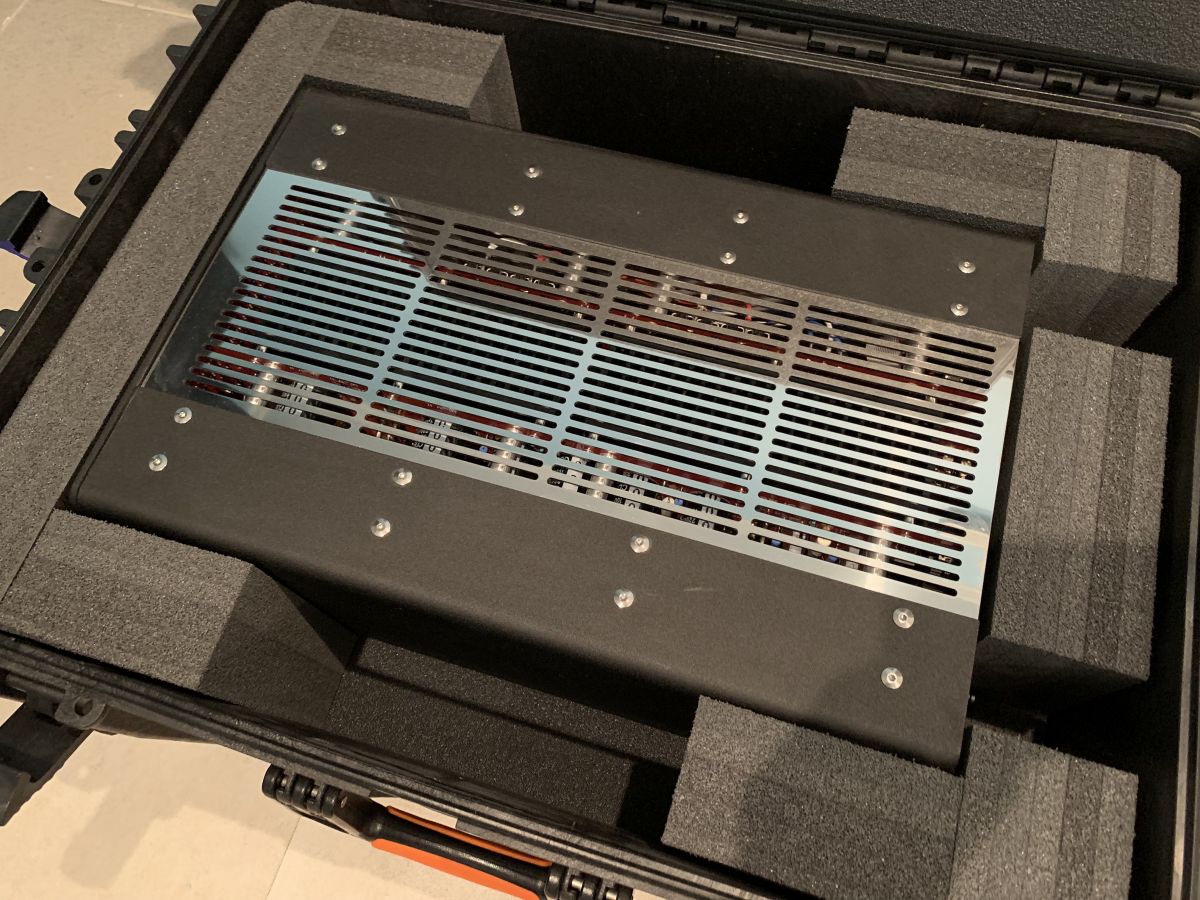 Grandinote Shinai поставляется в огромном пластиковом чемодане flight case. Аппарат заботливо упакован – за сохранность во время перевозки можно не волноваться. А вот для извлечения его из ящика придется кого-либо позвать – одному человеку вытащить эти 40 кг. плотно прижатые к демпфирующему материалу проблематично. Внешний вид устройства вызывает неоднозначные чувства. С одной стороны, сам корпус, зеркальная задняя панель и скругленные формы весьма солидны. С другой – дизайн передней панели, скажем так, на любителя, а пластиковые клавиши управления не дотягивают до статуса усилителя.