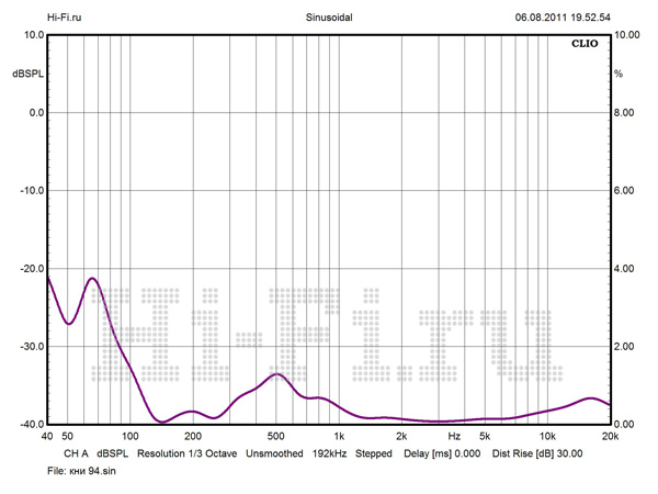 Амплитудно-частотная характеристика акустической системы KEF Q300 (рис. 1) выявляет участок высокой стабильности звукового давления, который приходится на область наиболее различимых слуховым аппаратом частот и охватывает 3 октавы, начинаясь с верхнего баса и заканчиваясь в верхней части среднечастотного диапазона. Далее стабильный ход характеристики нарушается, и благодаря этому средний показатель неравномерности для диапазона СЧ — ВЧ составляет 2,5 дБ. Полочники уверенно чувствуют себя в низкочастотной области. Нижняя граничная частота по уровню –10 дБ определяется в районе 36 Гц. Уровень нелинейных искажений при низком и среднем значении звукового давления в этой области не превышает порога слышимости (рис. 3, для 88 dBSPL на 1 м). Средний показатель КНИ в большей полосе звуковых частот равен 0,42%. Нестабильное поведение модуля импеданса у KEF Q300 не обнаруживает опасных минимумов (рис. 2).