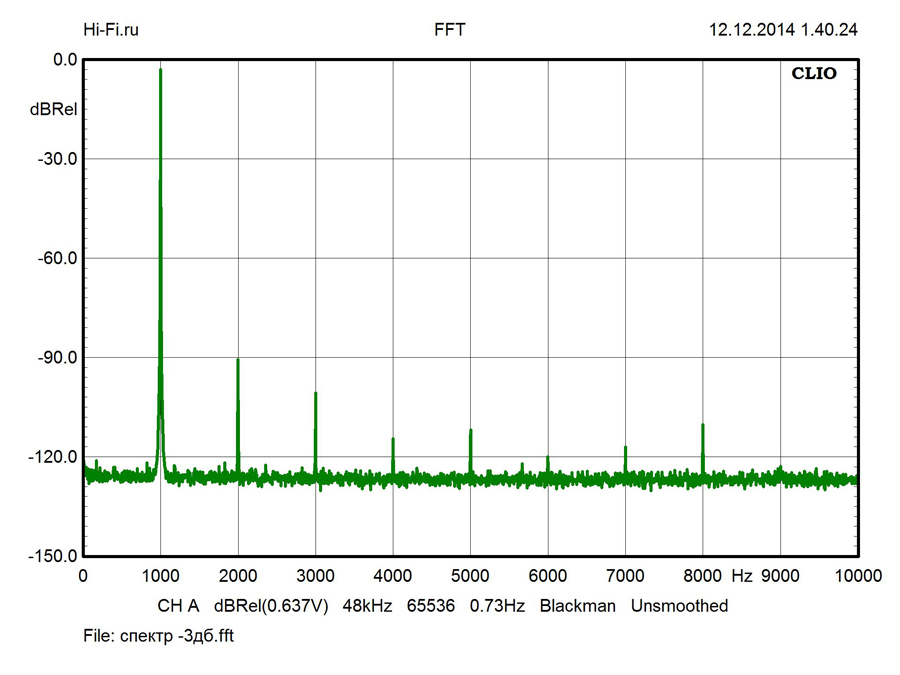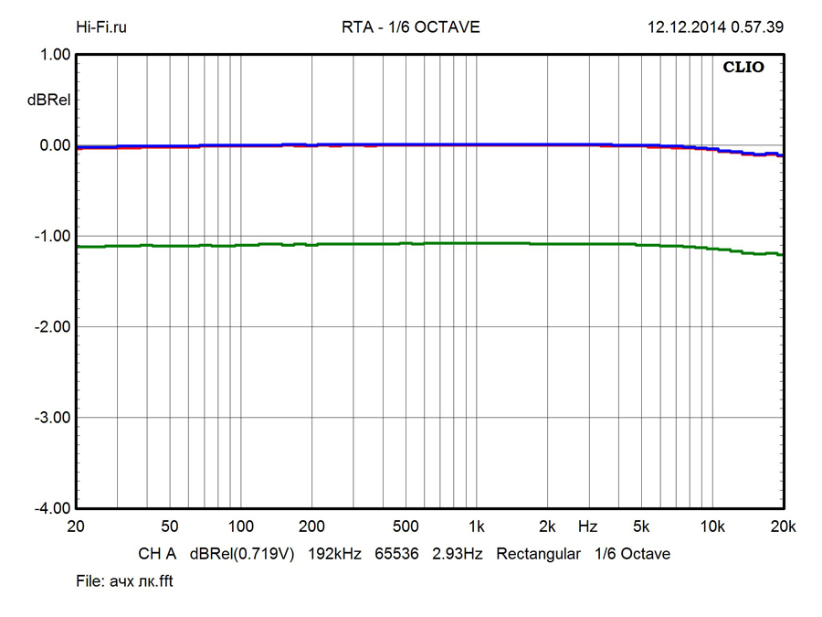 Новая модель смартфона от компании Apple демонстрирует отличные характеристики аудиотракта. Высокий уровень сигнала, достигающий 1 вольта, вкупе со стабильным и низким (4 Ом) сопротивлением на выходе позволит «прокачать» любые наушники. На нагрузку сопротивлением 300 Ом iPhone 6 Plus отдает до 3,4 мВт мощности. Для низкоомной гарнитуры (30 Ом) этот показатель достигает 27 мВт. Указанные значения кажутся нам даже избыточными и уровень сигнала при высокой чувствительности наушников может быть опасен для слуха, о чем нас и предупреждает производитель. Рекомендуем прислушаться к его советам. Неравномерность АЧХ в полосе звуковых частот при любой комбинации нагрузок и громкостей сохраняется стабильно низкой (0,12 дБ). Поканальные графы практически сливаются в единое целое – разбаланс каналов не превышает 0,01 дБ (рис. 1, красная и синяя кривые). Проникновение сигнала между ними составляет не более -70 дБ на высоких частотах (10 кГц). Частотный спектр минимально окрашен продуктами нелинейных и интермодуляционных искажений. КНИ для сигнала частотой 1 кГц составляет всего 0,003% (рис. 2). Разностная составляющая комбинации частот 19 и 20 кГц - 0,017% (рис. 3).