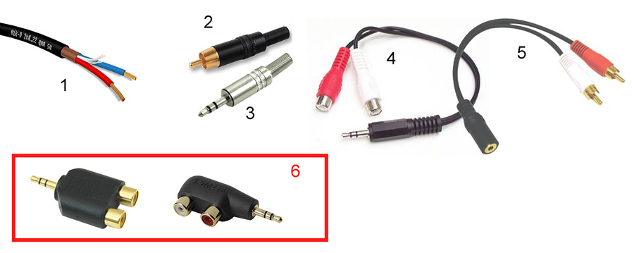 Если источник сигнала располагается в пределах тумбы под ТВ, то на передние и центральную колонки, а также расположенный близ ТВ сабвуфер, можно пустить сигнал через недорогие кабели – купленные в любом супермаркете, а то и вовсе из комплекта поставки колонок. На тыловую пару в любом случае надо вести трассу более качественным проводом - микрофонным, типа «два проводника в экране» (№1 на иллюстрации выше). Дело в том, что до задних колонок пойдет низкоуровневый (слаботочный) стереосигнал, на пути 5-10 метров он «насобирает» множество помех и наводок, что обернется шумами, тресками и гулом в динамиках. Спасение – в хорошем проводе. Такой продается в любом магазине профессиональной аппаратуры, стоит около 1 доллара за метр. Подойдет практически любой, переплачивать смысла нет. Для моносигнала (т.е. отдельно для центральной колонки и отдельно для сабвуфера) можно использовать так называемый инструментальный провод – своей конструкцией он напоминает микрофонный, только под экраном один проводник. Продается в тех же магазинах профессионального оборудования, но стоит чуть дешевле микрофонного. Затеваться с созданием кабелей на базе «профессионального» провода имеет смысл только в том случае, если от выхода источника до входа колонки более 3 метров. Для получения кабеля нужной конфигурации пользуйтесь разъемами под пайку (№2 и 3) и/или соответствующими переходниками (№4 и 5). От использования жестких переходников (№6) лучше воздержаться по целому ряду причин.