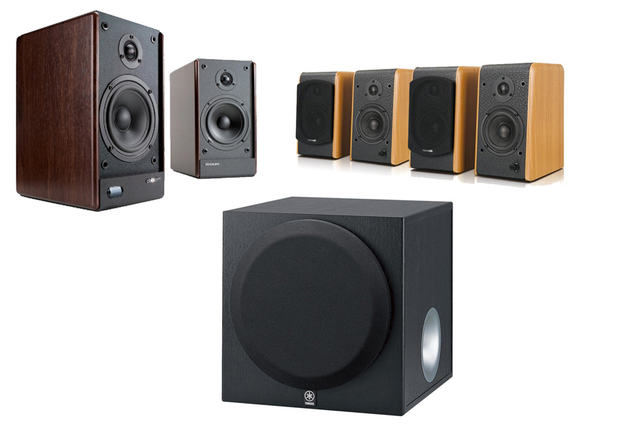 2. Колонки Microlab Solo-5С на фронт, Microlsb B-77 на центр и тыл (т.е. всего потребуется две пары B-77), сабвуфер Yamaha YST-SW012. Цена комплекта – около 21 000 руб. Если в системе не будет центрального спикера (причины и условия см. в п.1), то фронтальная пара должна быть Microlab Solo-6С. Соотношение цены, качества звучания и мощности у Microlab чуть хуже, но оно тоже очень и очень привлекательное. Как и в случае со Sven. колонки Microlab выпускаются в нескольких цветовых вариациях.