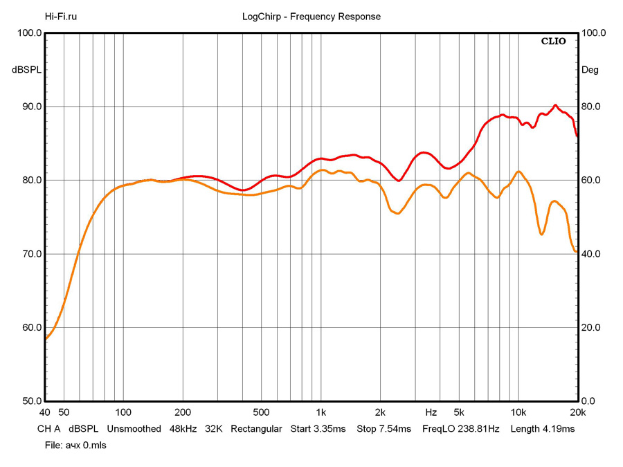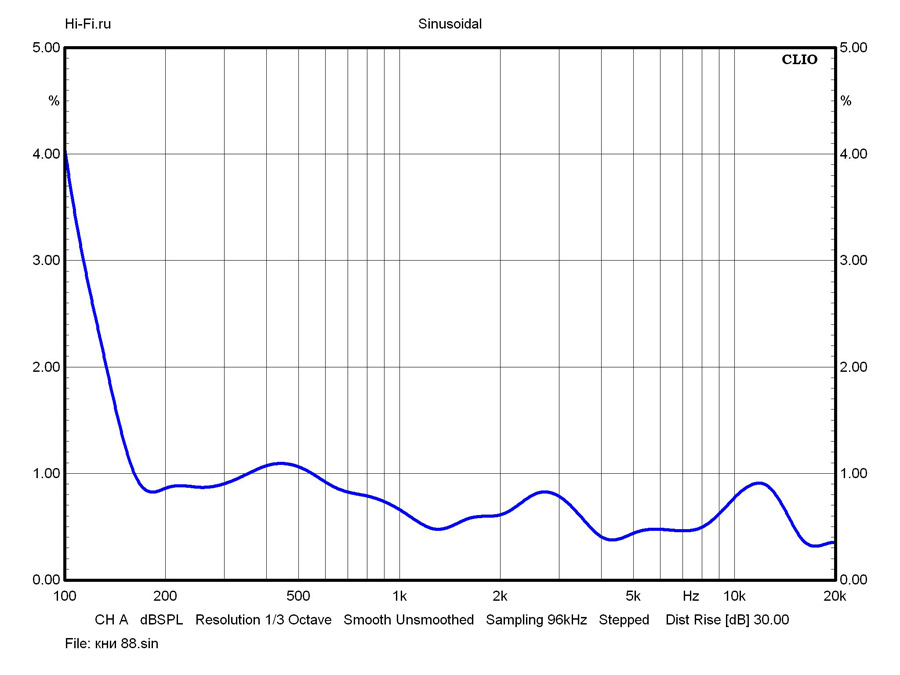 Поведение графика амплитудно-частотной характеристики музыкального центра Pioneer X-CM32BT в широкой полосе частот (примерно до 2 кГц) вполне стабильно. Неравномерность здесь не превышает +\- 1,8 дБ. В высокочастотной области показатель ухудшается, а граф демонстрирует положительный дисбаланс. Впрочем, последний артефакт легко устраним правильным позиционированием АС относительно слушателя или коррекцией с помощью темброблока. Нижняя граничная частота составила 62 Гц (по уровню -10 дБ) – достойный результат для столь компактных акустических систем. Правда, прирост нелинейных искажений в басовой области будет накладывать серьезные ограничения на этот показатель с увеличением громкости воспроизводимого сигнала. Так, при звуковом давлении 88 дБ, начало рабочей полосы сигнала следует отсчитывать с отметки не ниже 100 Гц (рис. 2).