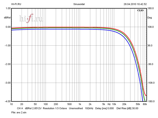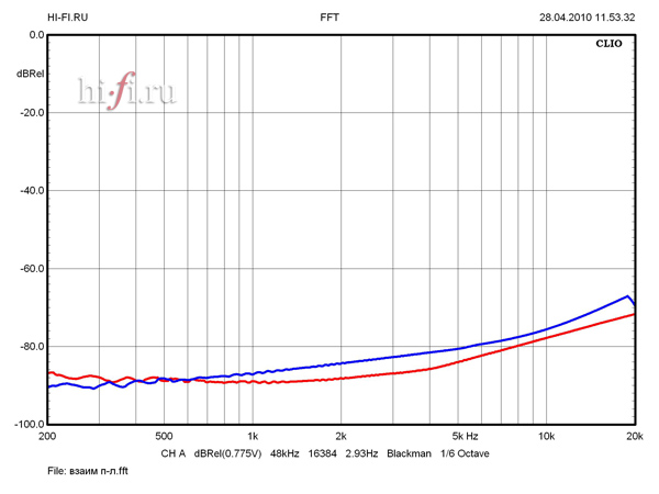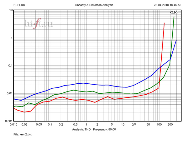 Неравномерность АЧХ не вызывает нареканий (0,35 дБ). На частотах выше 20 кГц заметен спад, и уровень - 3дБ зафиксирован на 67 кГц. (рис. 1) Усилитель без проблем справляется с низкоомными нагрузками, отдавая на 2 Ом до 280 Вт. Низкое выходное сопротивление 0,03 Ом стабильно удерживается вплоть до ВЧ-диапазона и незначительно увеличивается до 0,05 Ом на 20 кГц, что никак не может отразить на линейности АЧХ при любых разумных нагрузках. КНИ не превышает 0,007% при малых и средних мощностях и преодолевает планку 0,01% при выходной мощности, превышающей 50 Вт. В ВЧ-диапазоне искажения несколько выше, но не превышают 0,03% при любых значениях рабочих мощностей. На нагрузке 2 Ом при любом значении выходной мощности КНИ может незначительно превысить уровень в 0,02% на средних частотах (рис. 2). Взаимопроникновение между каналами имеет несущественные значения. Ослабление сигнала на частоте 10 кГц не менее 75 дБ. (рис. 3)