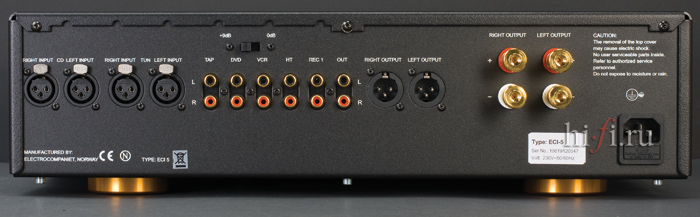 В полумраке усилитель Electrocompaniet ECI 5 выглядит таинственно, завораживающе и обладает некоей гипнотической силой, поэтому можно долго смотреть на него, впитывая эту эзотерическую энергию. Подсветка не режет глаз и не отвлекает, а как бы специально сопровождает музыкальный ряд. Передняя накладка из темного полированного стекла служит лишь панелью для пяти круглых позолоченных кнопочек. Еще на нее нанесен логотип компании, окруженный светящимся ореолом, который создается вращающимся внутри при регулировке громкости голубым светодиодом. Слева высвечиваются крошечные буквенные символы, указывающие на тот или иной выбранный селектором линейный вход. Полная визуальная идиллия и дизайнерская завершенность. Две входные и одна выходная пара разъемов балансного типа (XLR), украшающие заднюю стенку корпуса, говорят о серьезности ECI 5. Собственно, прибор имеет полностью балансную схемотехнику, поэтому присутствие симметричной коммутации более чем уместно. К своему удивлению, мы не увидели здесь знакомой винтовой клеммы для земляной жилы проигрывателя грампластинок — производитель, возможно, считает более верным воспользоваться внешним фонокорректором, тем более что Electrocompaniet готова его предложить. Дополнительно можно использовать еще четыре пары обычных небалансных разъемов RCA. А если и этого окажется мало, то в комплекте есть пара специальных переходников XLR-RCA.