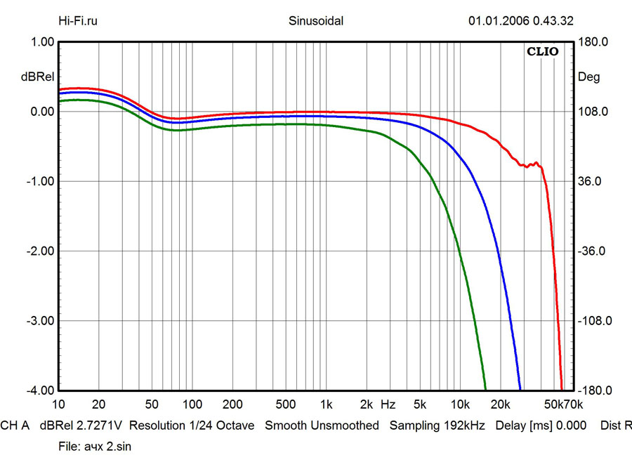 При измерениях аудиосистемы Cyrus Lyric тестовые сигналы подавались на аналоговый вход устройства. В этом случае ширина полосы пропускания ограничена на отметке 54 кГц. На графике частотных искажений (рис. 1) хорошо заметна чувствительность звукового тракта к импедансу нагрузки. При балласте менее 6 Ом спад графика в высокочастотной области принимает критический характер (зеленый граф для 2-х Ом, синий – 4 Ом). Коэффициент демпфирования усилителей составляет 185 единиц. Переходное затухание между каналами - не менее 62 дБ на 10 кГц. Усилительный тракт обеспечивает выходную мощность до 185 Вт (8 Ом). Показатель нелинейных искажений сохраняется в пределах 0,01% в большей части звукового диапазона (на рис. 2 КНИ для 1 кГц, 8 Ом).